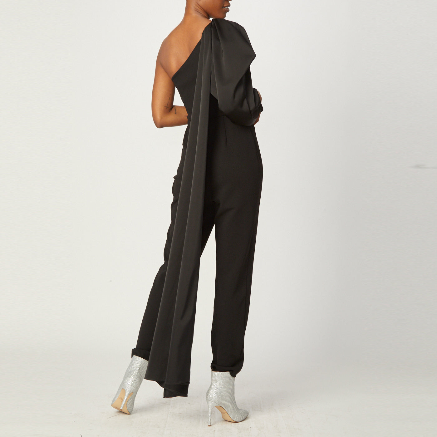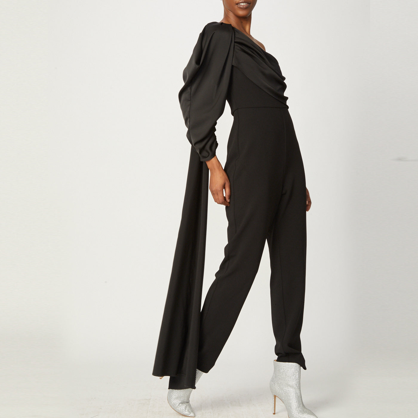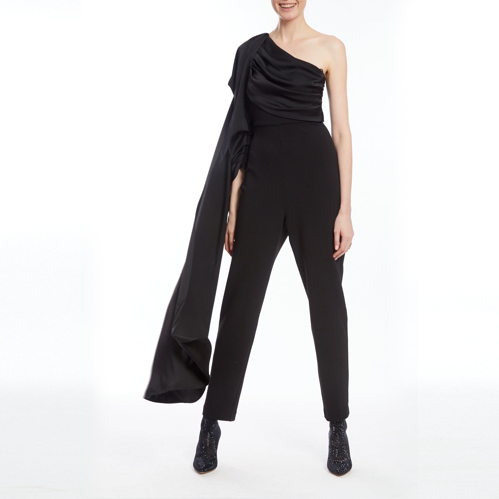 Black Stretch Crepe One Shoulder Neckline Jumpsuit