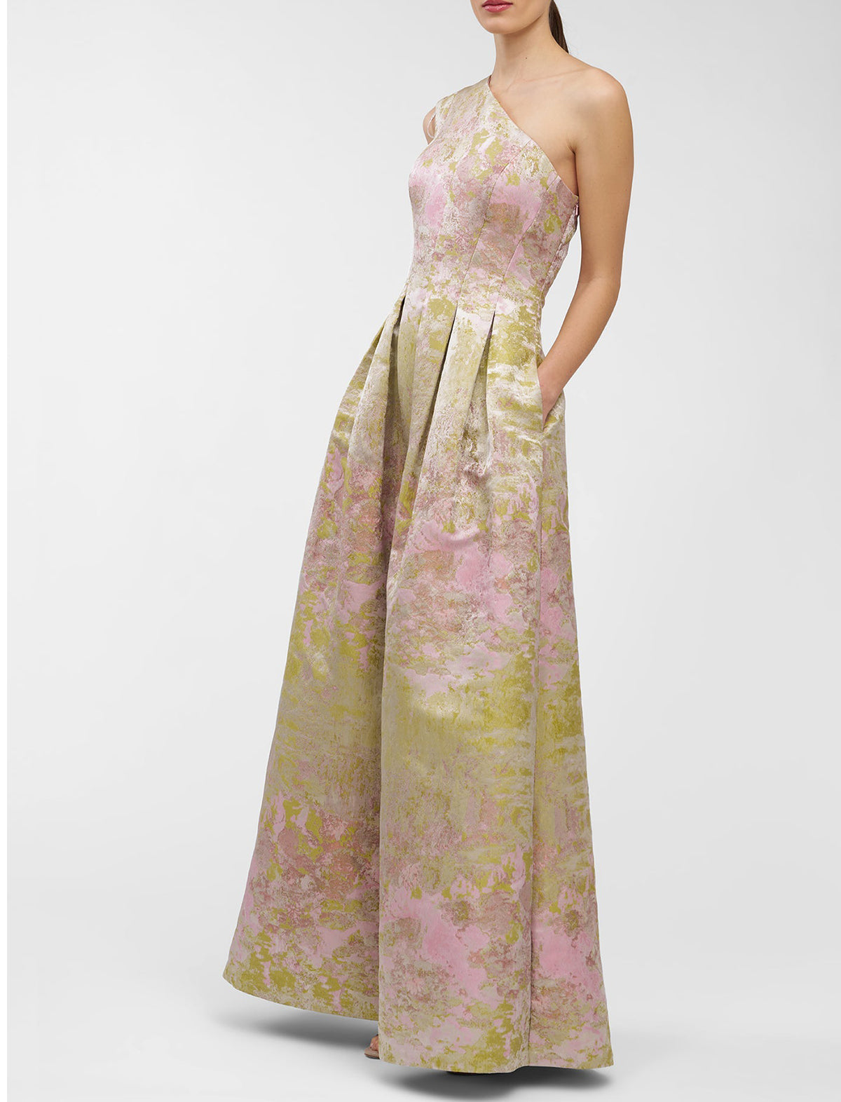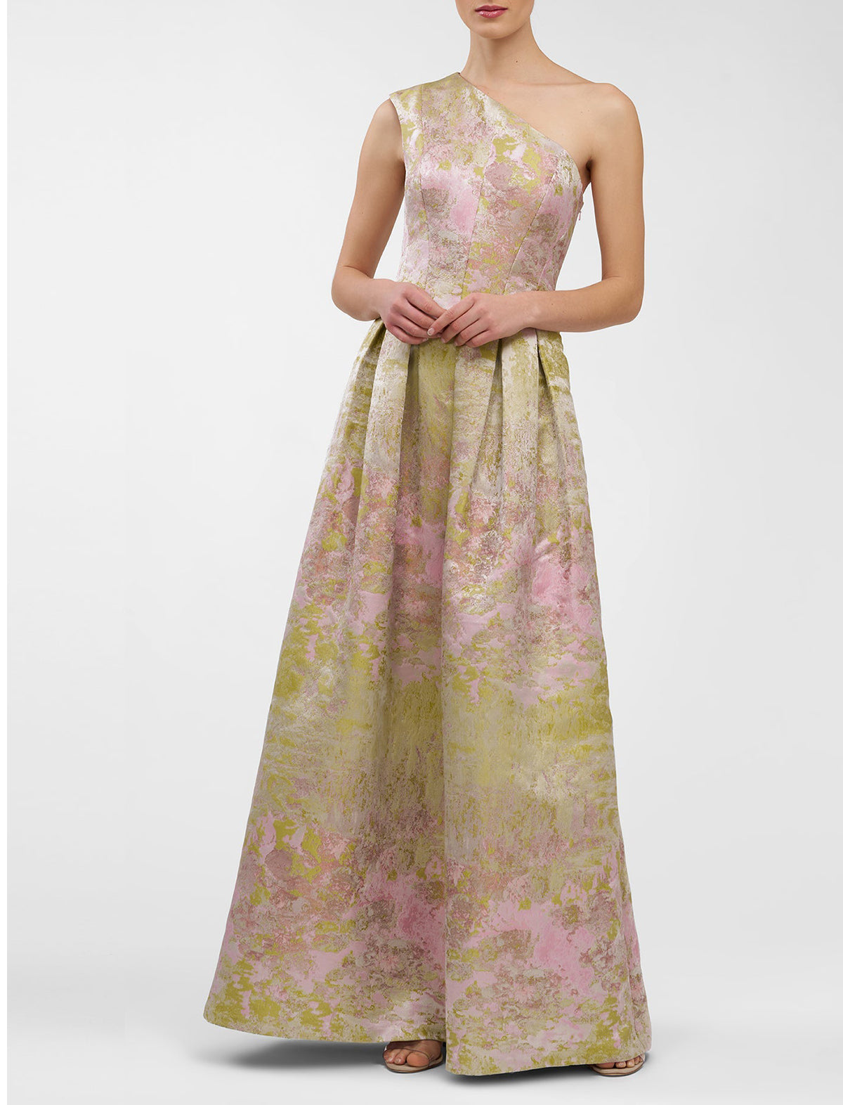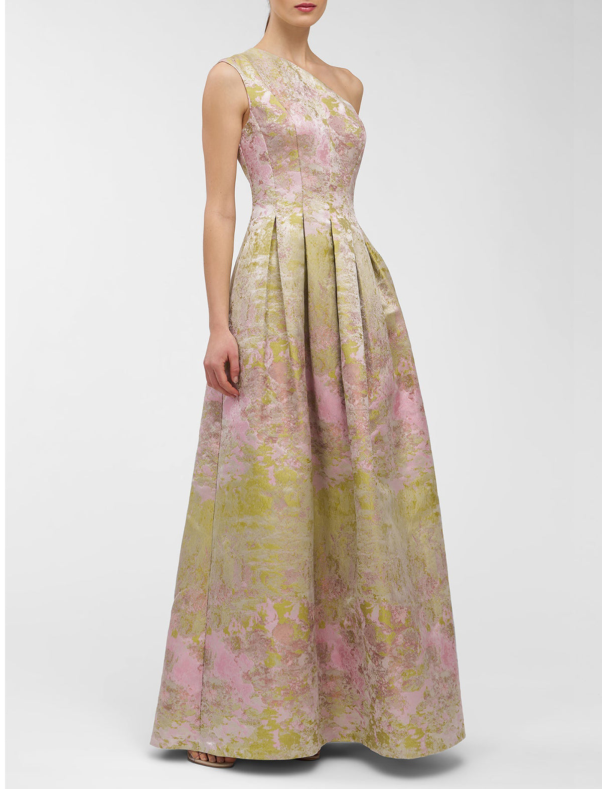 A bestselling silhouette reimagined in metallic Monet jacquard, this one-shoulder gown features soft pleats and a full skirt that catches the light with every step. A gallery-worthy choice for summer weddings, artful evenings, and dressy celebrations.