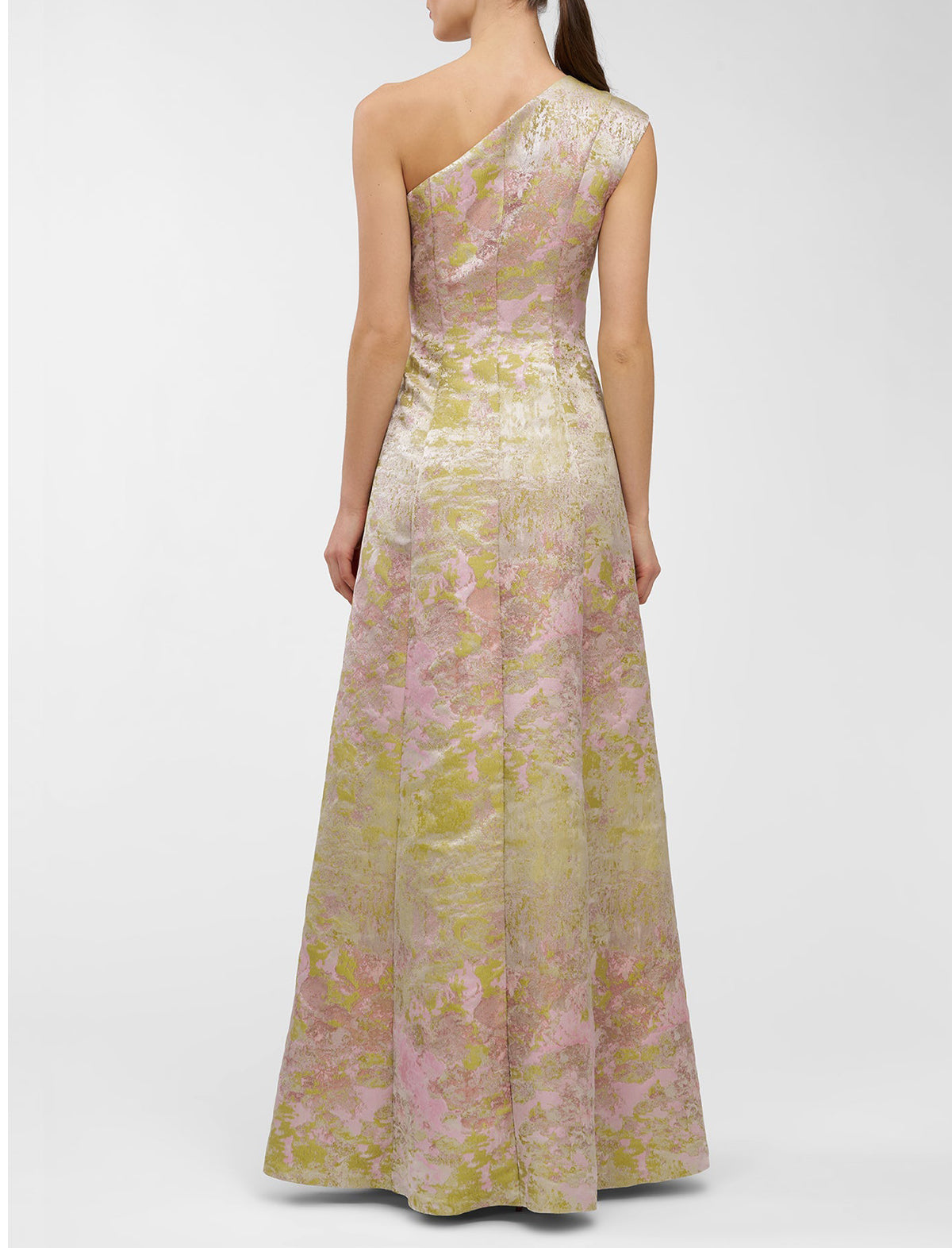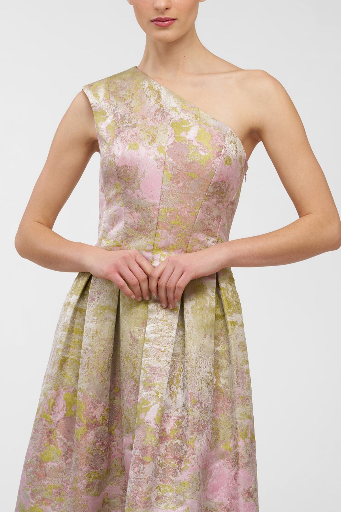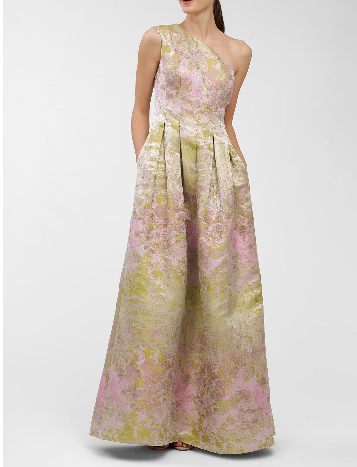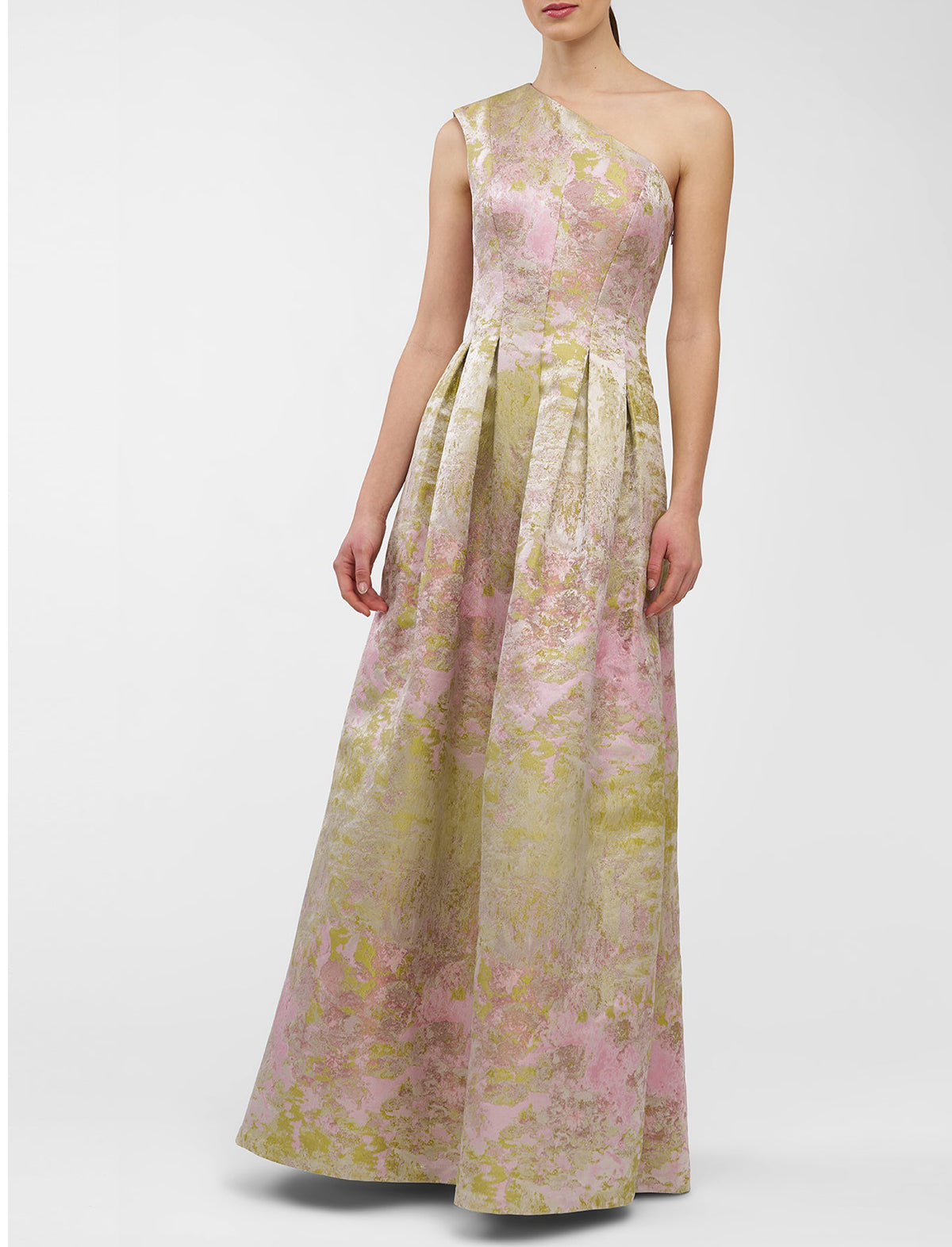 A bestselling silhouette reimagined in metallic Monet jacquard, this one-shoulder gown features soft pleats and a full skirt that catches the light with every step. A gallery-worthy choice for summer weddings, artful evenings, and dressy celebrations.