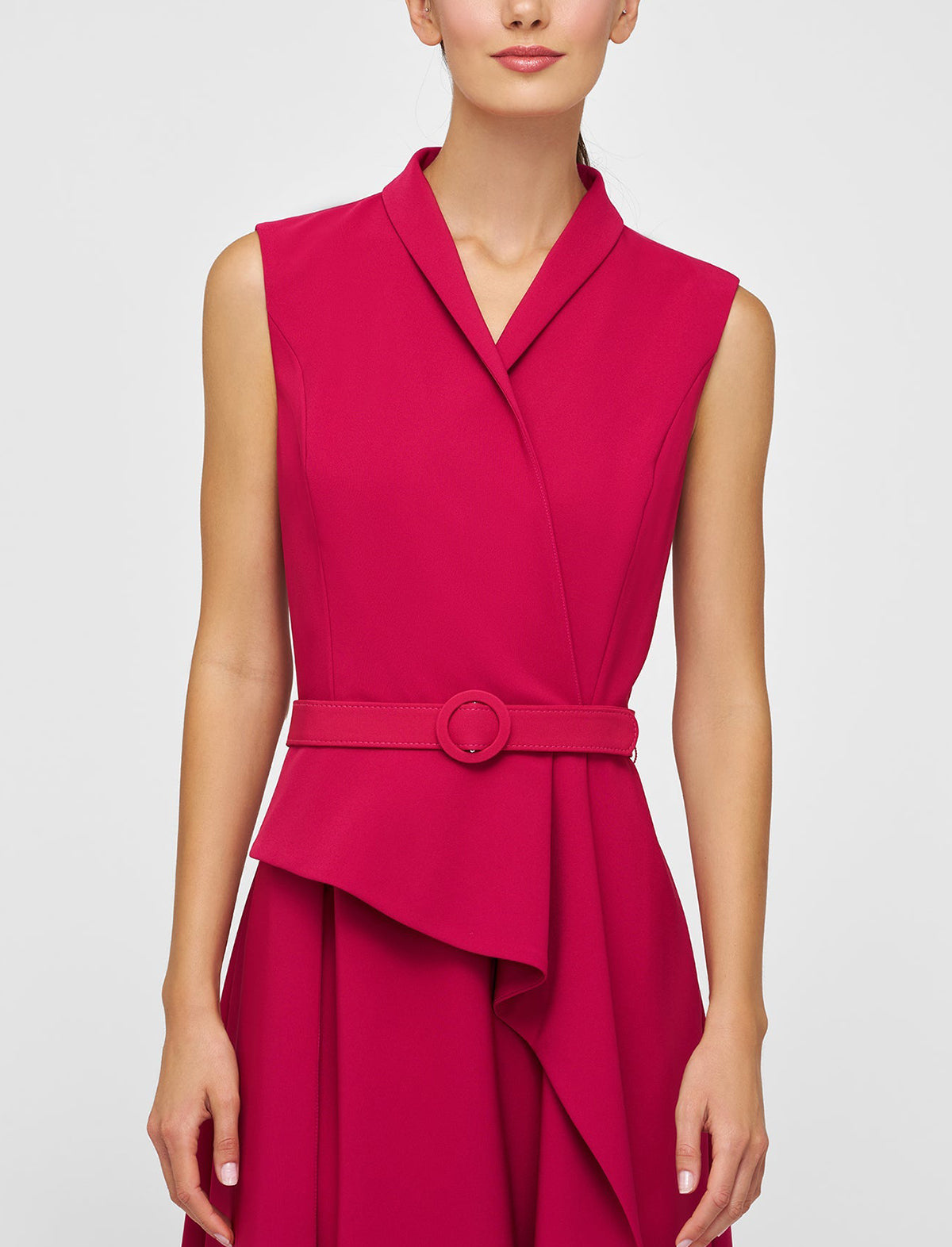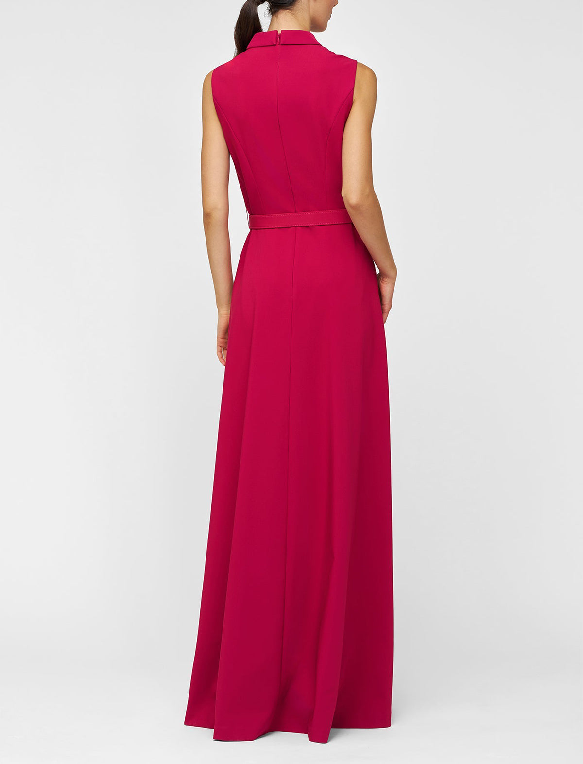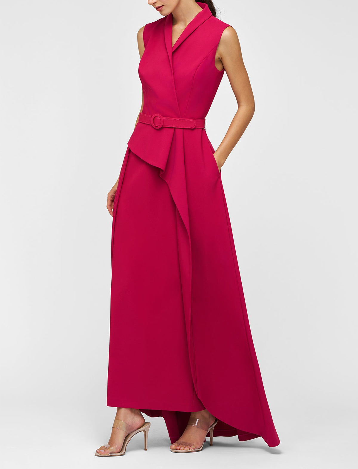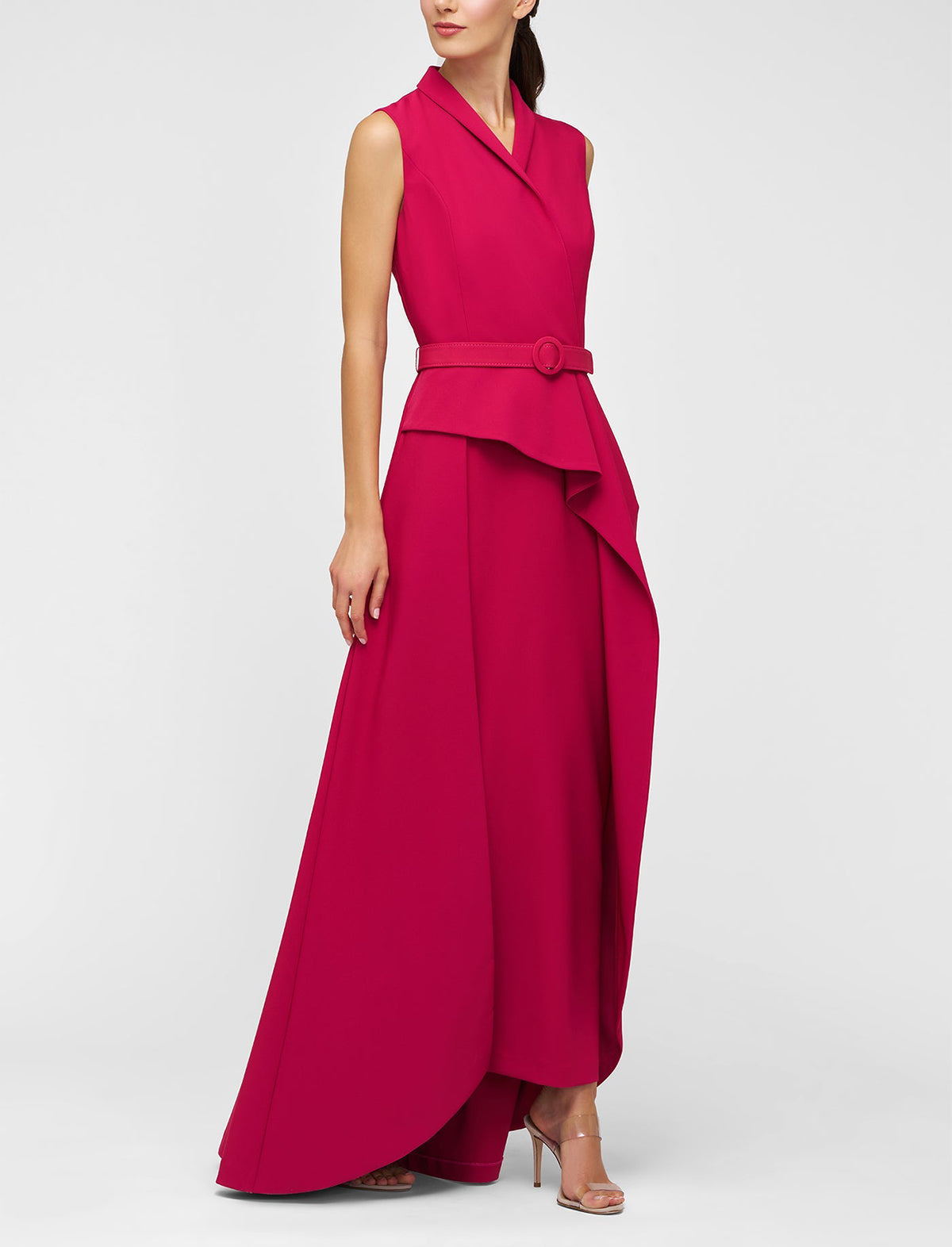Tailored in stretch crepe, this walk-thru jumpsuit strikes a sharp silhouette with a notched shawl collar and belted waist. A column-style underlay adds structure, while the asymmetric overskirt brings in a soft ruffle detail, complete with a back slit for ease.
