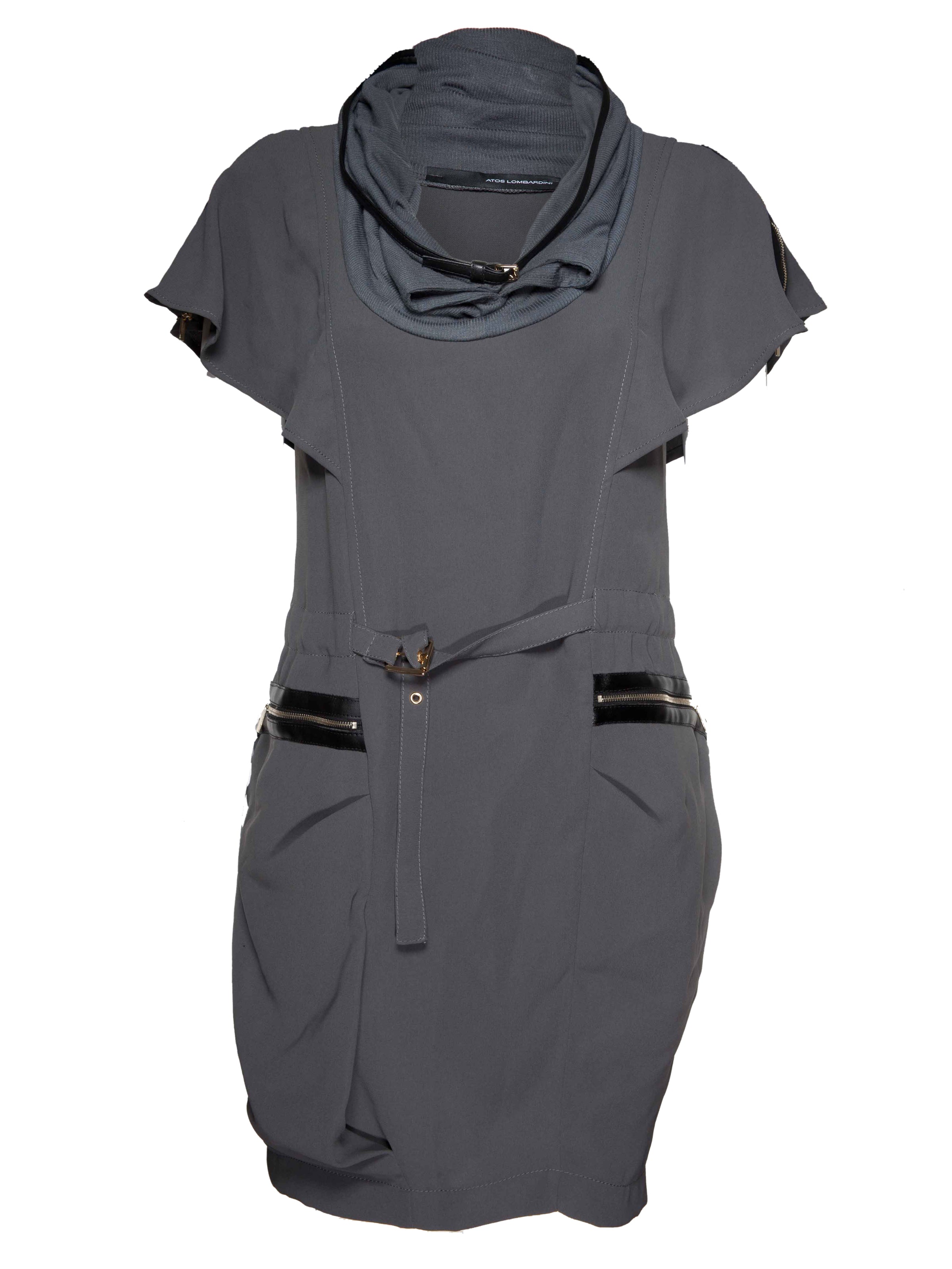 Fitted grey dress featuring zipped pockets, a rounded leather-trimmed neckline and an adjustable belt with gold buckle. 100% POLYESTER, HAND WASH