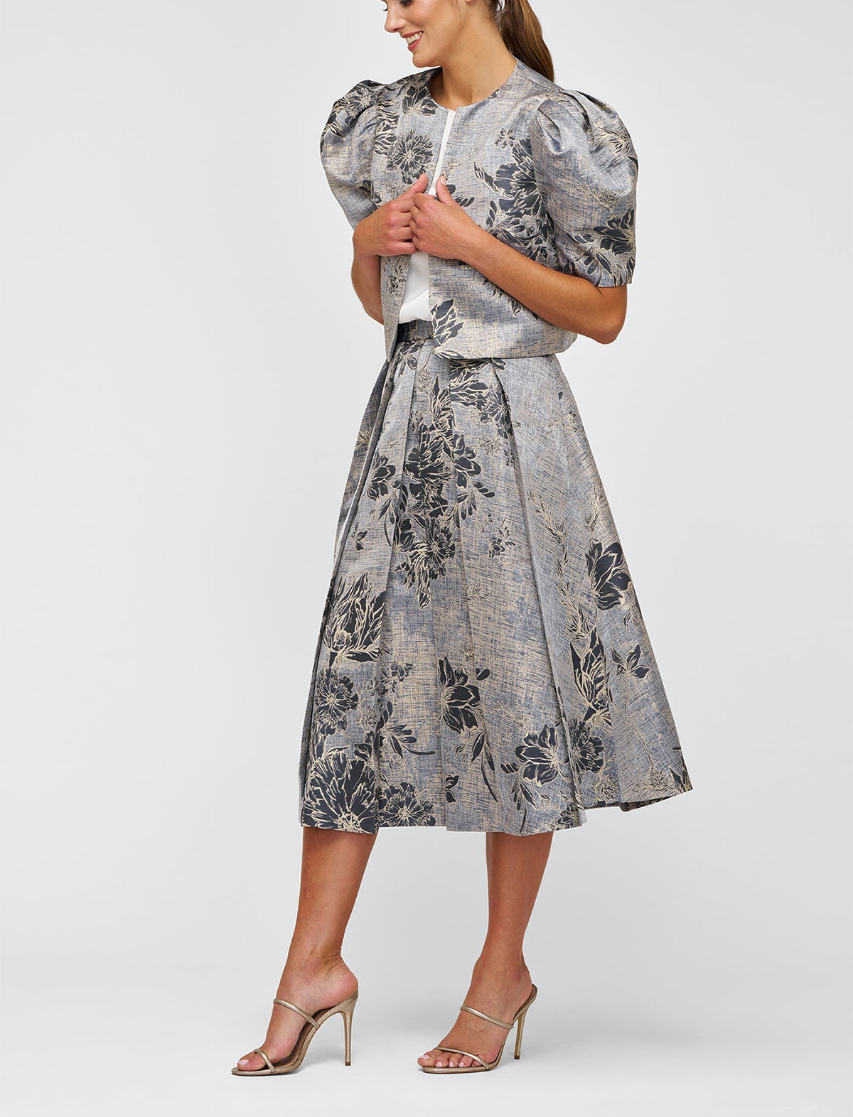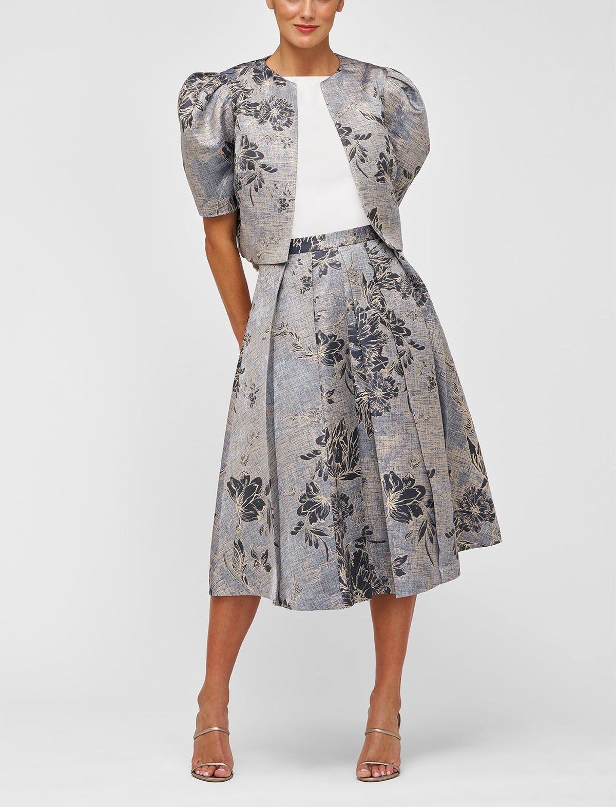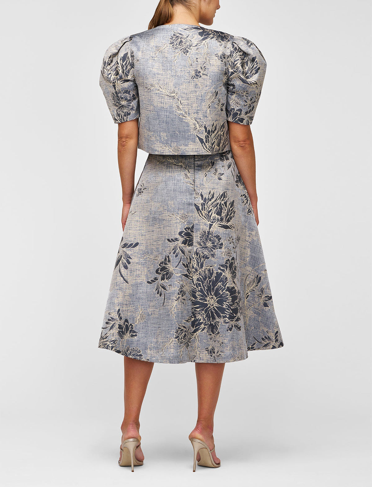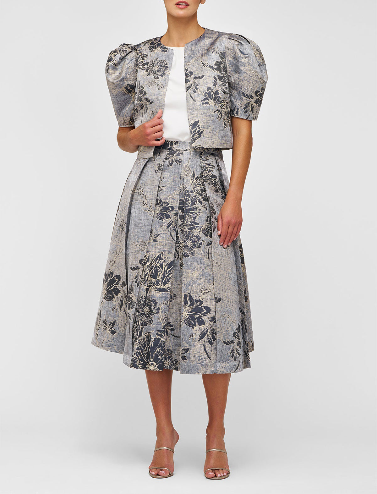 A structured short-sleeve jacket reimagined in a metallic jacquard with an exclusive floral motif. Featuring voluminous puff sleeves and a clean open front, this updated take on our bestselling silhouette adds impact to summer gatherings and garden parties.