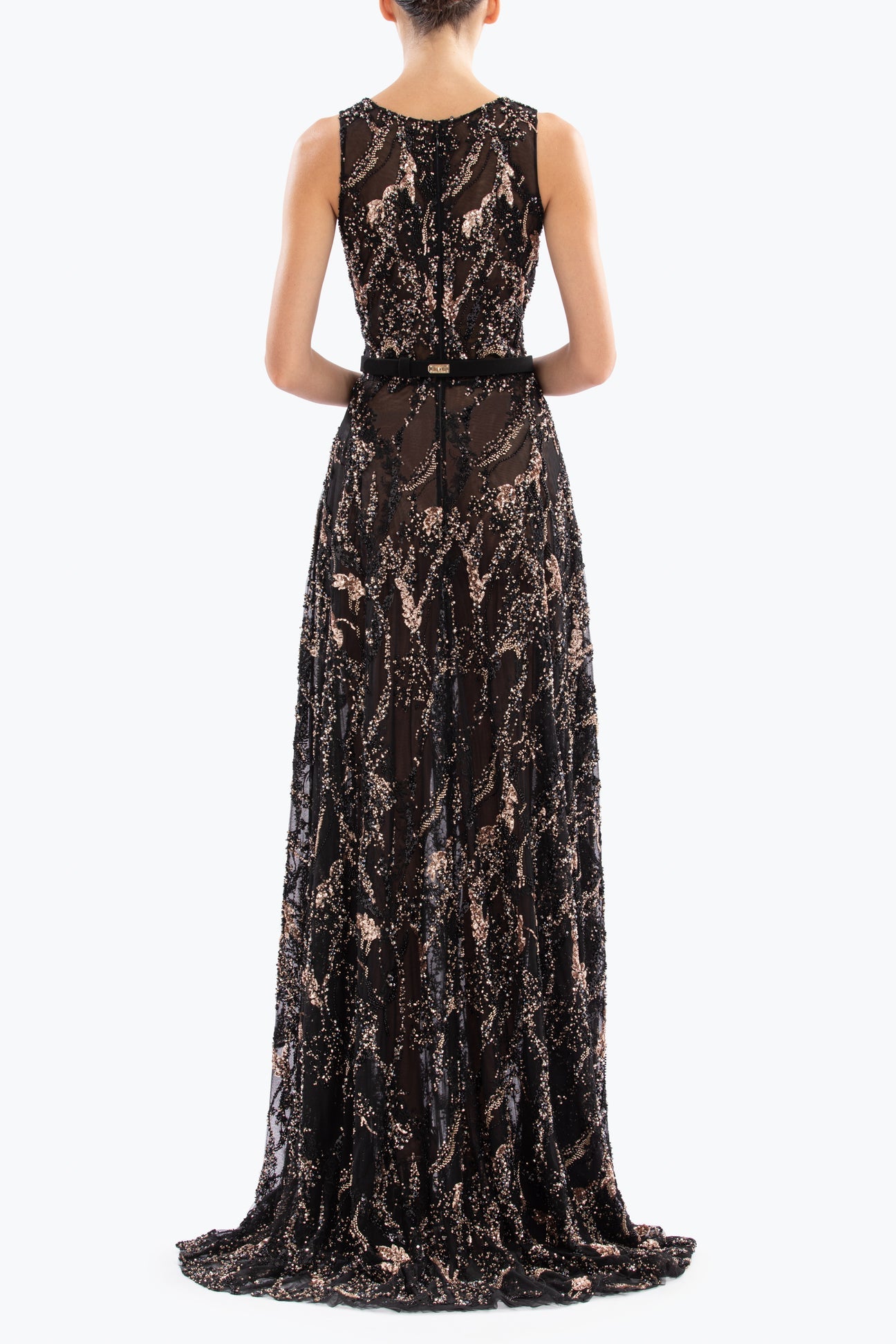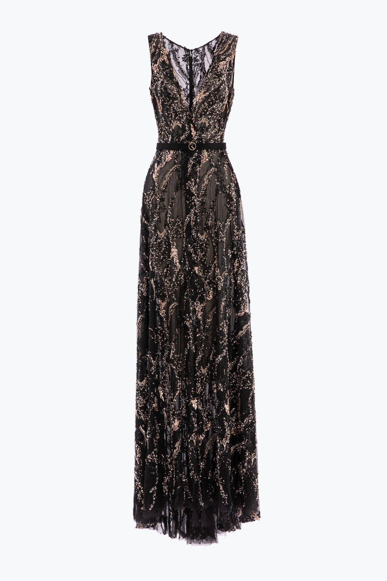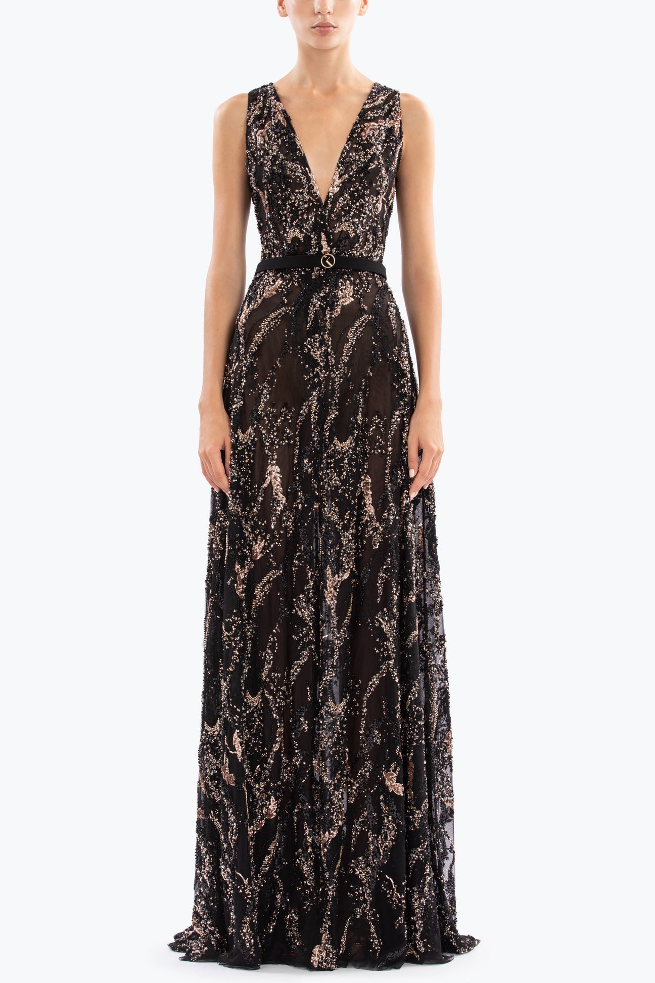 Jet black dress adorned with intricate gold embroidery. This fully embroidered piece features a deep V neckline, complemented by a long, floor-length skirt. Paired with a jet black SK belt.