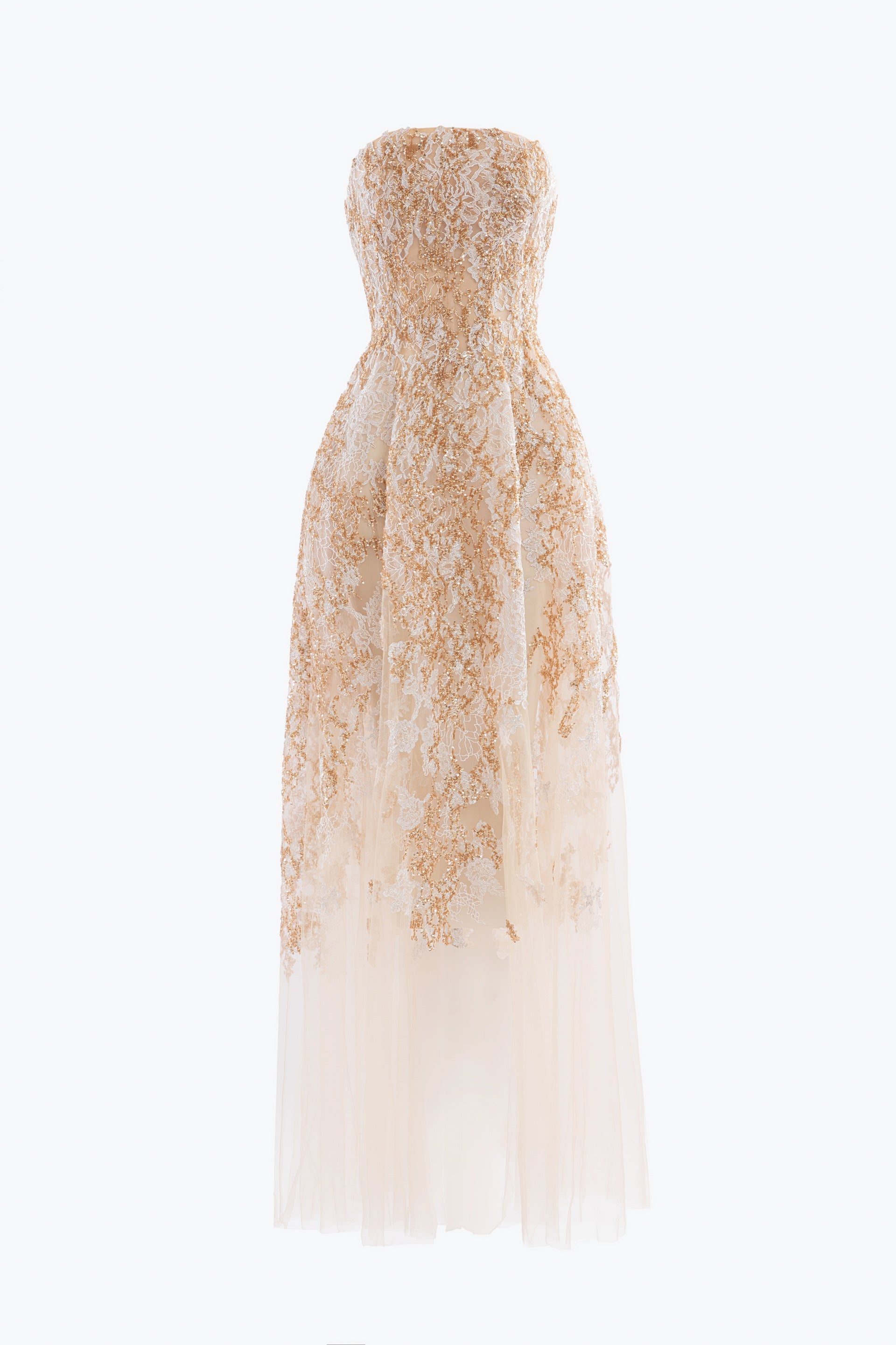 Off-white and gold embroidered strapless dress features a flowing, embroidered tulle design with a floor-length skirt. The strapless silhouette highlights the intricate floral pattern in off-white, accented with shimmering gold details