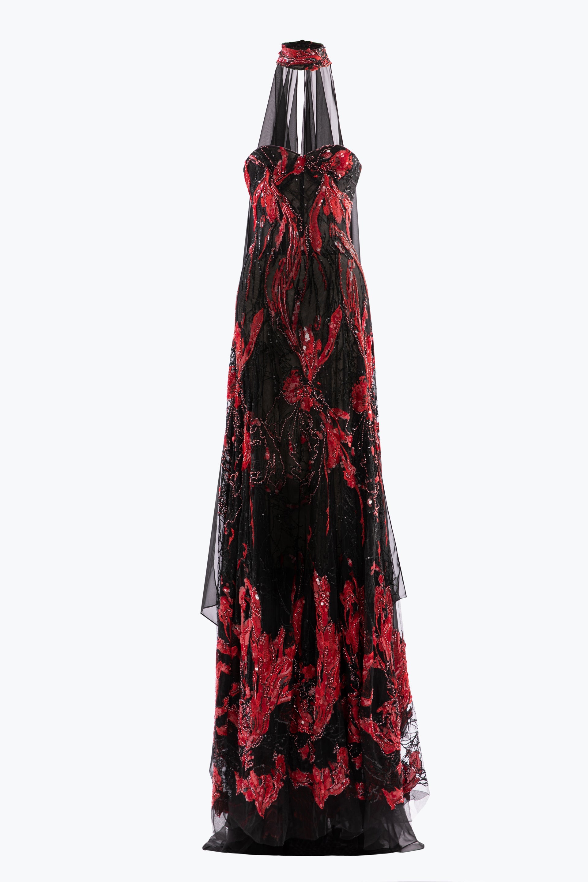 Strapless fitted dress in jet black and red embroidery, embellished with red sequins and intricate red threads forming leaves shapes. Includes an embroidered collar with gathered jet black muslin.