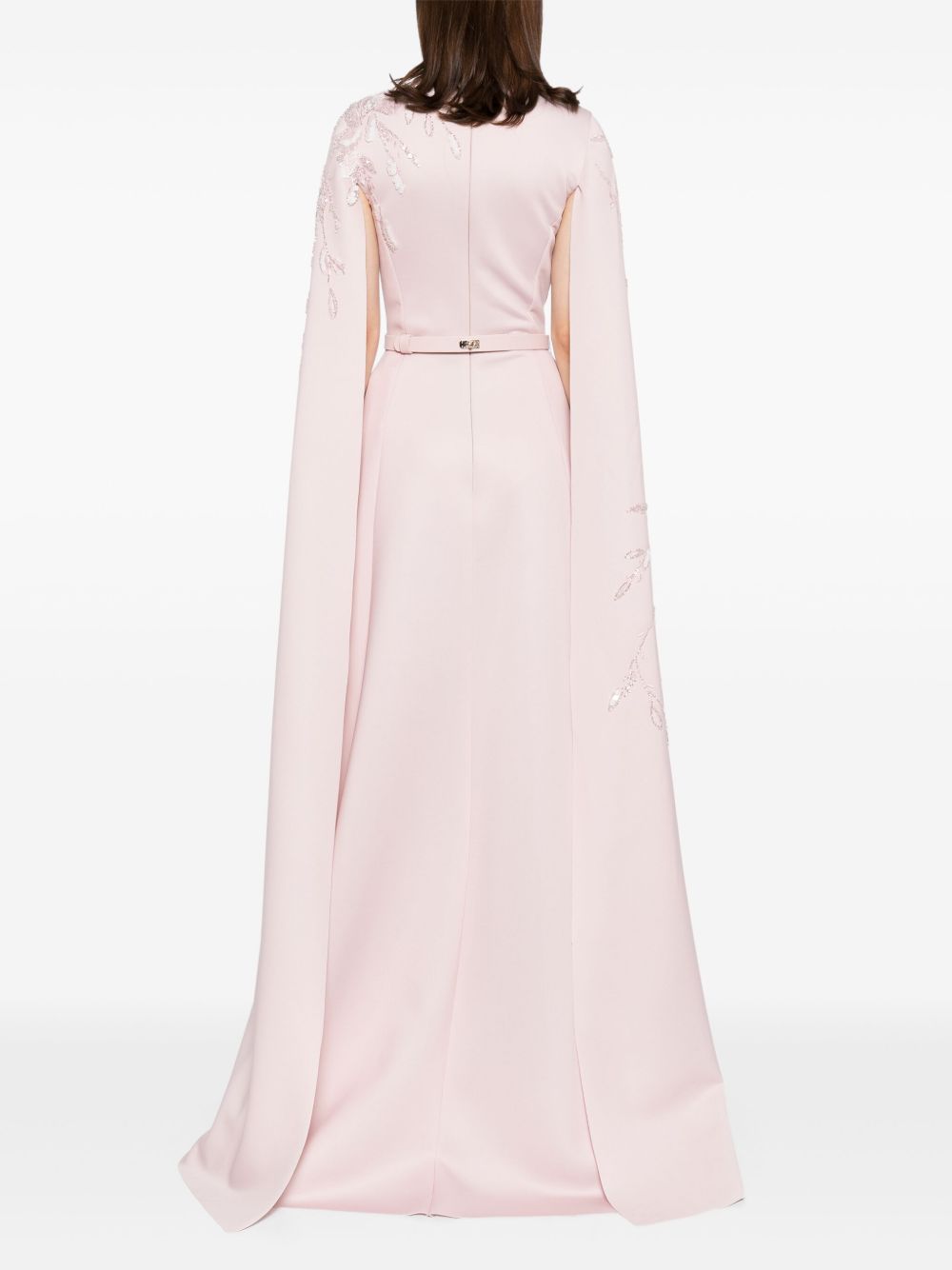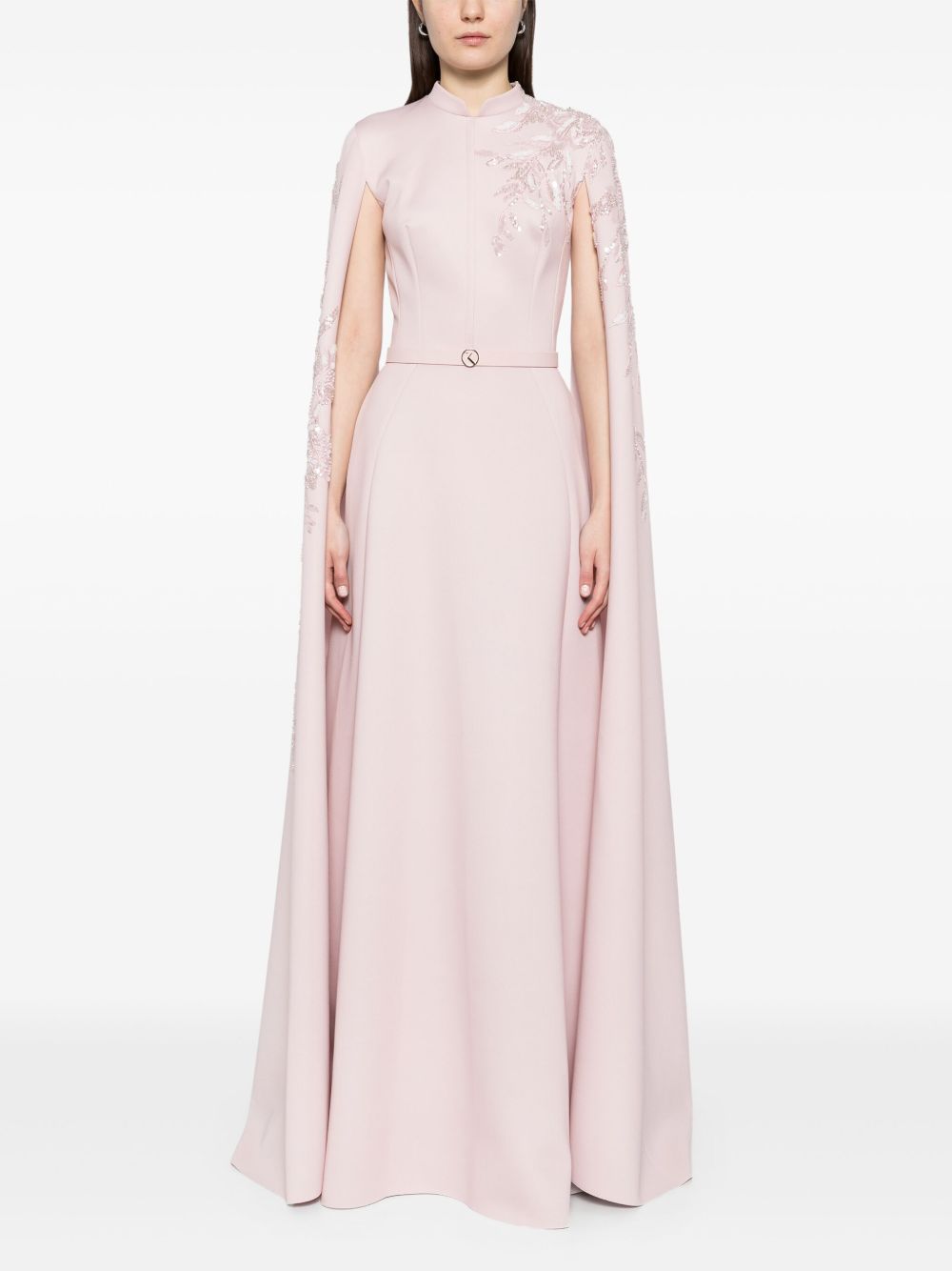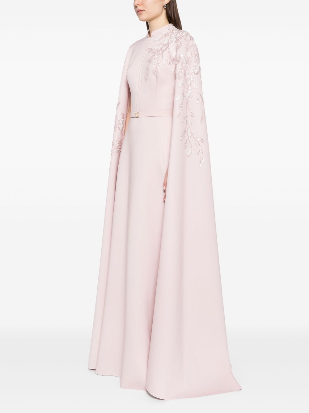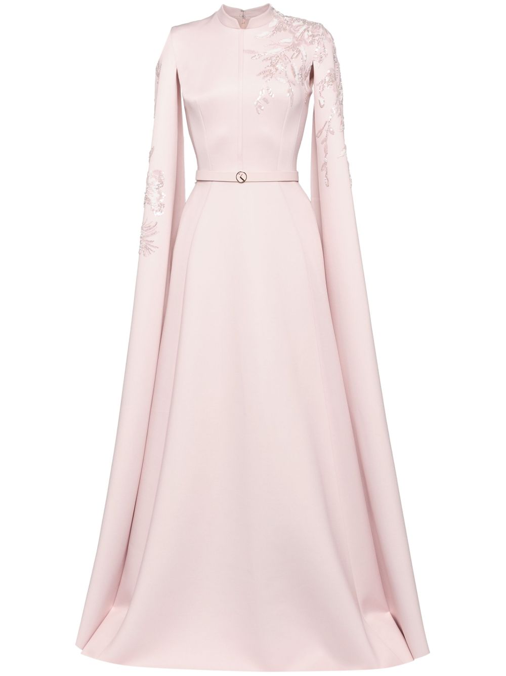 The dusky pink scuba kaftan is a vision of elegance, featuring exquisite floral embroidery cascading from the sleeves to the bodice. Its waisted silhouette and royal aesthetic are enhanced by wide cape sleeves, paired with a matching belt.