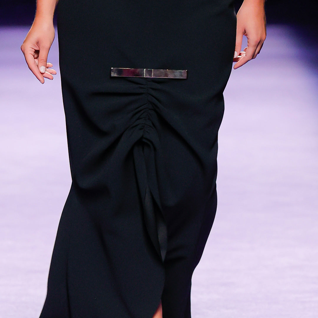 - Silhouette: Fitted bodice with a slight flare towards the gathered knee detail