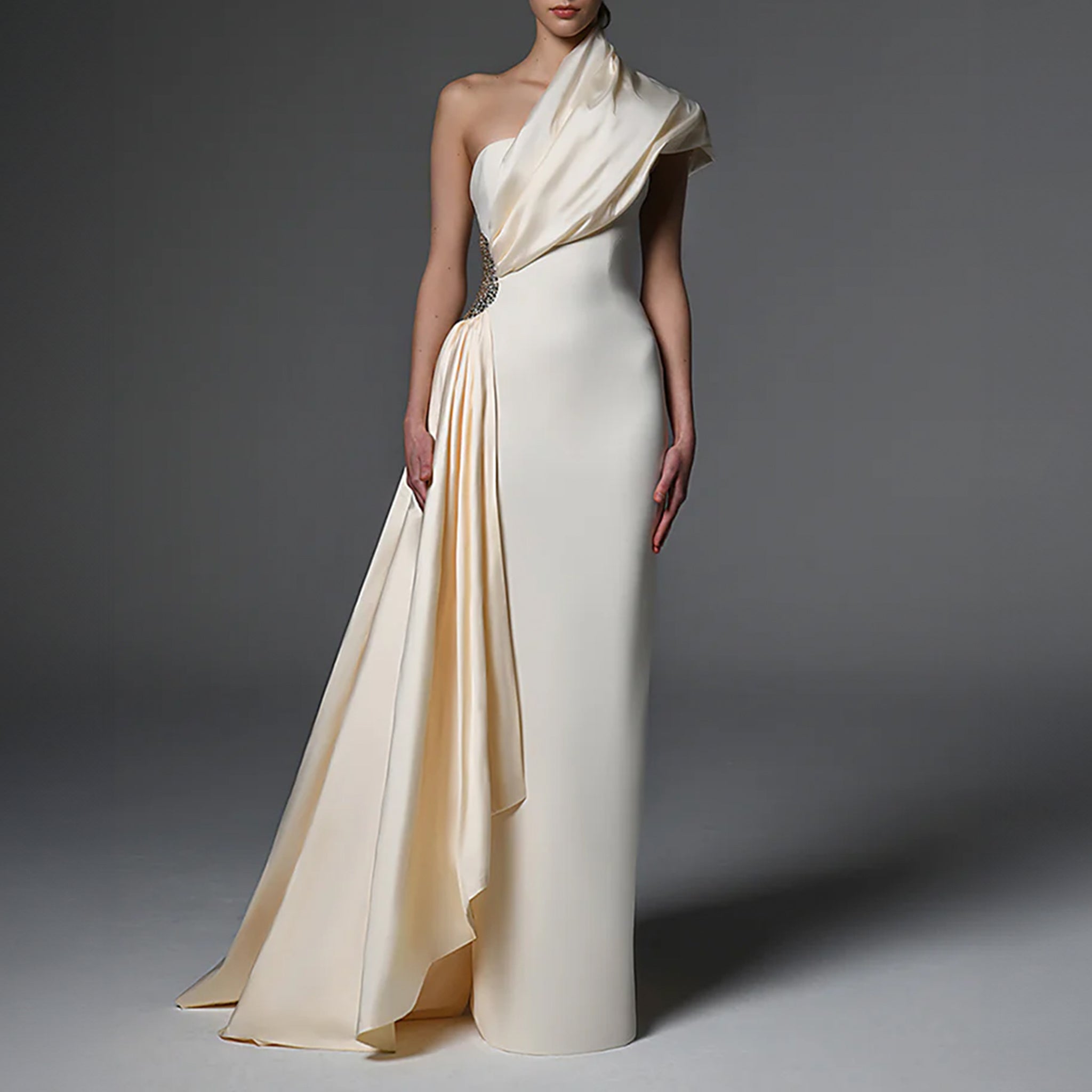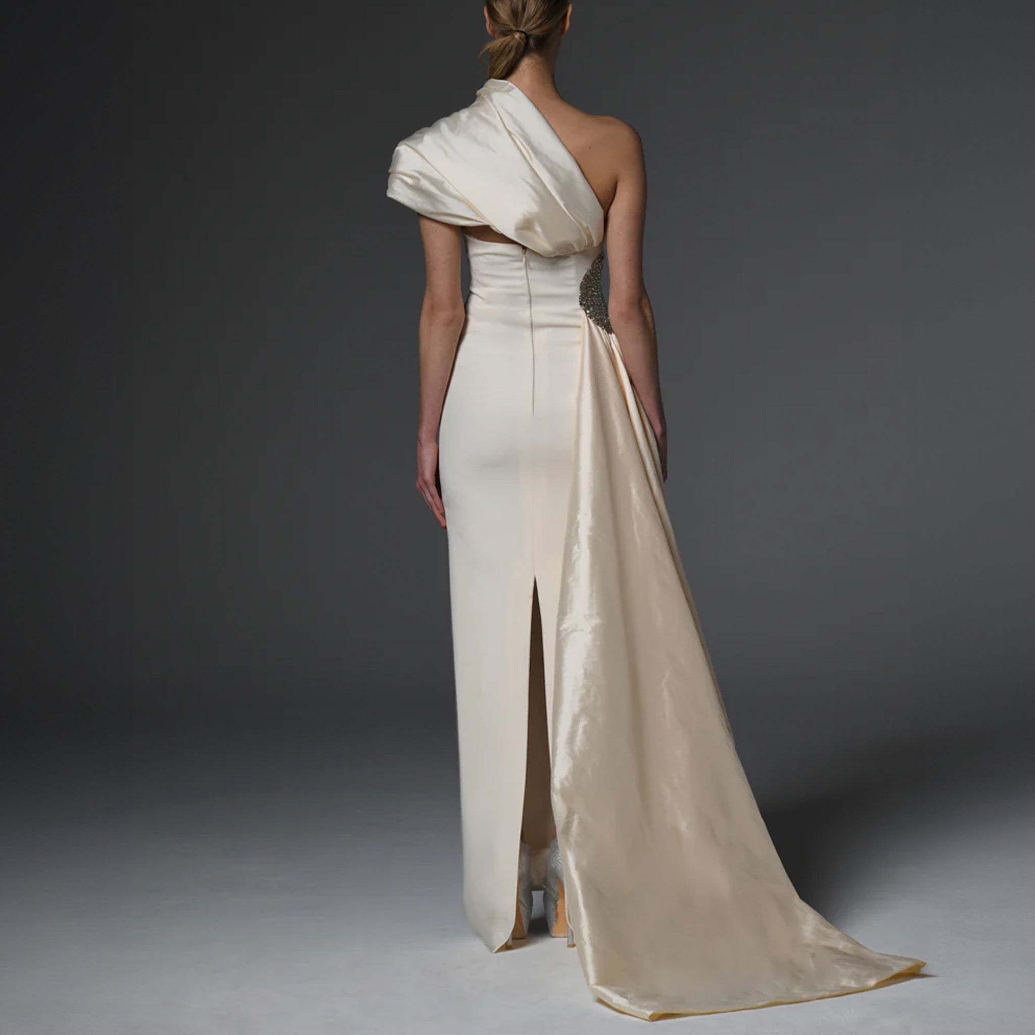 Ivory Asymmetric Crepe Dress With Taffeta Collar