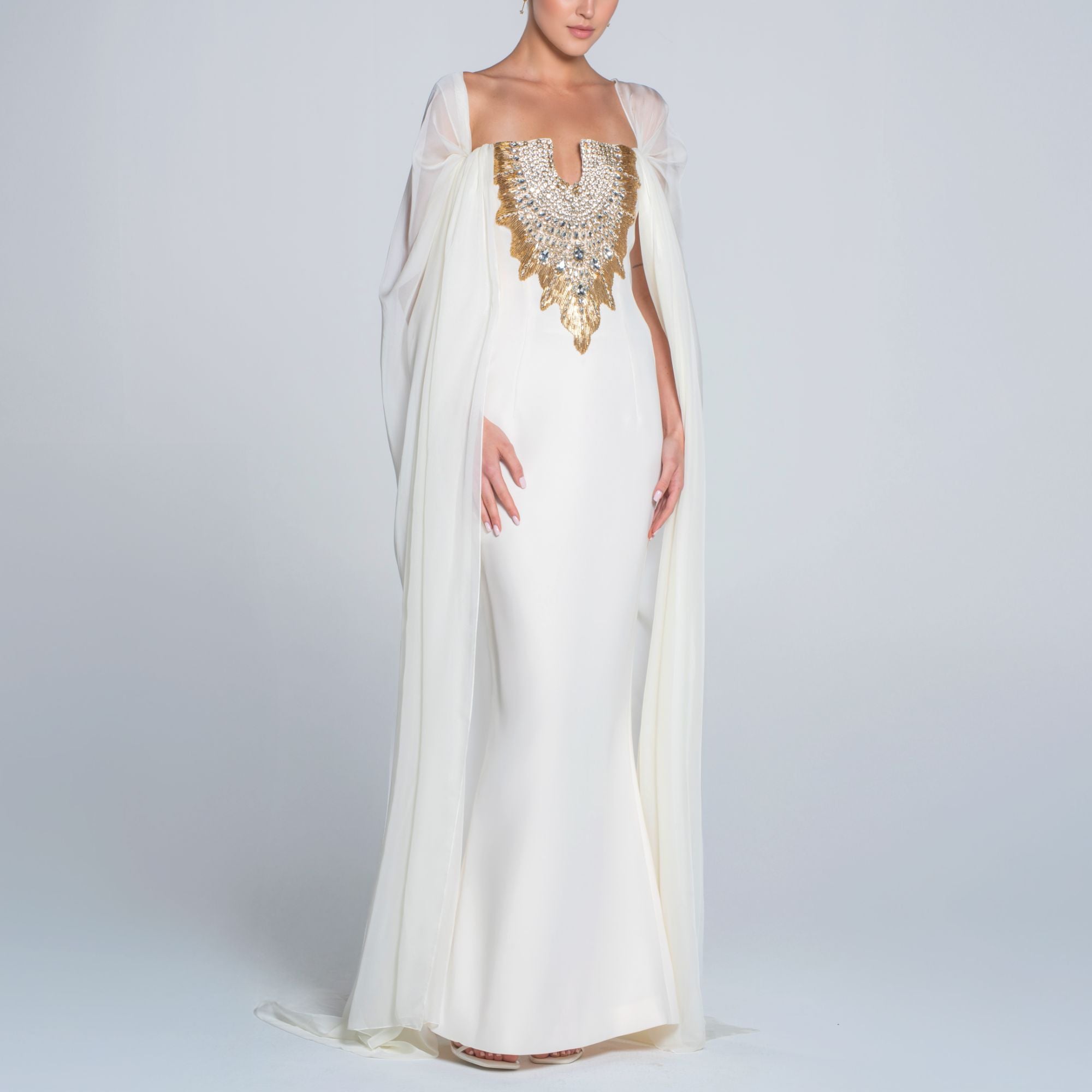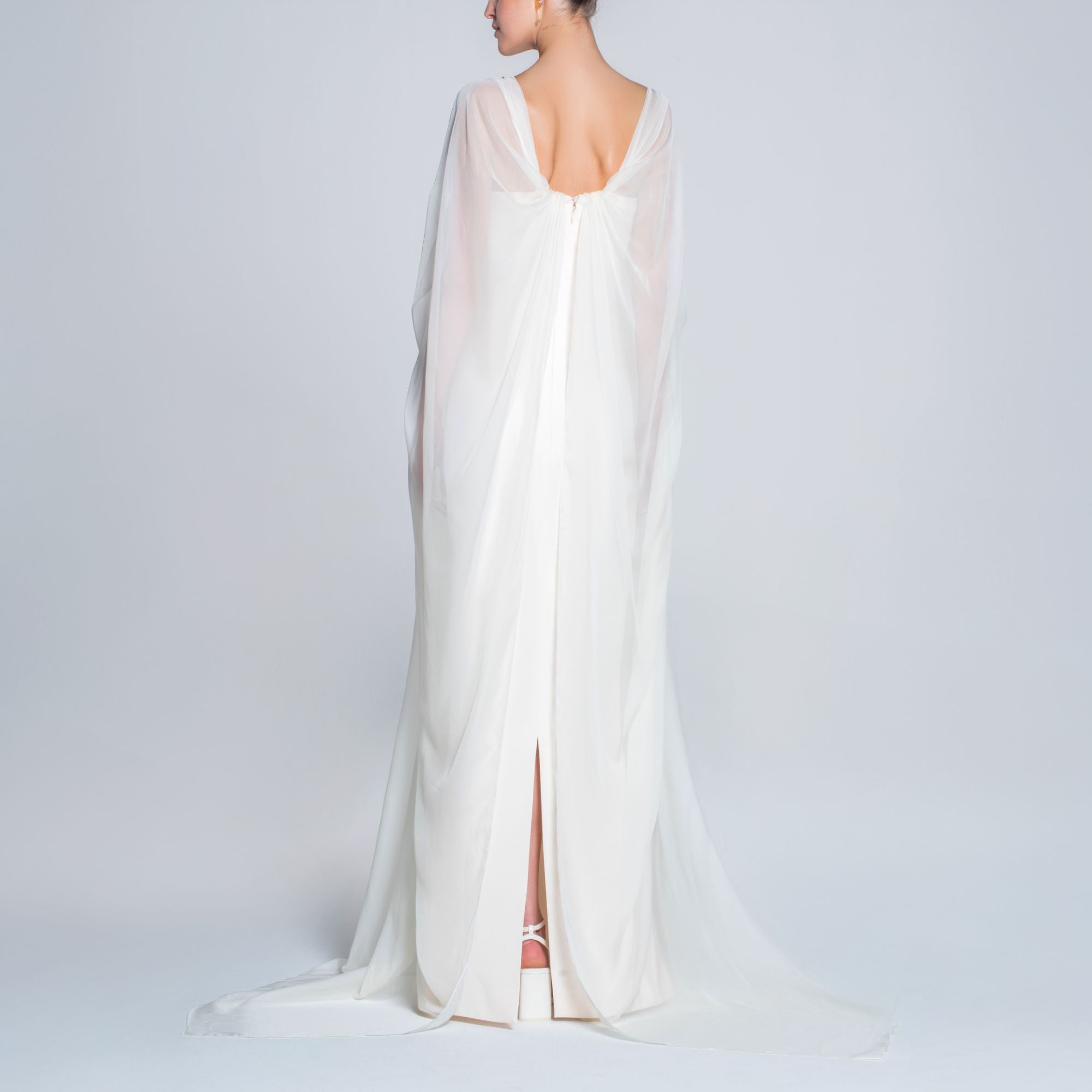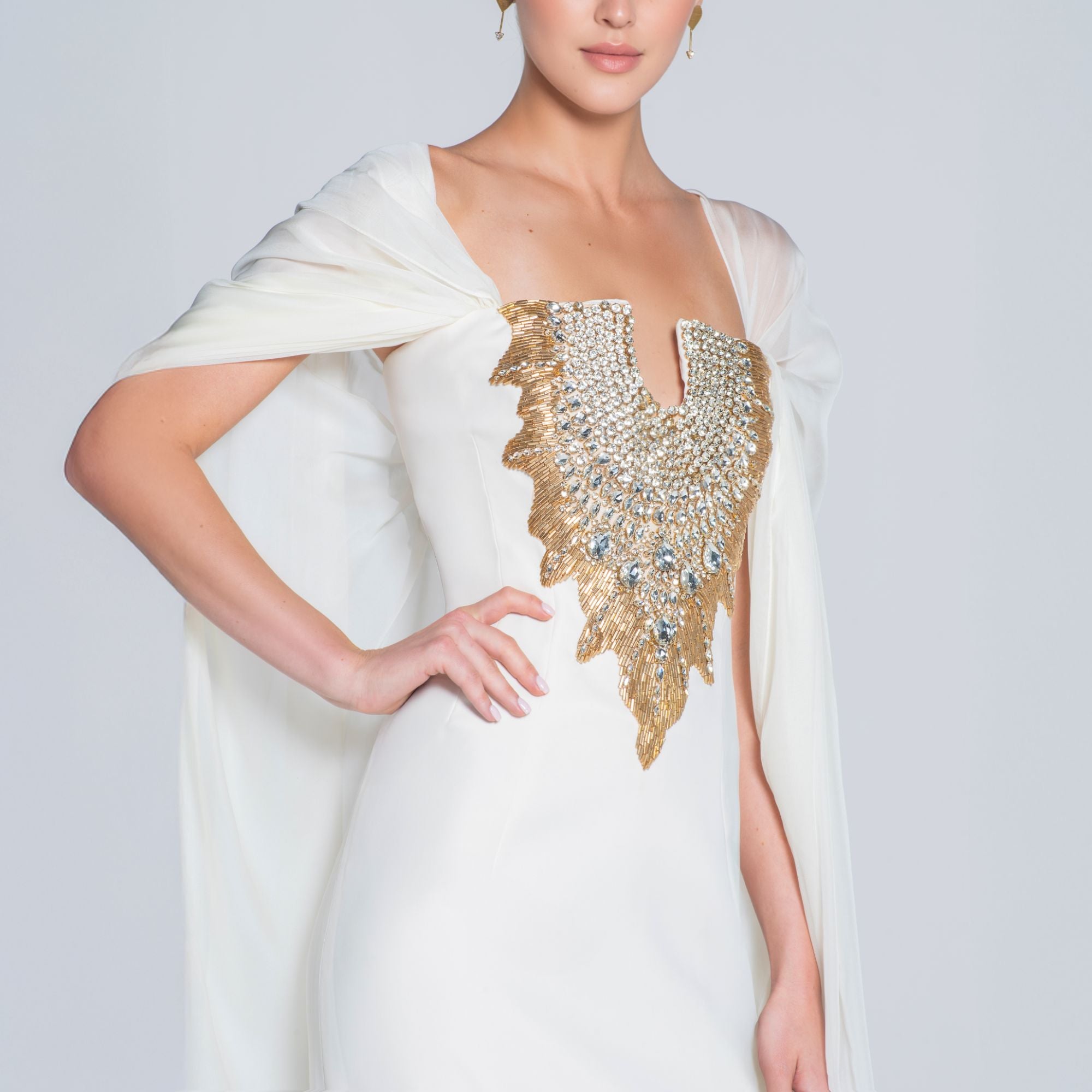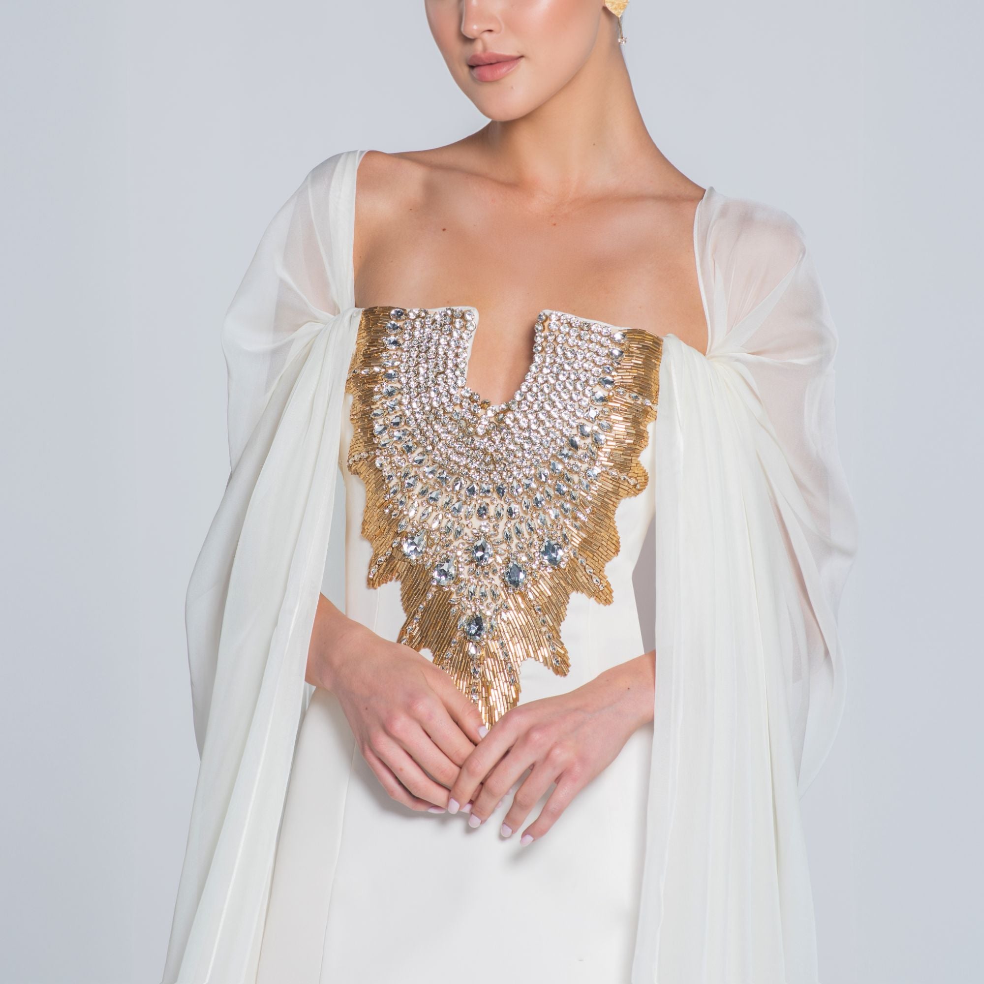 Ivory White Crepe Dress With Embroidery And Chiffon Sleeves