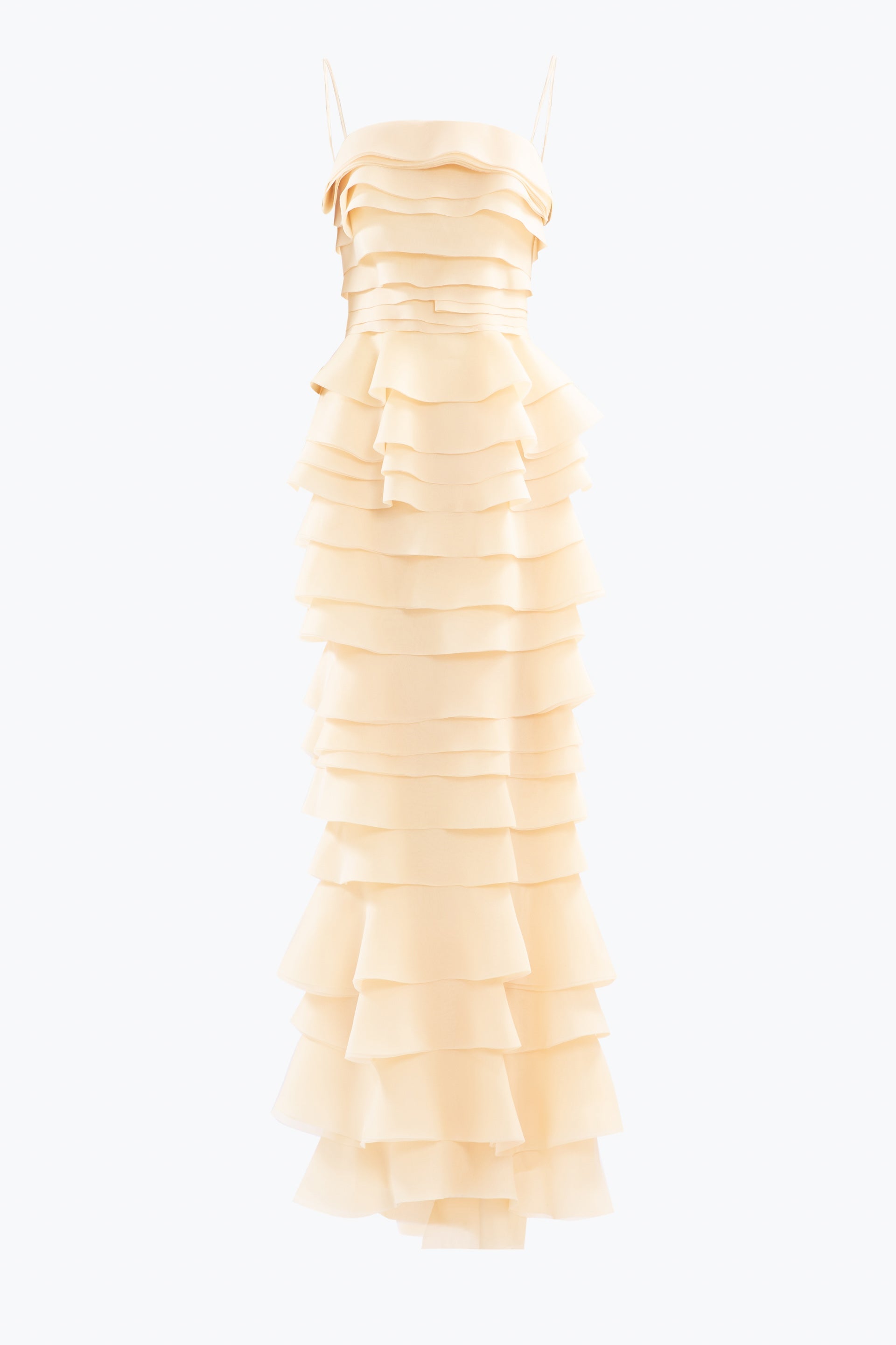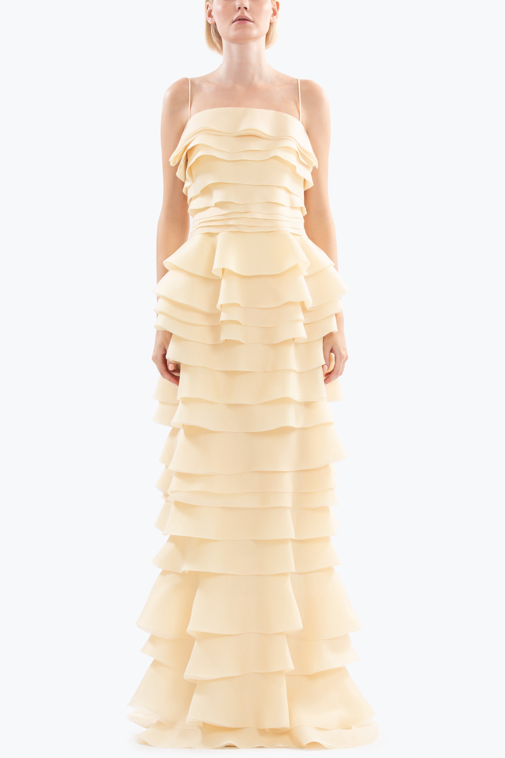 Yellow pear organza layered dress with a long, floor-length skirt, elegantly and fully layered for an exquisite look.