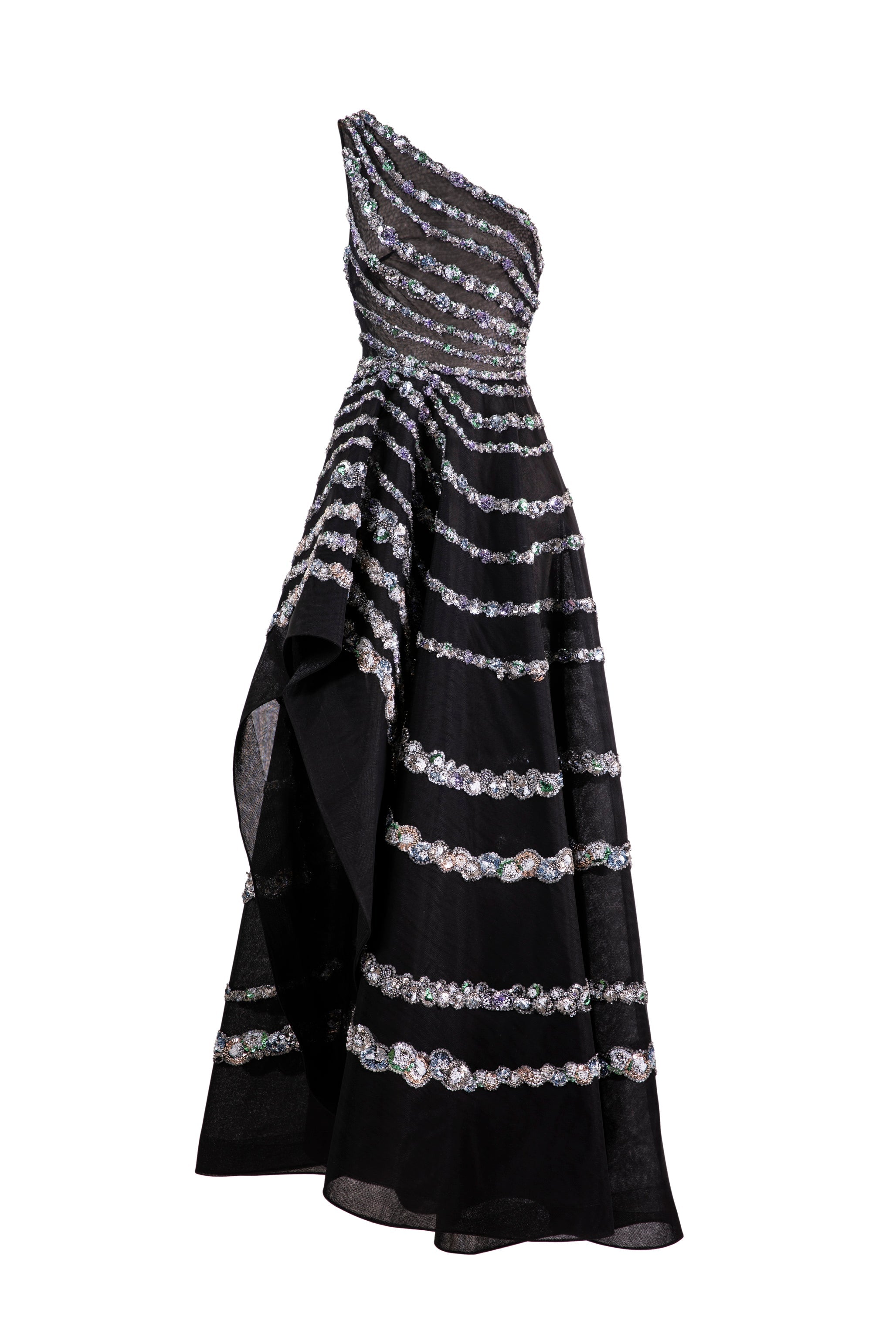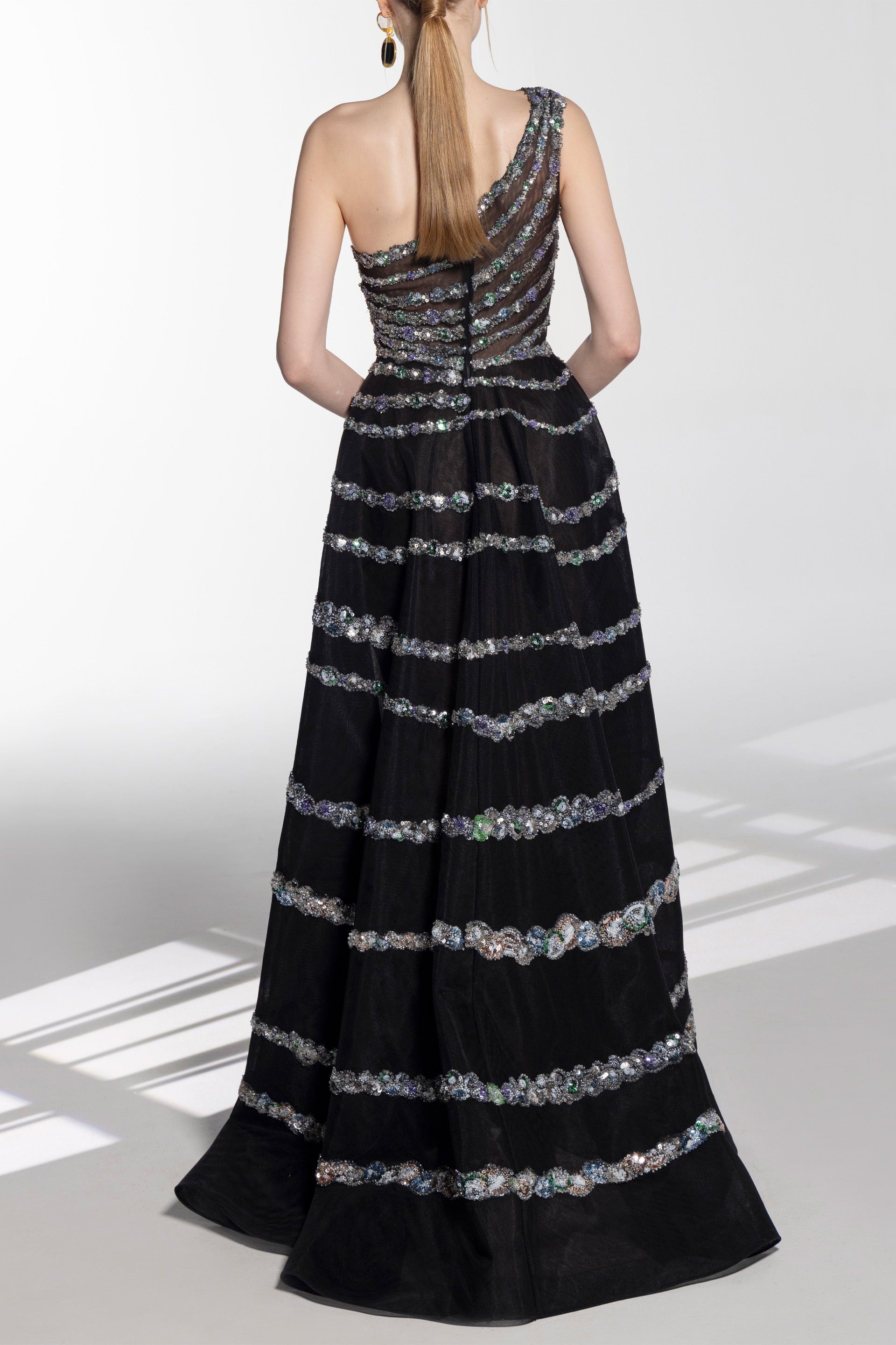 The gown boasts a captivating one-shoulder neckline, radiating timeless elegance, while the ethereal tulle fabric adds an element of enchantment and grace with its high-low asymmetrical skirt complemented by a trailing train at the back. Multicolored lines of beads, meticulously arranged in both horizontal and diagonal patterns, adorn the skirt, creating a mesmerizing interplay of colors.