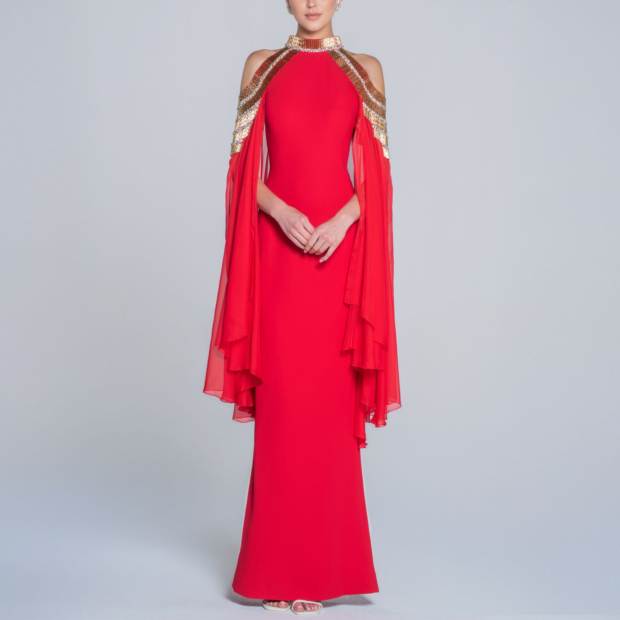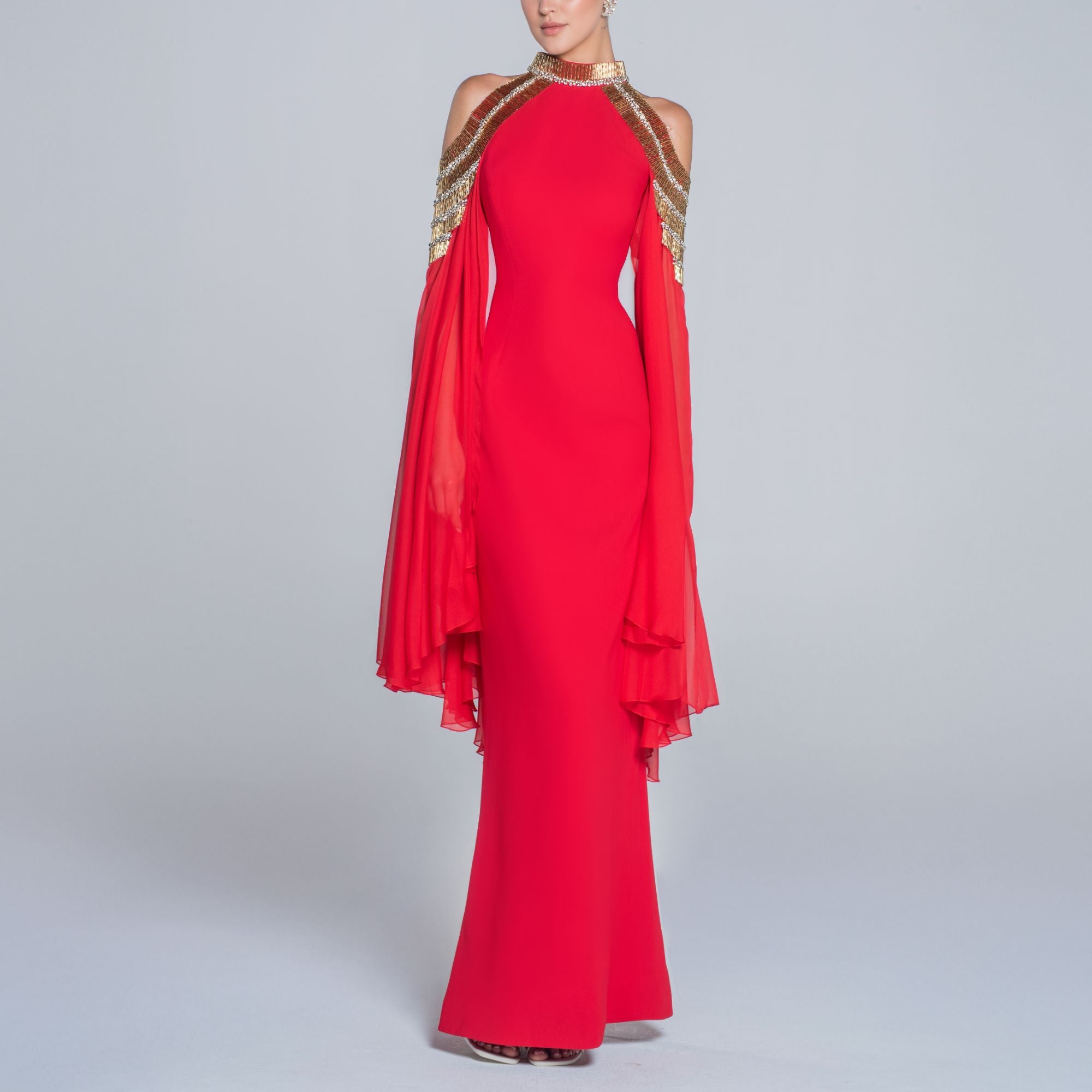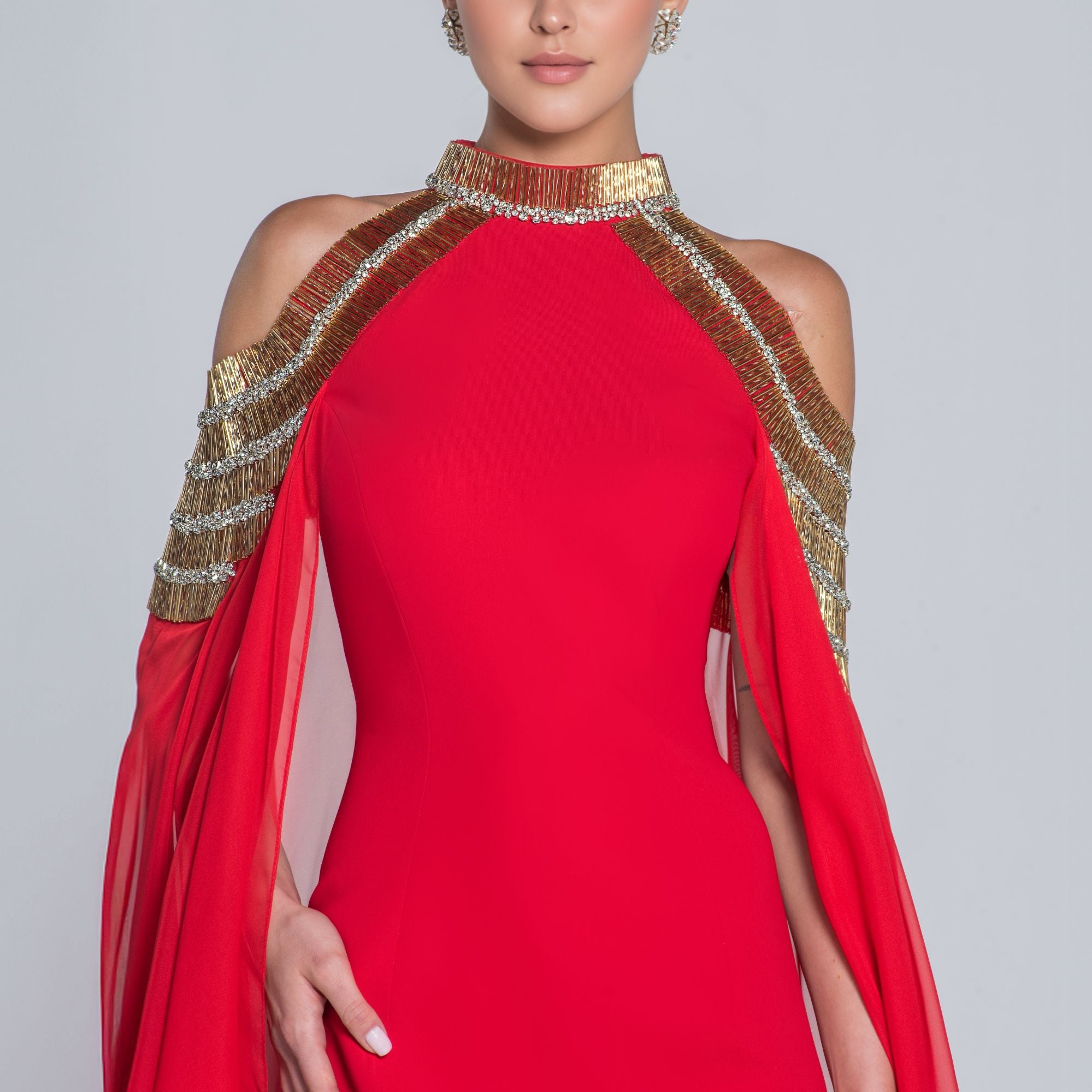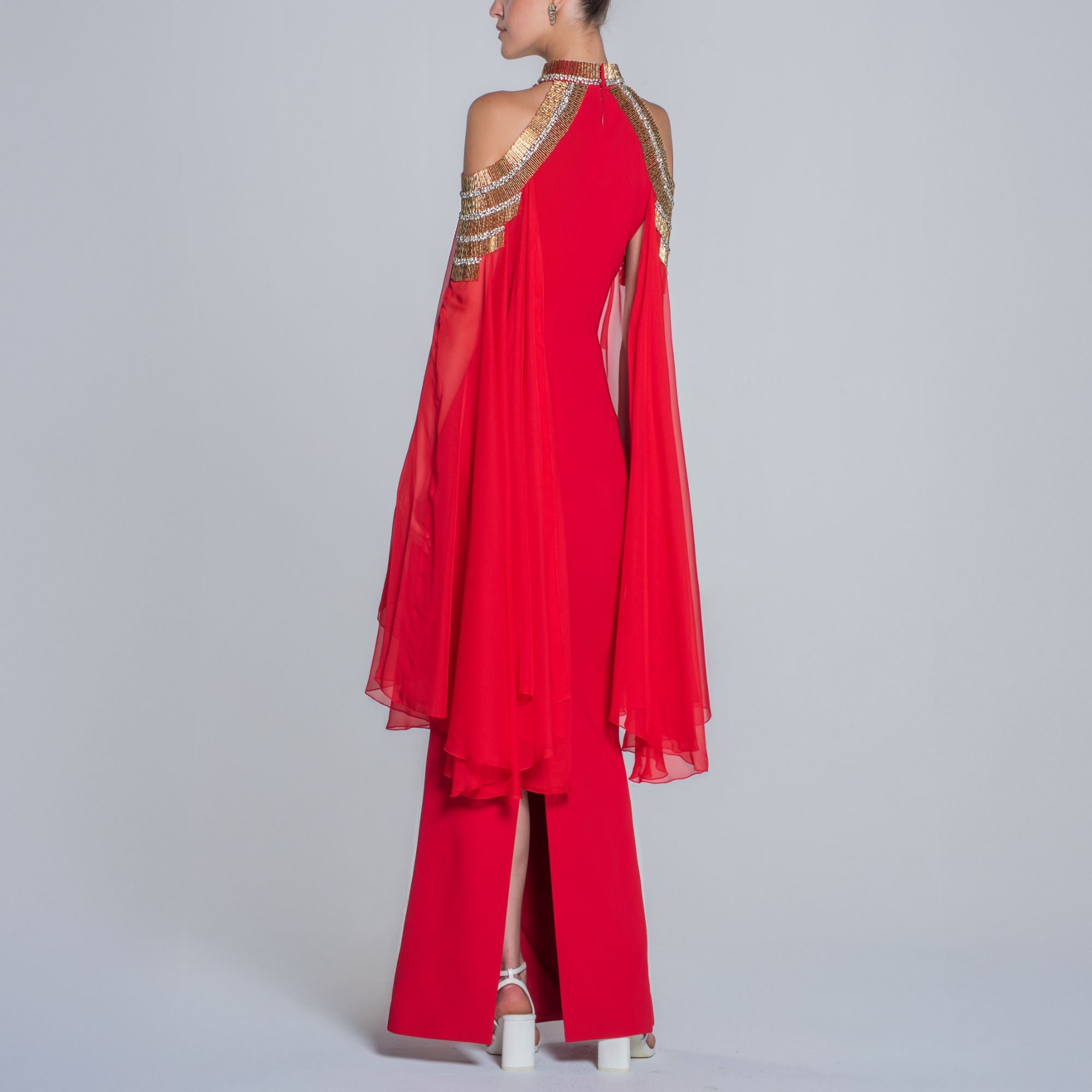 Red Crepe Dress With Embroidery And Cape Sleeves