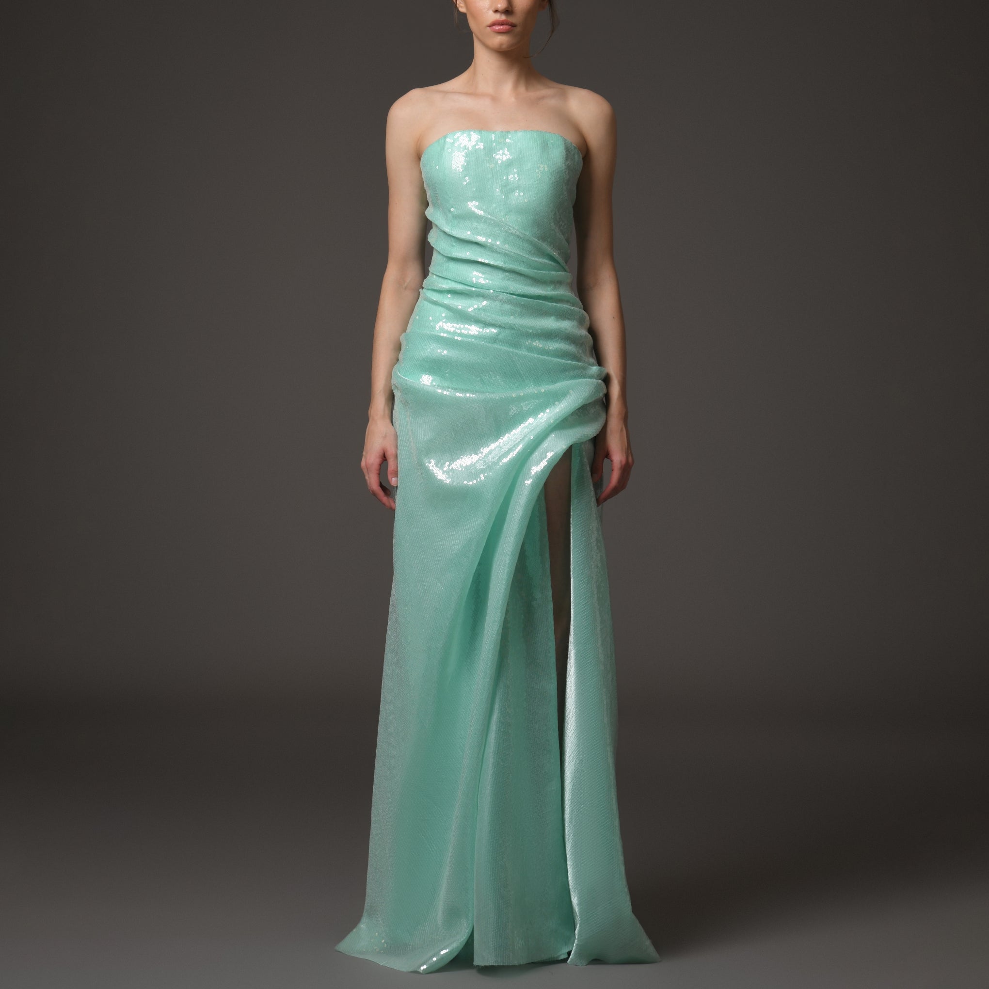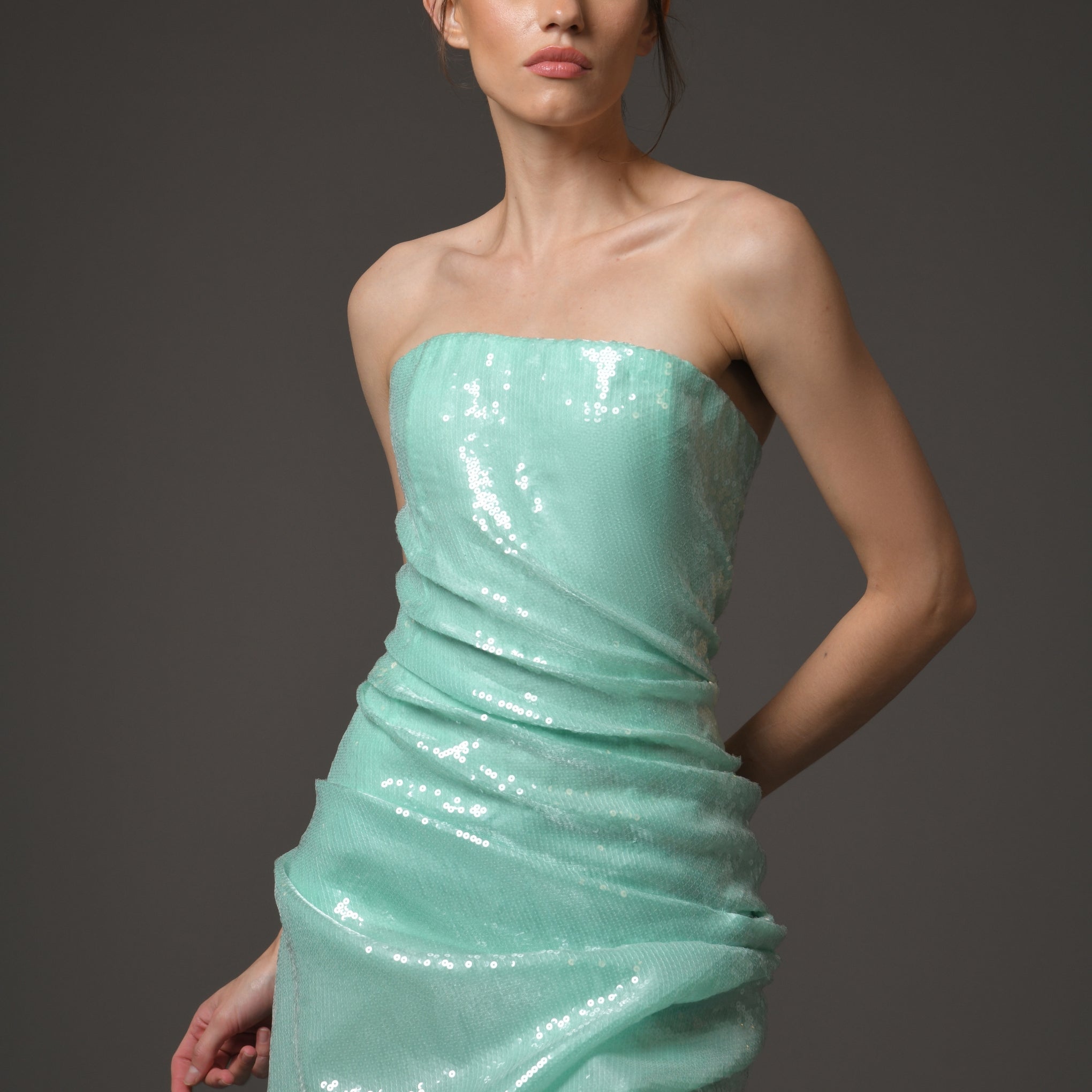 - Shimmering sequins throughout, with luxurious draping detail