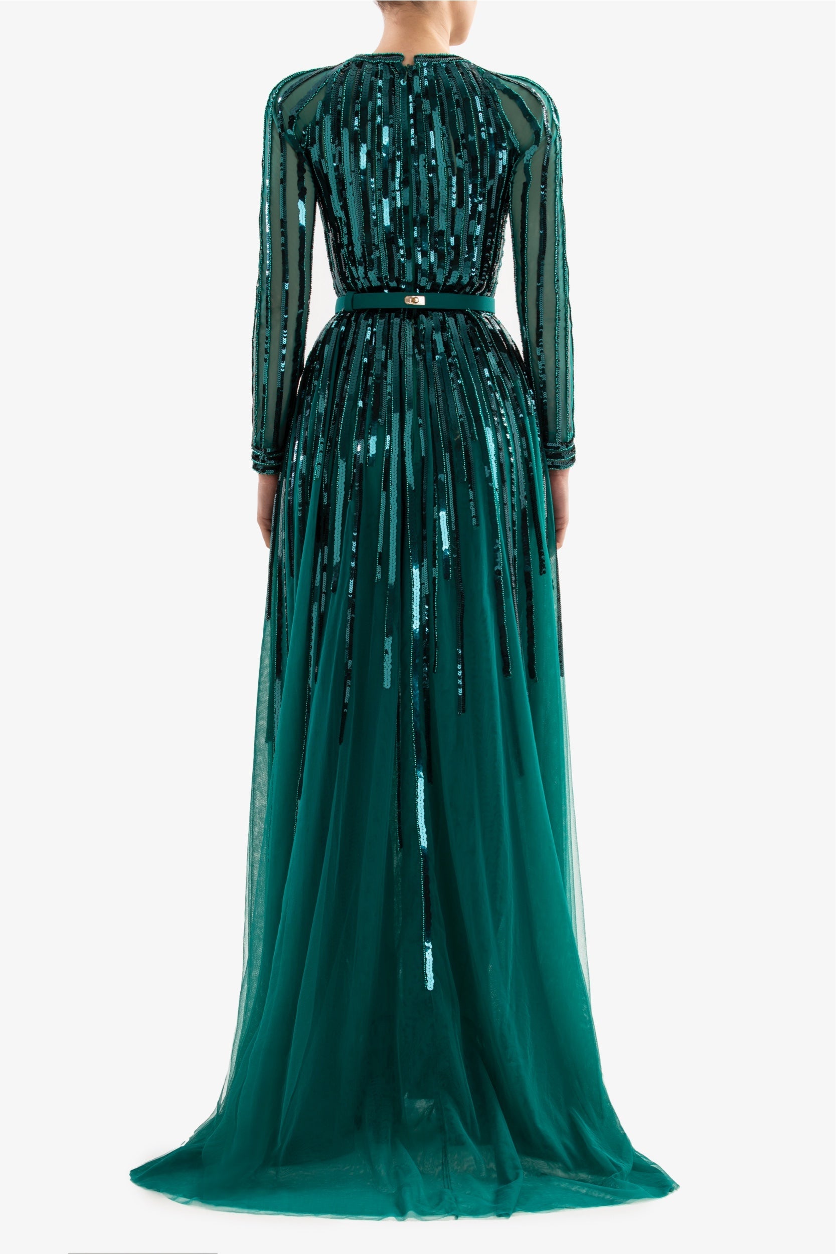 The green sequins long dress features a deep V neckline and long sleeves, and the lined sequins cascade seamlessly from the top to the skirt.