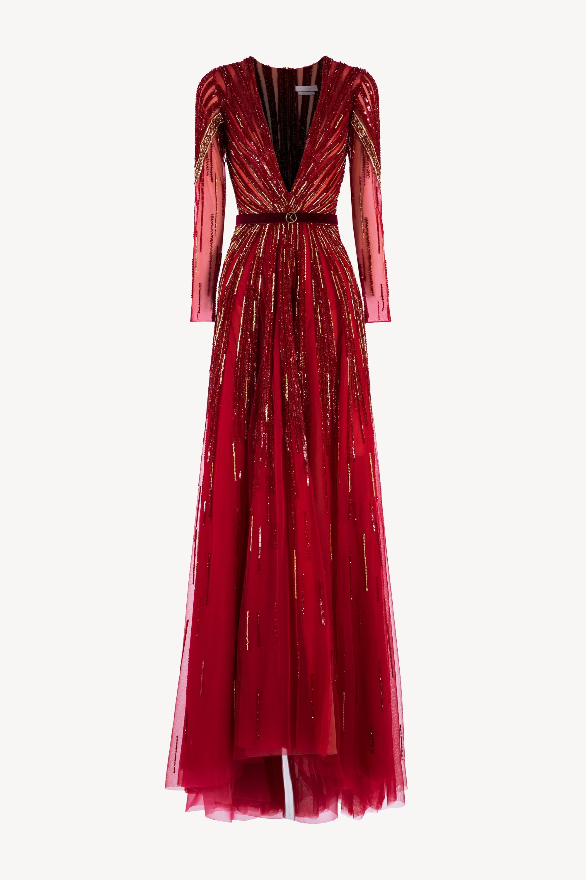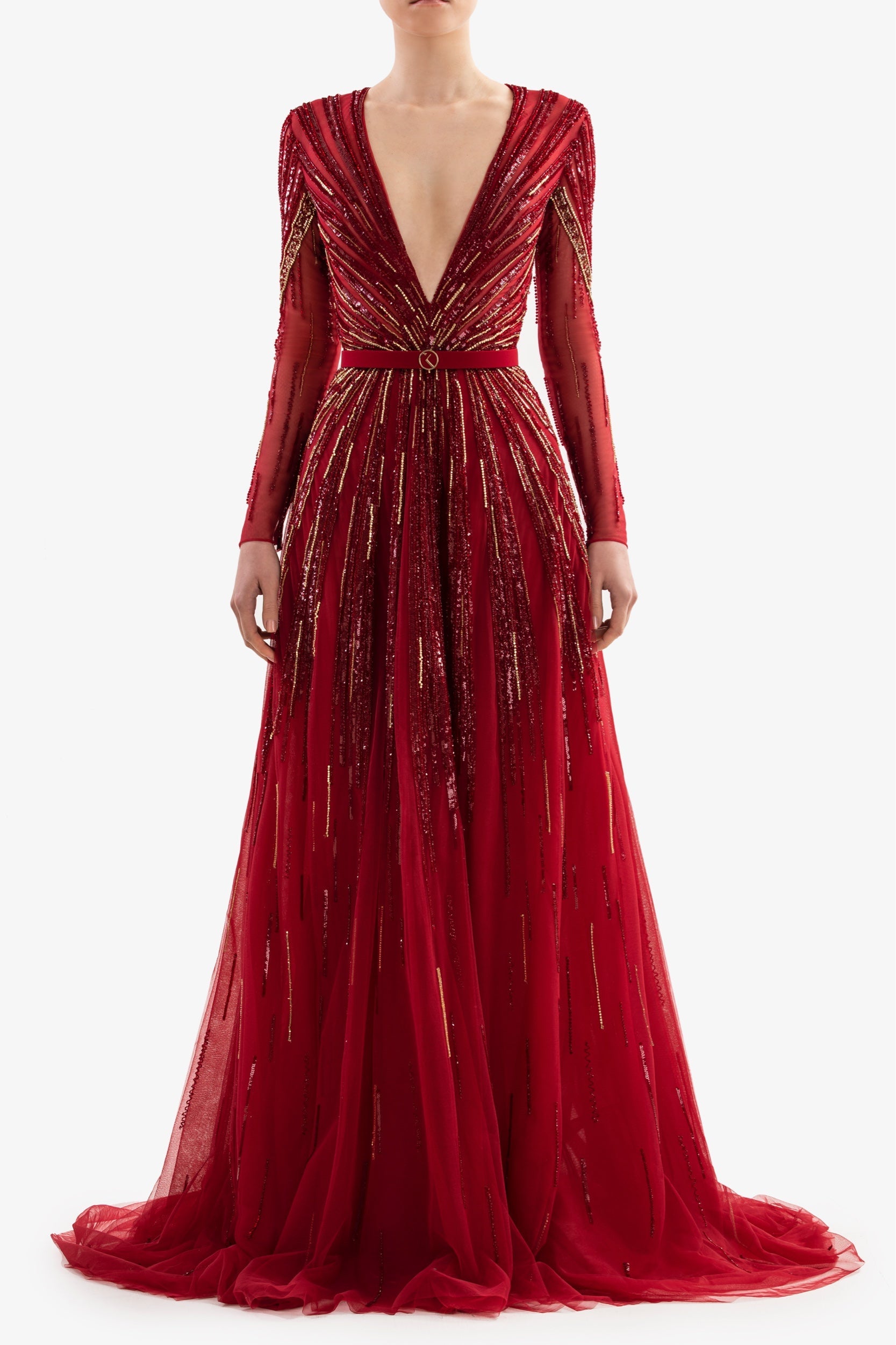 The burgundy and gold embroidered long dress boasts long sleeves, a middle slit, and a deep V neckline. The embroidery is meticulously lined and extends gracefully down to the skirt.