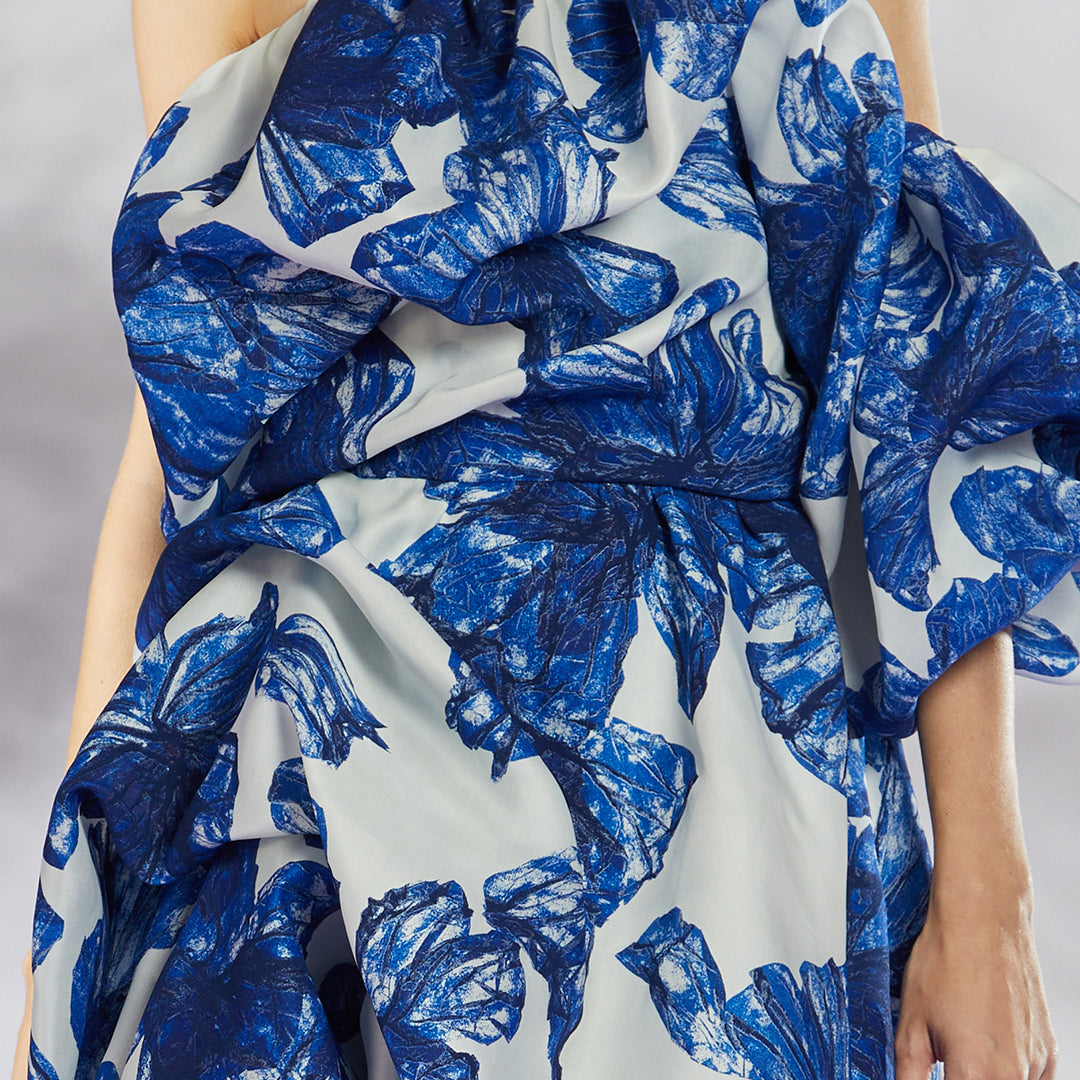 - Embellishments: Blue printed flowers, gathered waist, and subtle puff detailing on the skirt