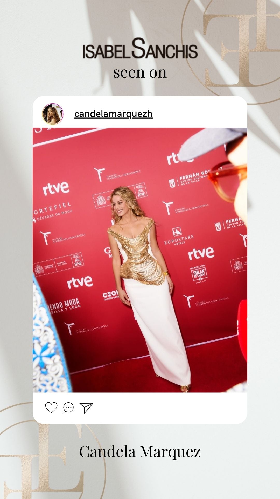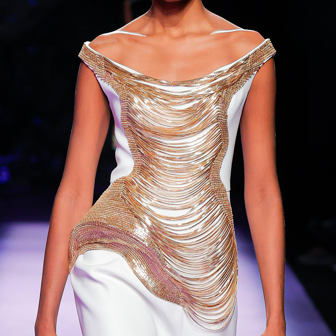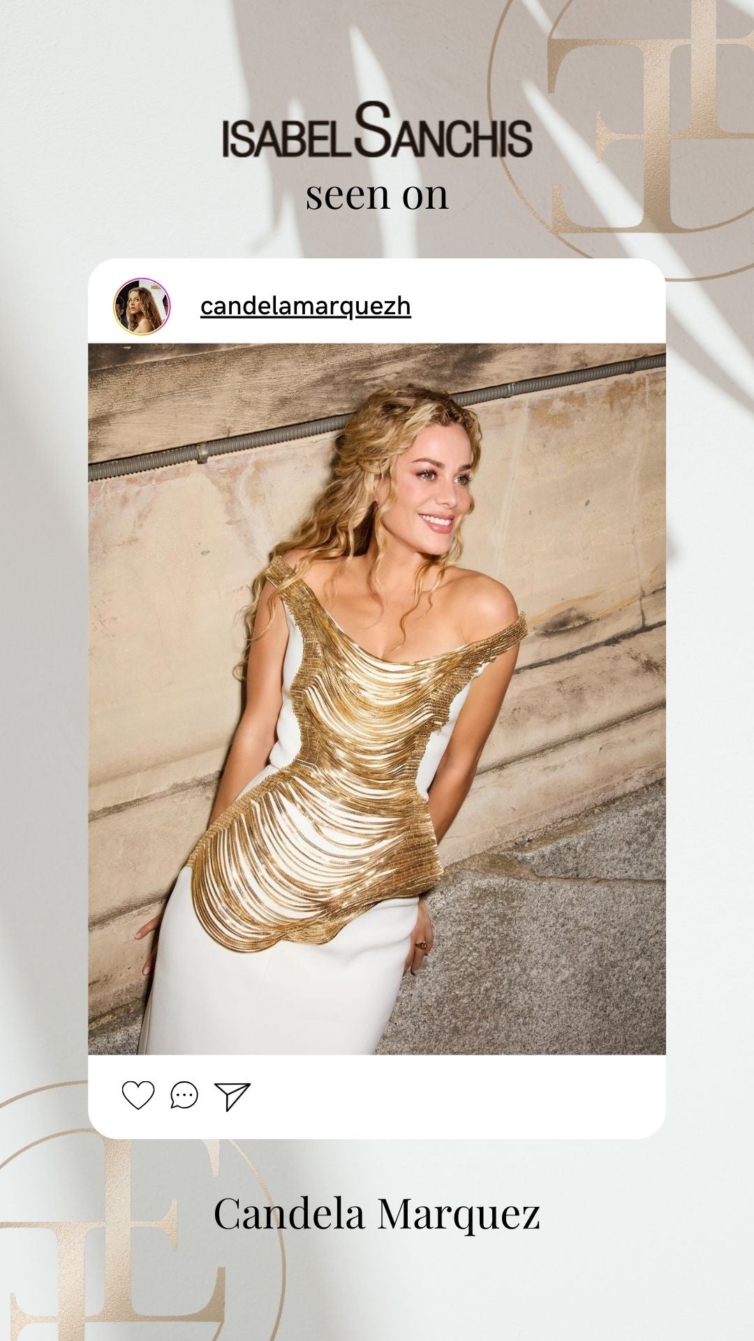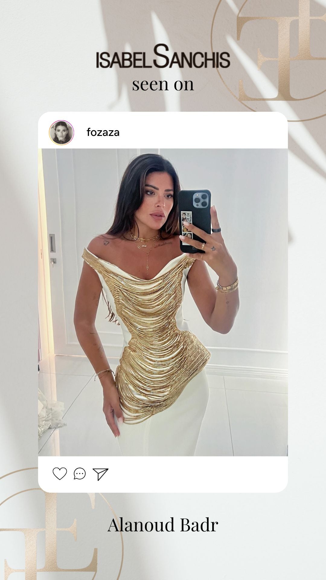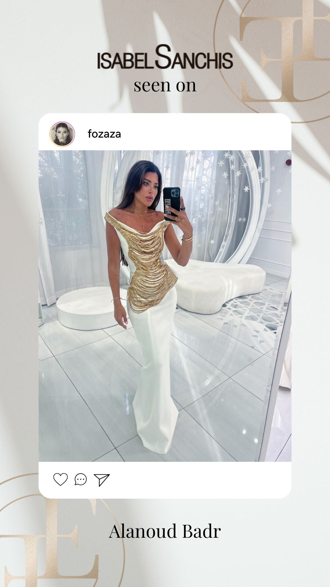 • The off-shoulder design and golden chain detailing offer a modern twist on classic elegance