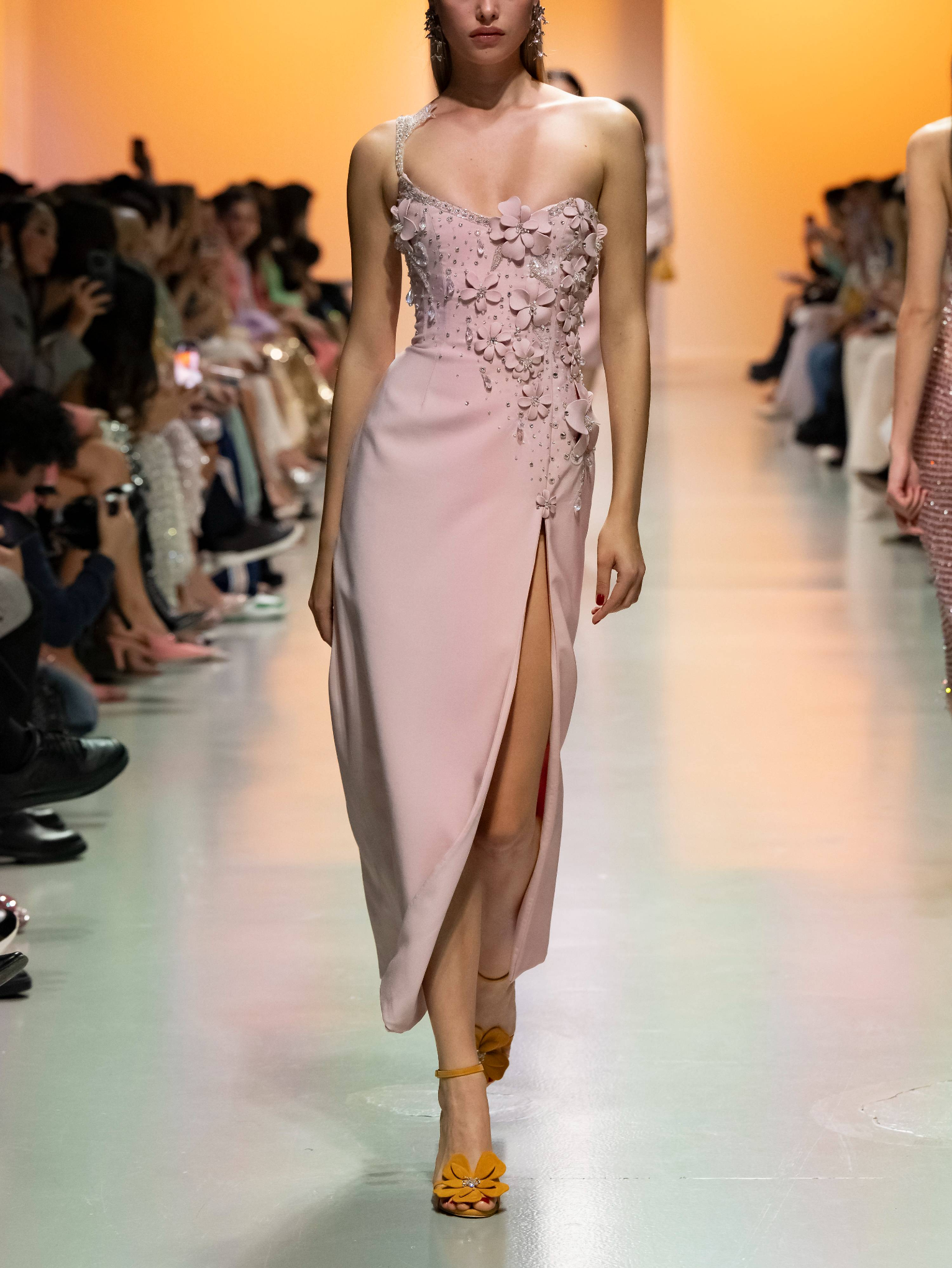 - Embellisehd with 3D fabric flowers, shimmering embroidery and crystal droplets