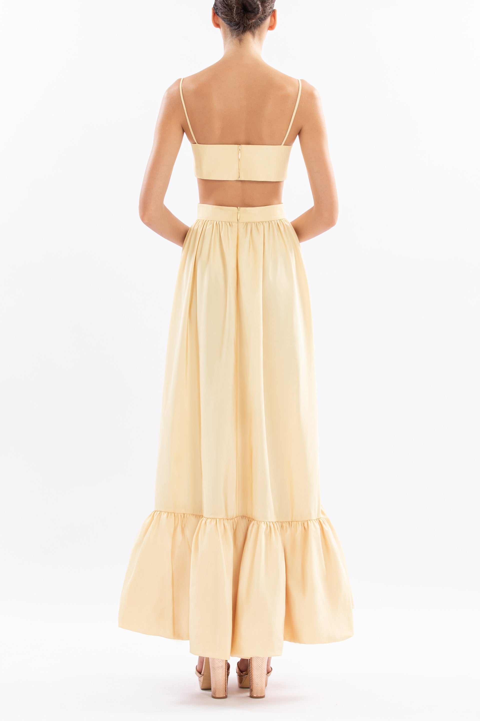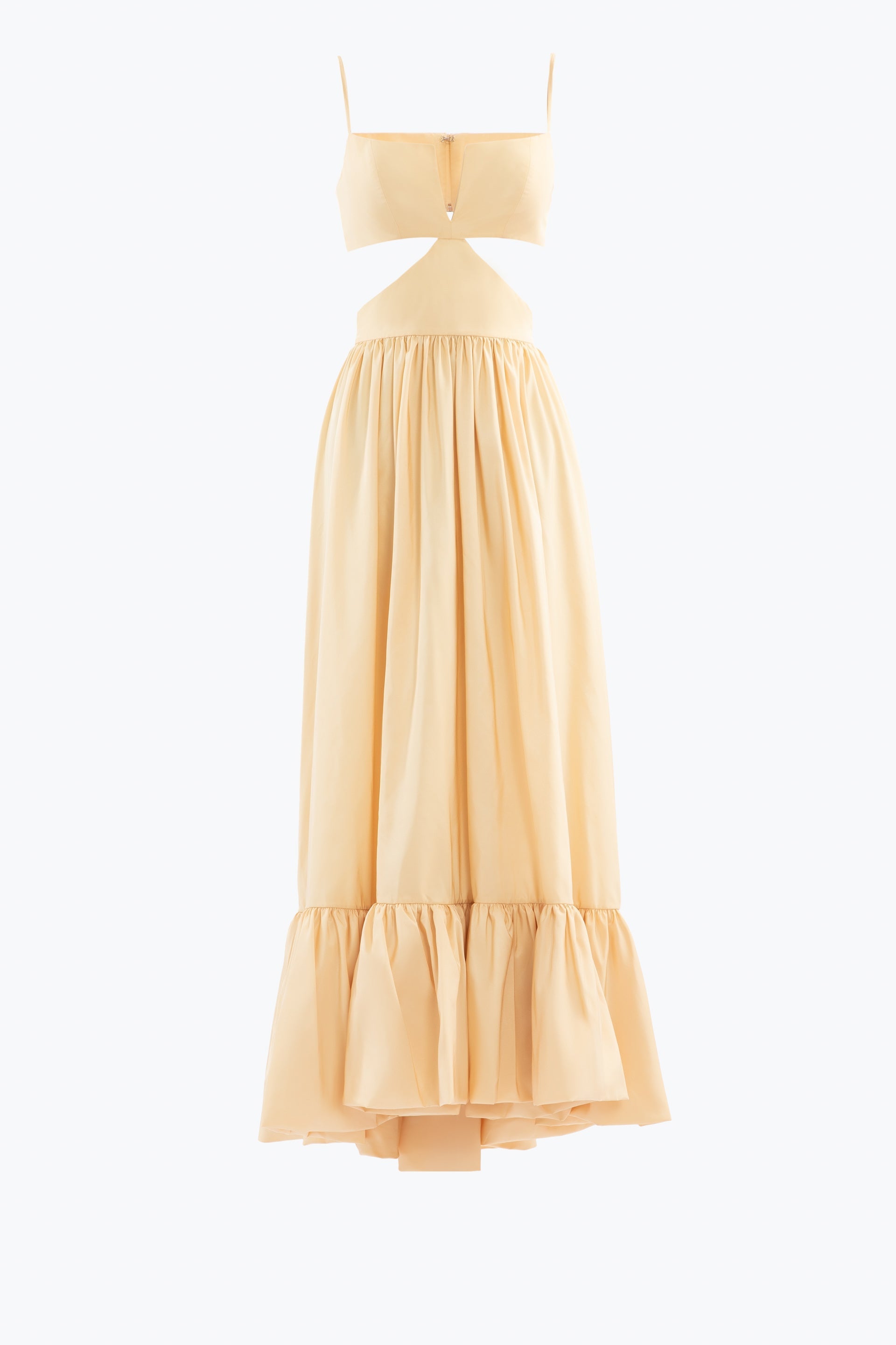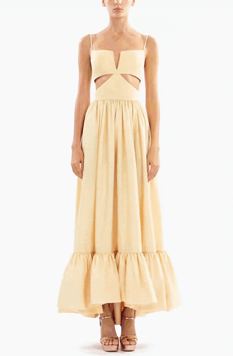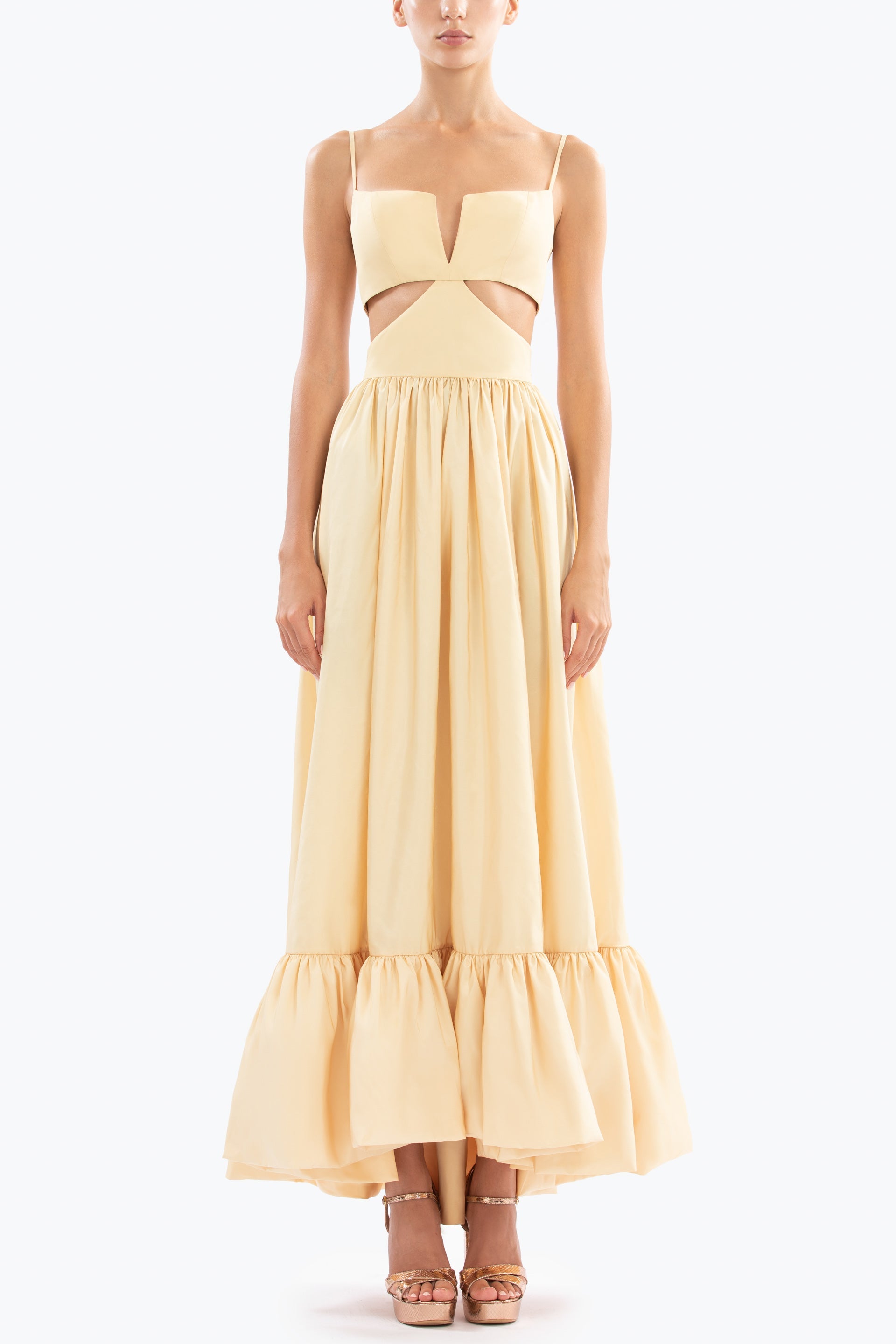 Yellow pear midi taffeta dress features a cutout at the waist and a small V opening at the middle bust. The design includes gathered ruffles along the hemline,