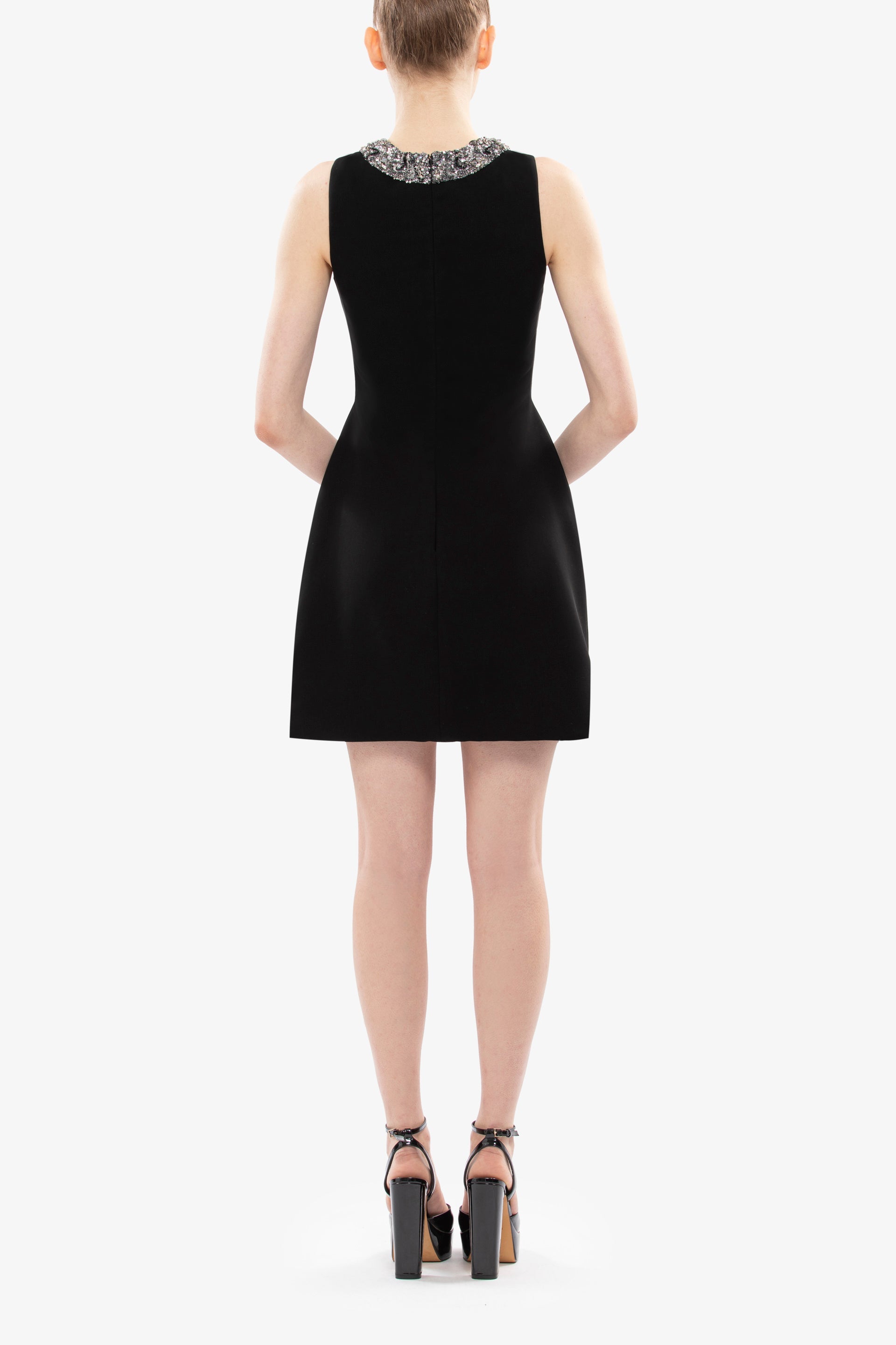 A mini jet-black crepe dress with an embellished neckline, intricately embroidered with sequins, pearls, and beads in silver and anthracite.
