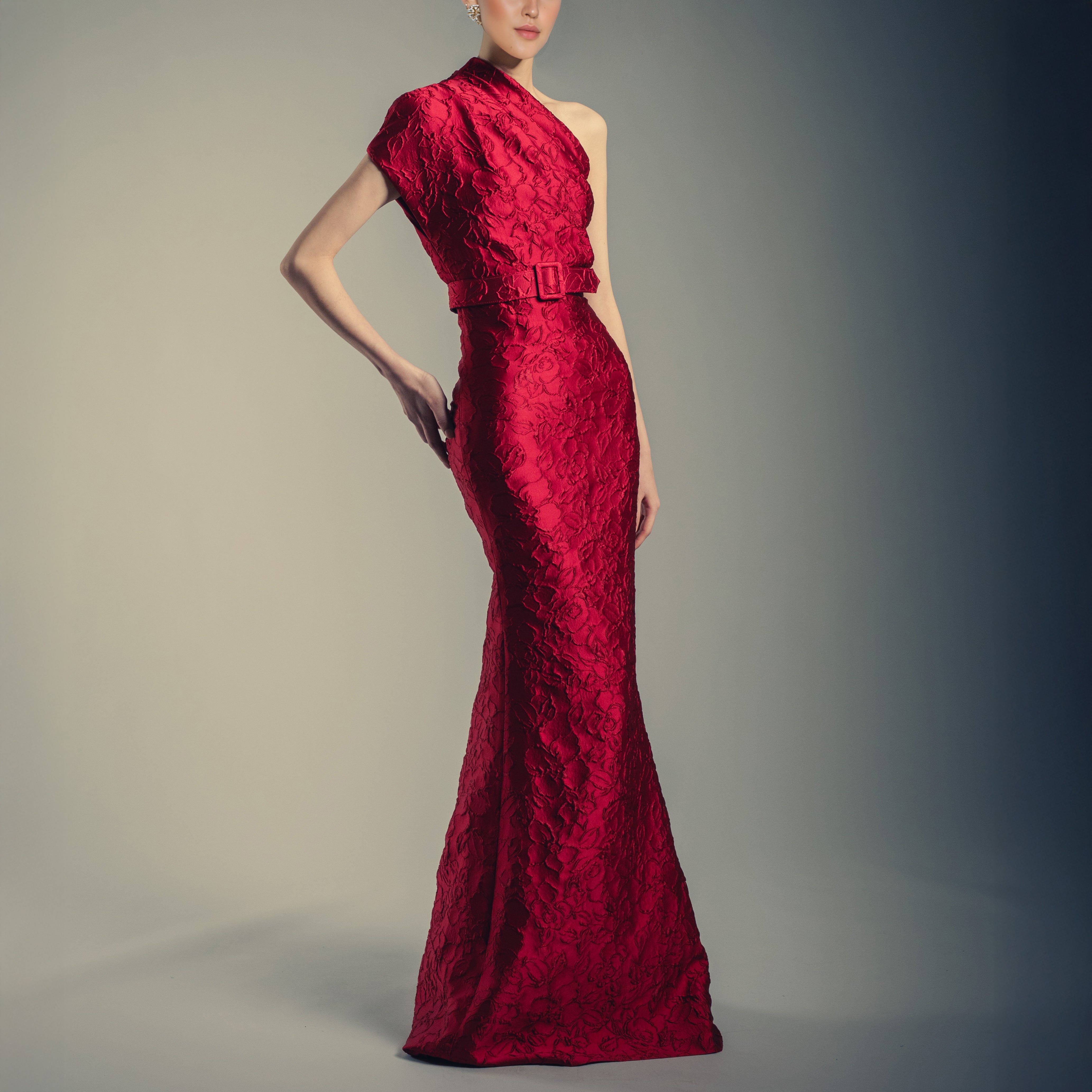 Red One-Shoulder Textured Gown
