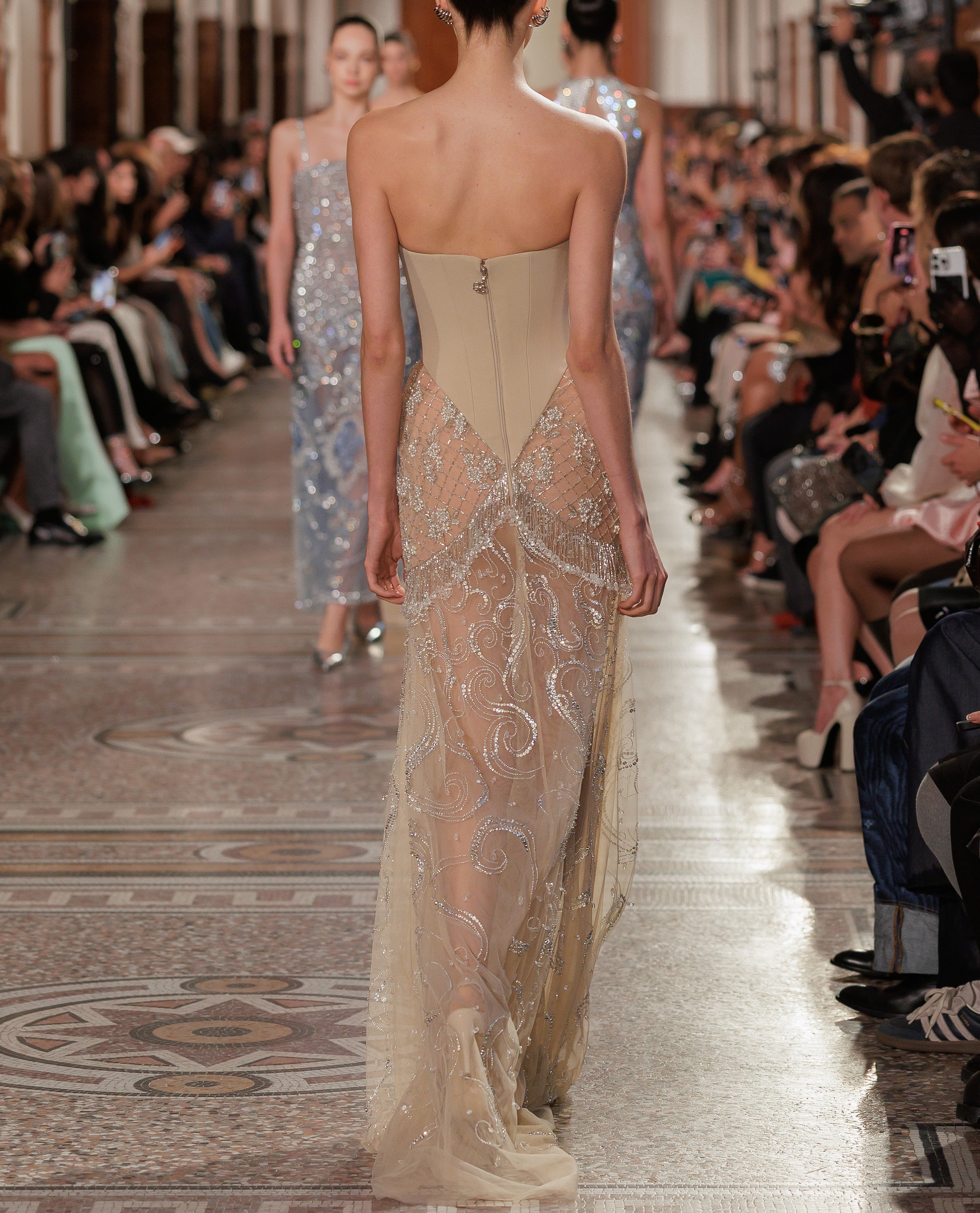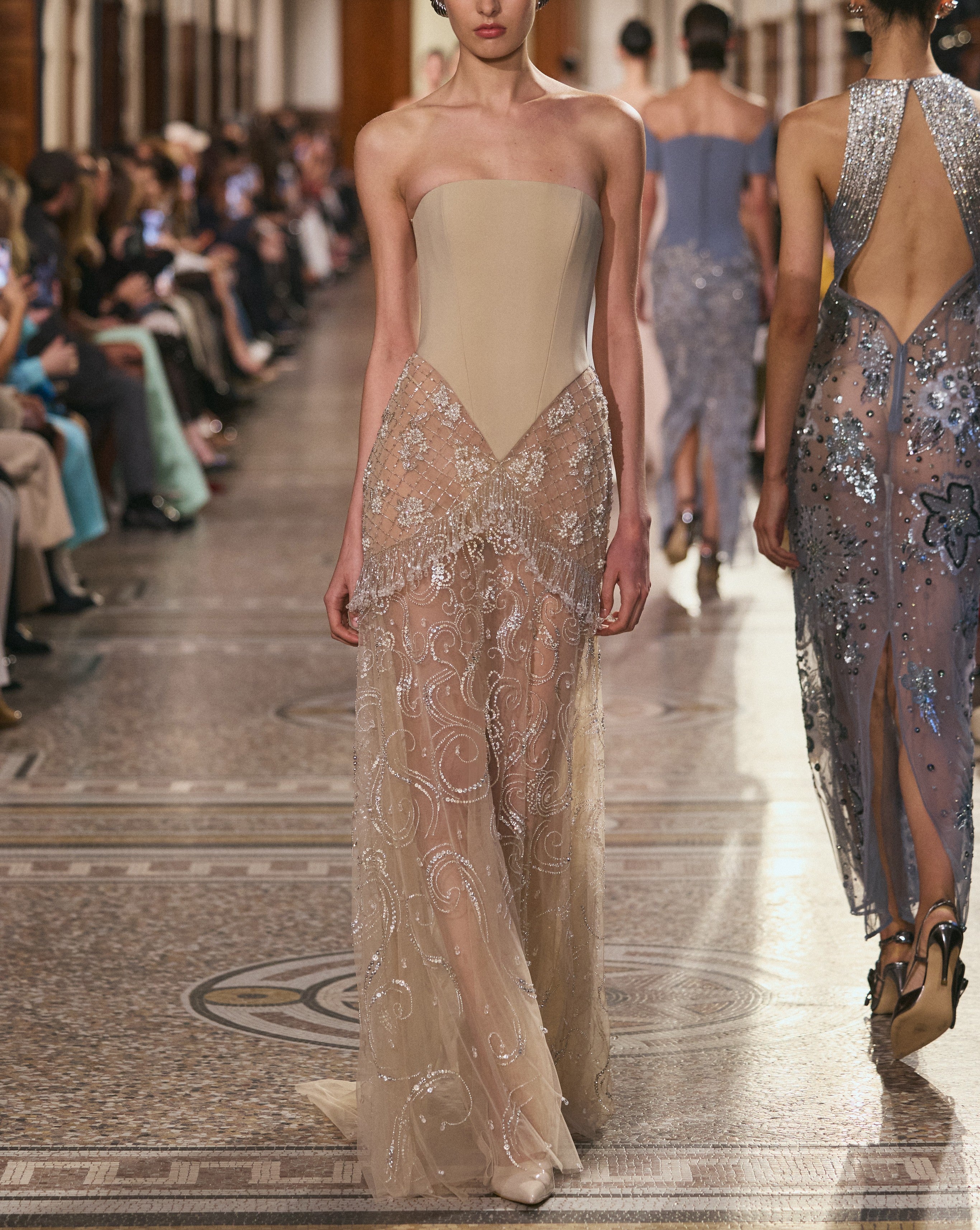 Sheer Skin-Tone Tulle Dress with Gradient Embroidery
