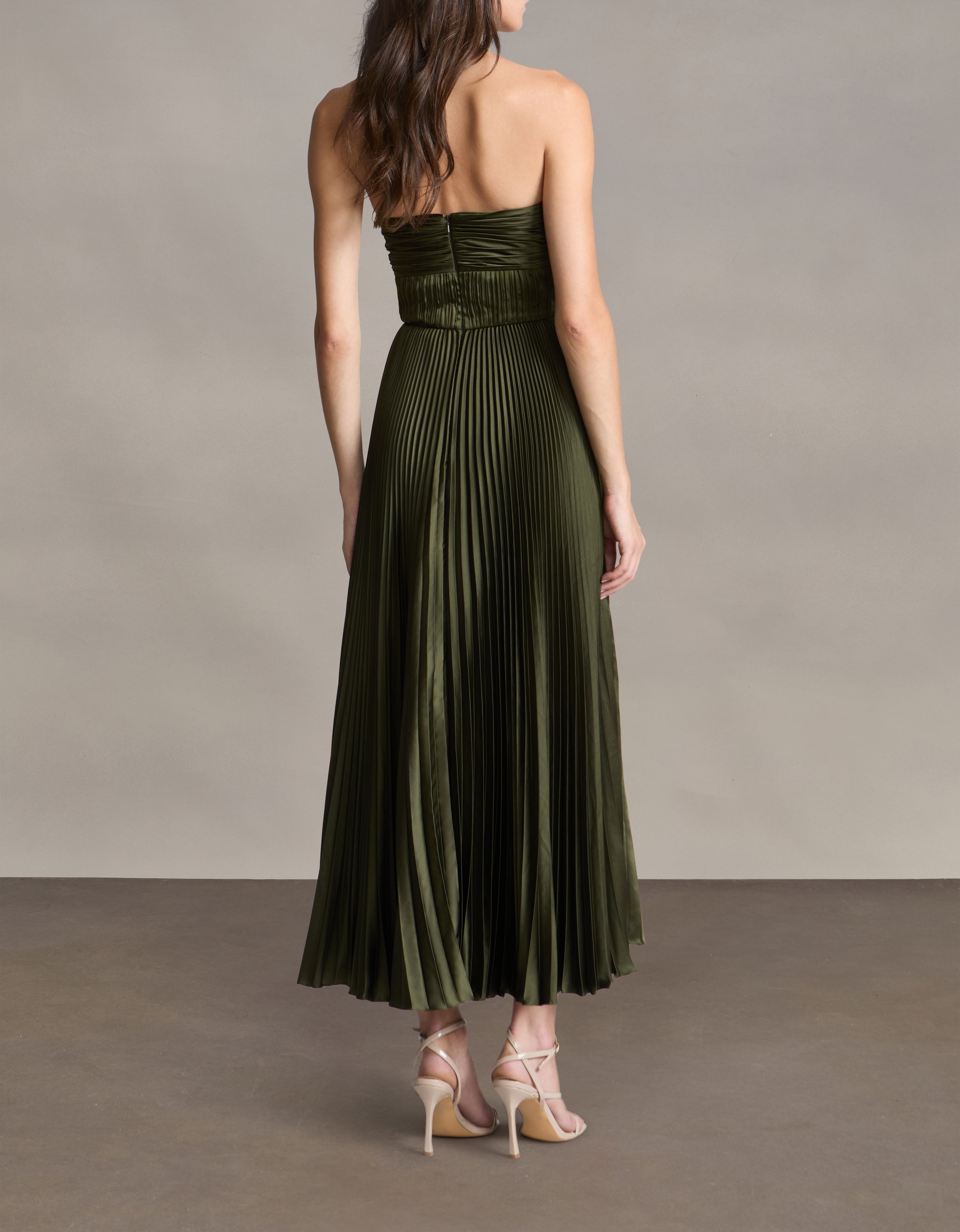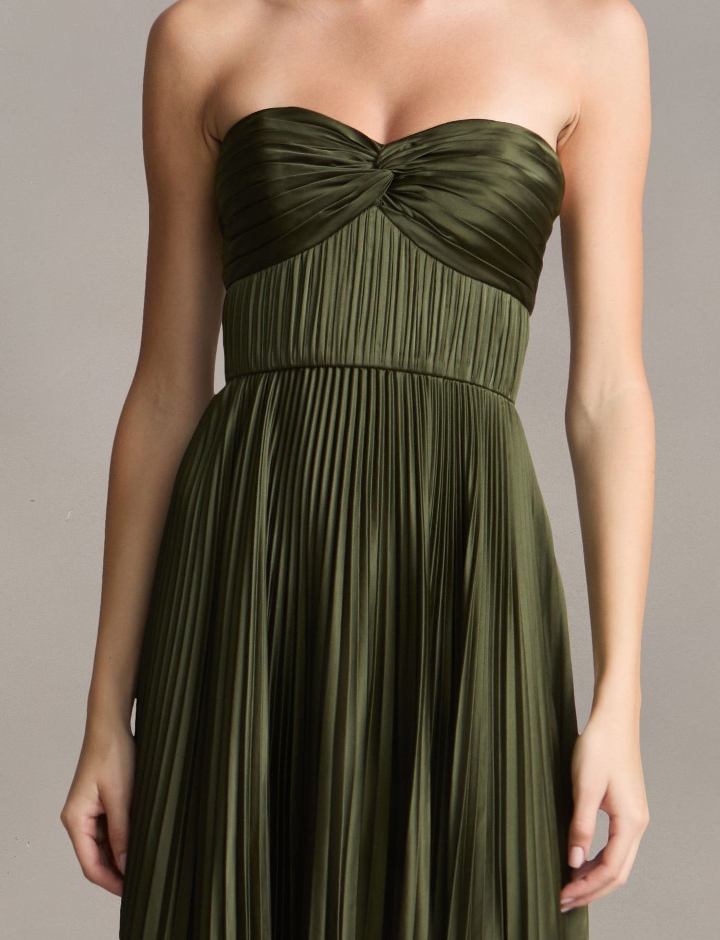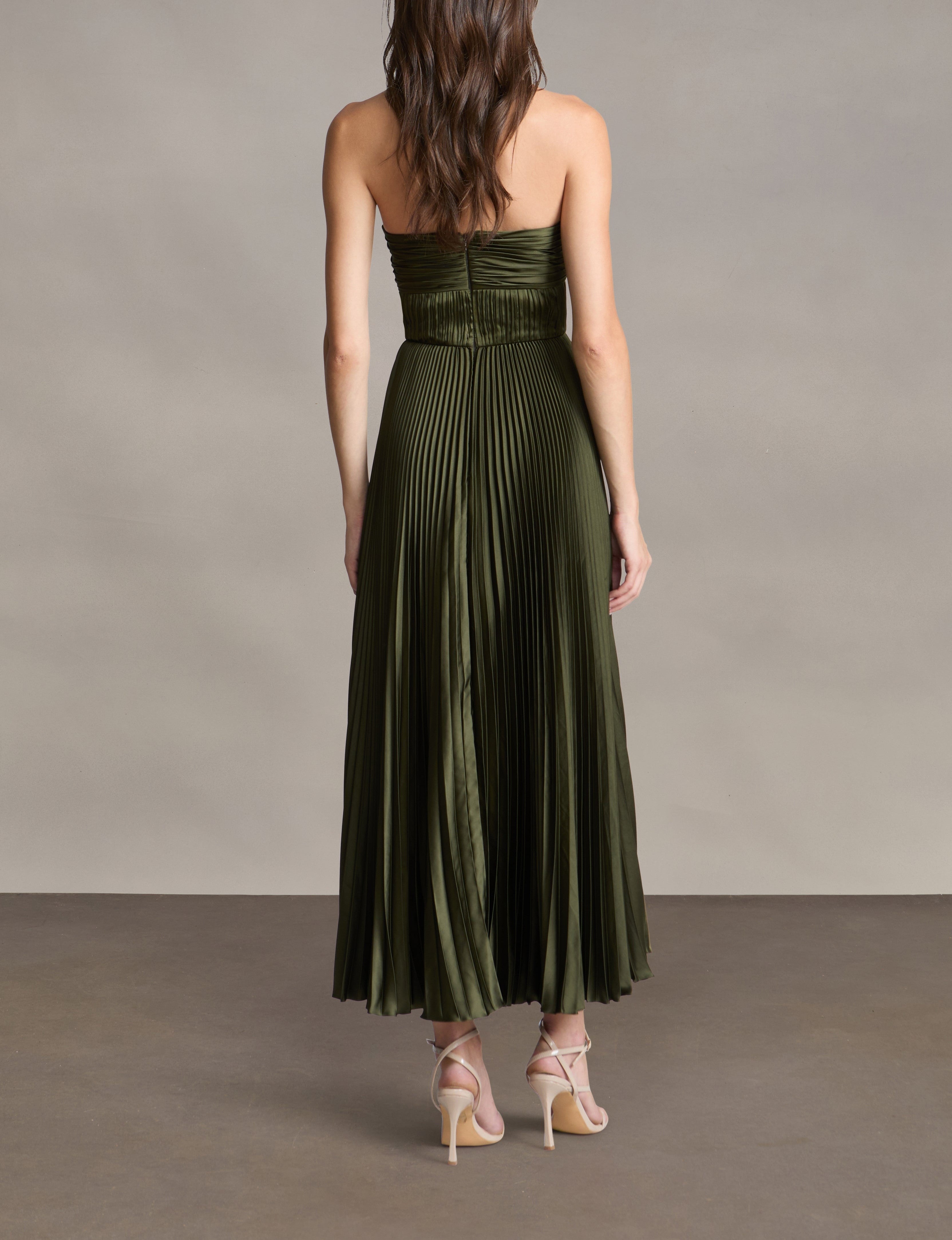 Our bestselling strapless ankle gown returns ”this time in a lush olive hue. Designed with a pleated skirt and flirty sweetheart neckline, it's made to move.