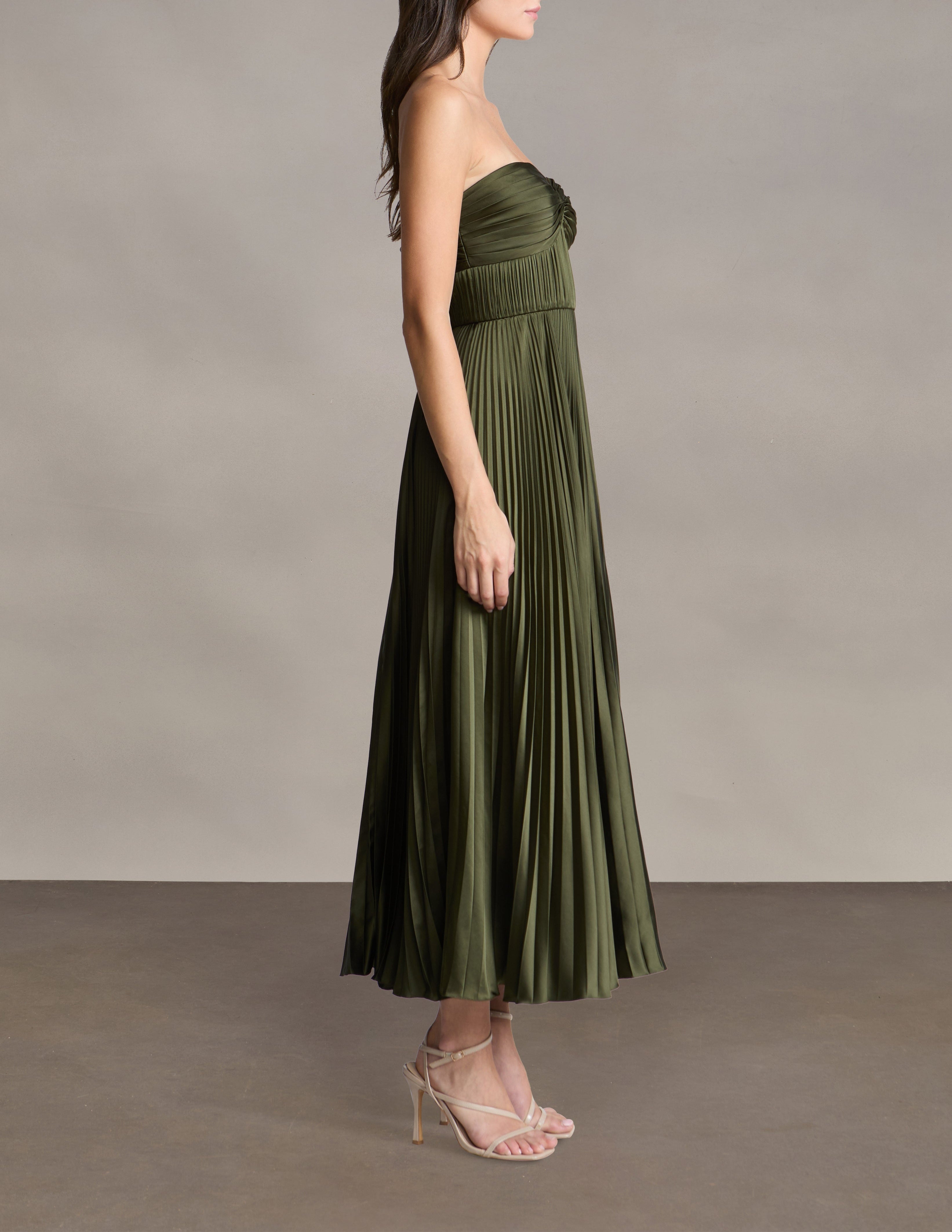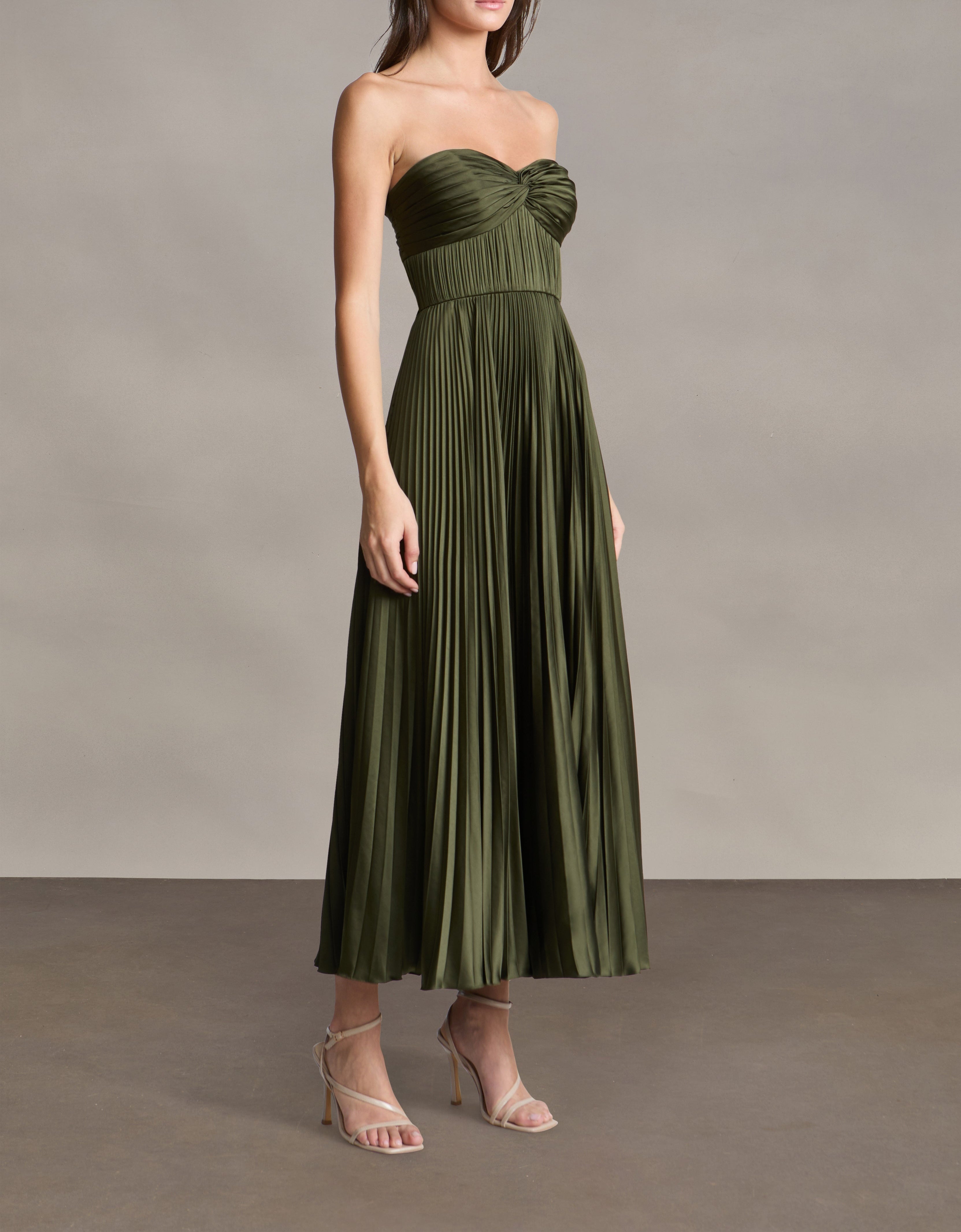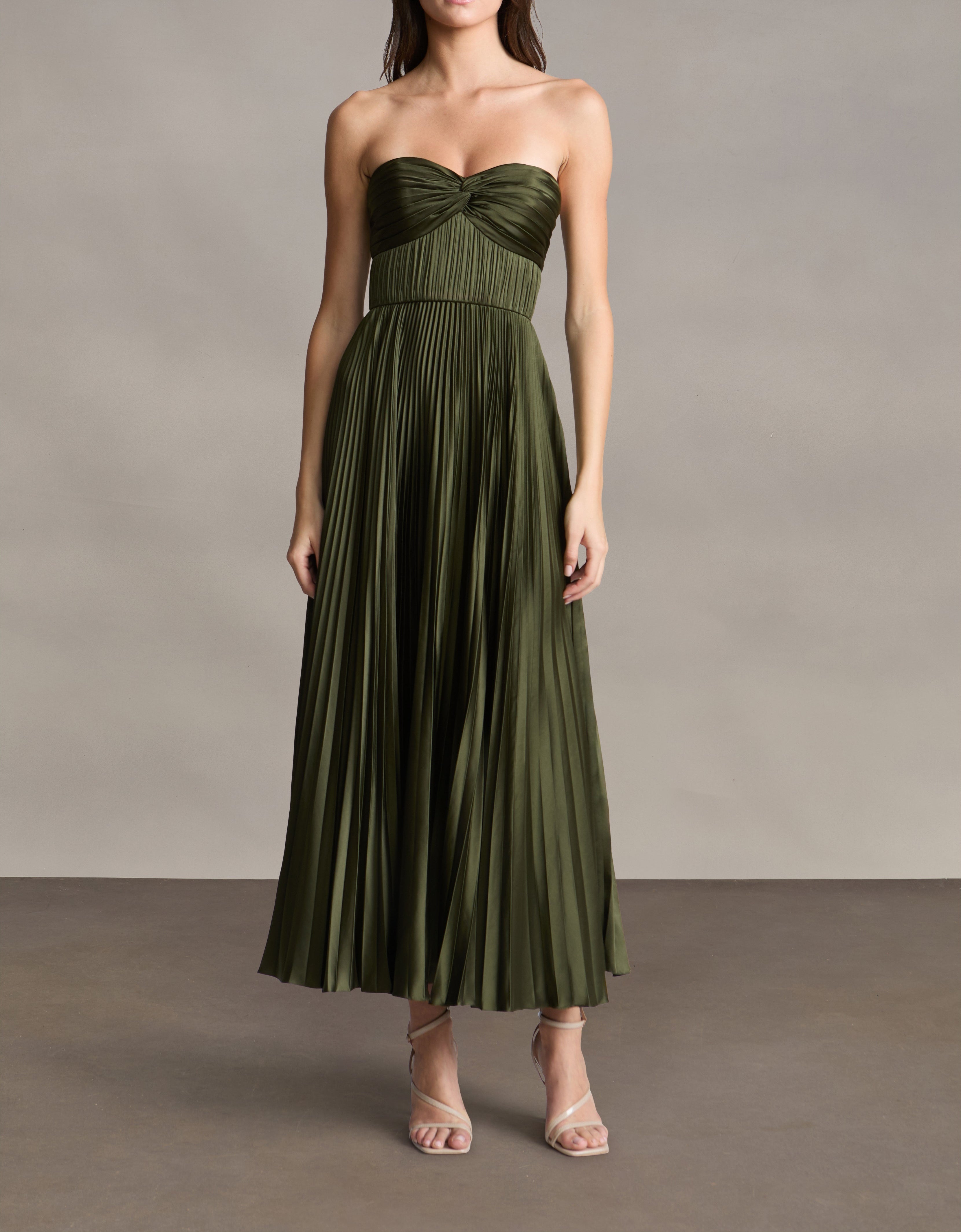 Our bestselling strapless ankle gown returns ”this time in a lush olive hue. Designed with a pleated skirt and flirty sweetheart neckline, it's made to move.