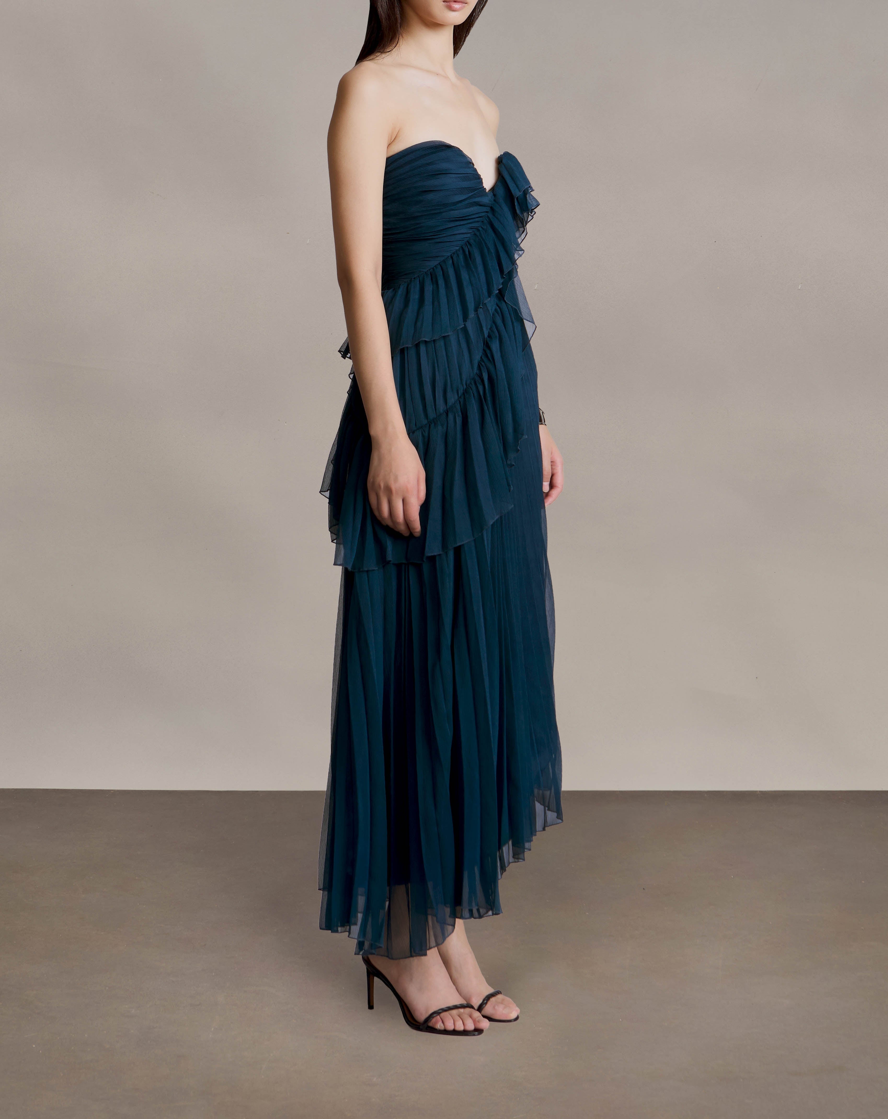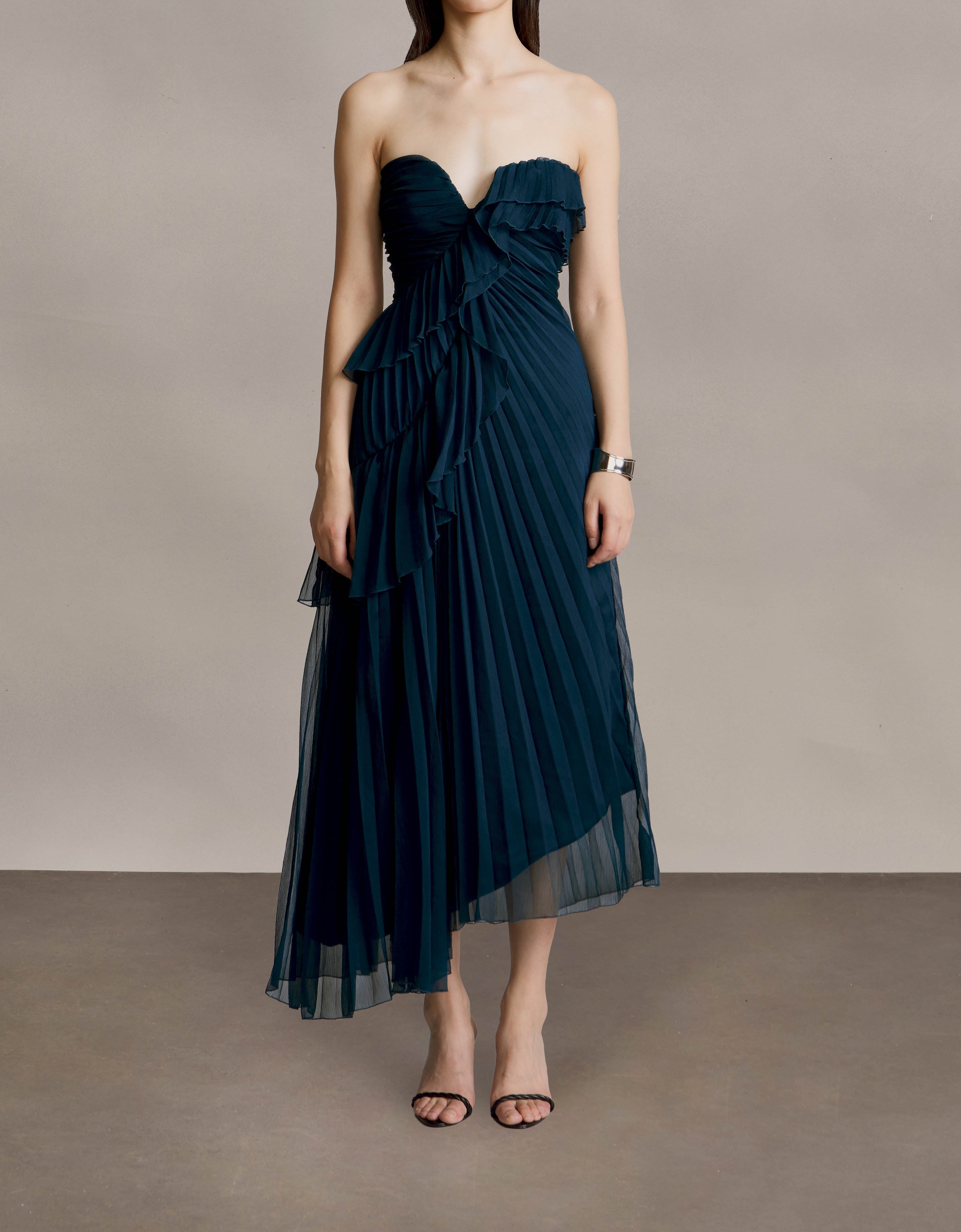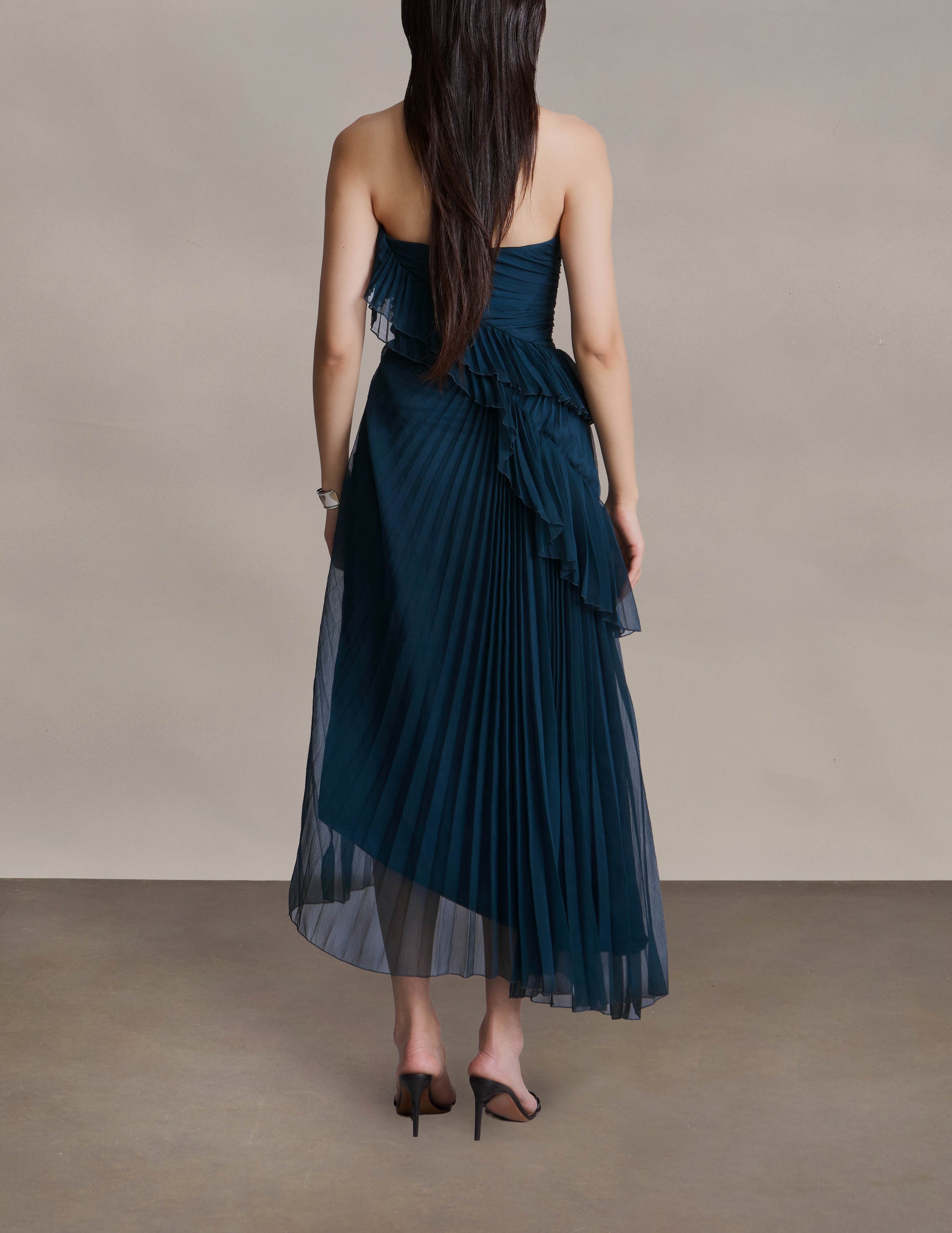 Crafted from airy chiffon, this strapless midi features a ruched sweetheart bodice and a cascade of pleats trimmed with delicate pearl-stitched edges. Flowy, flirty, and ready for any RSVP that calls for a little charm.