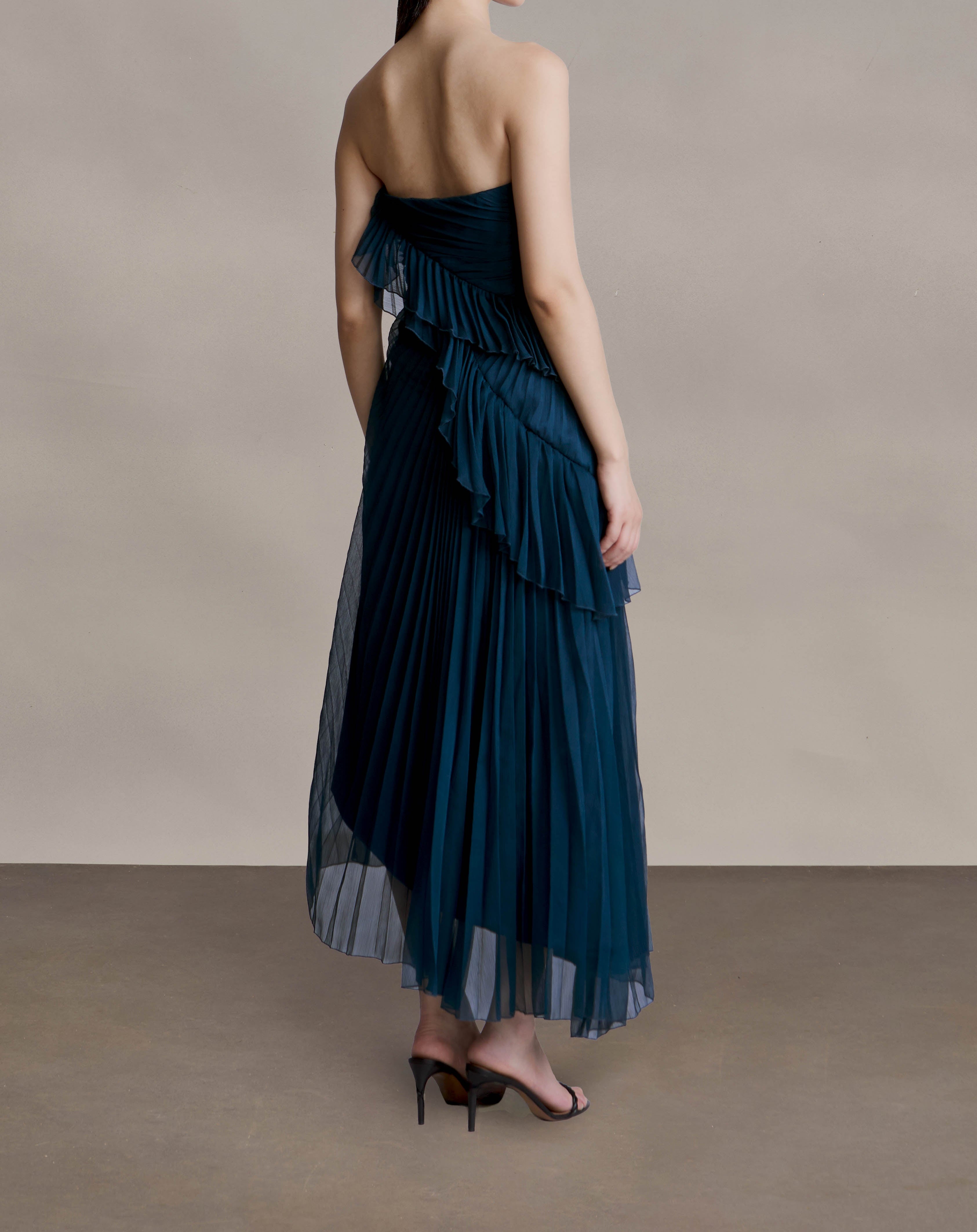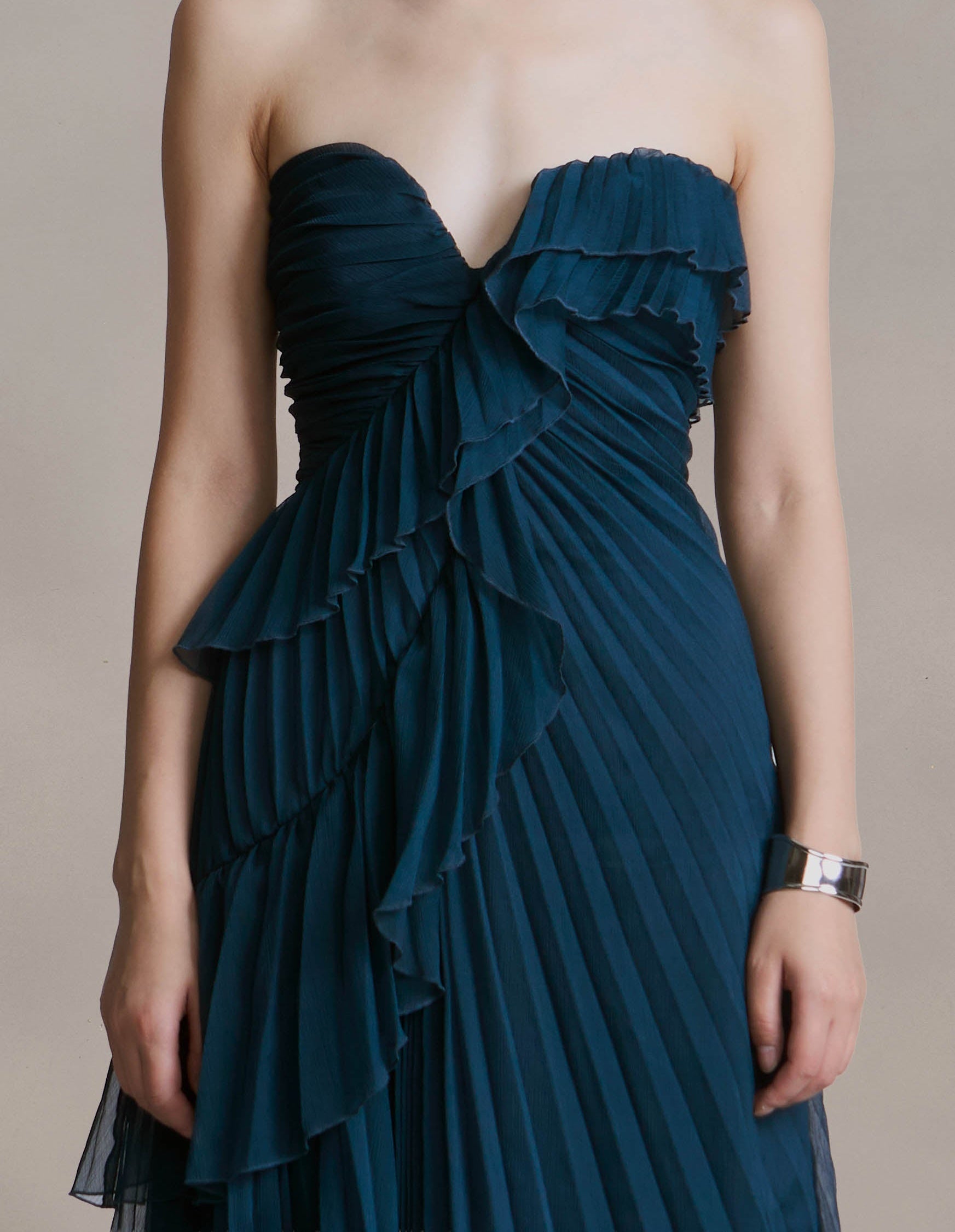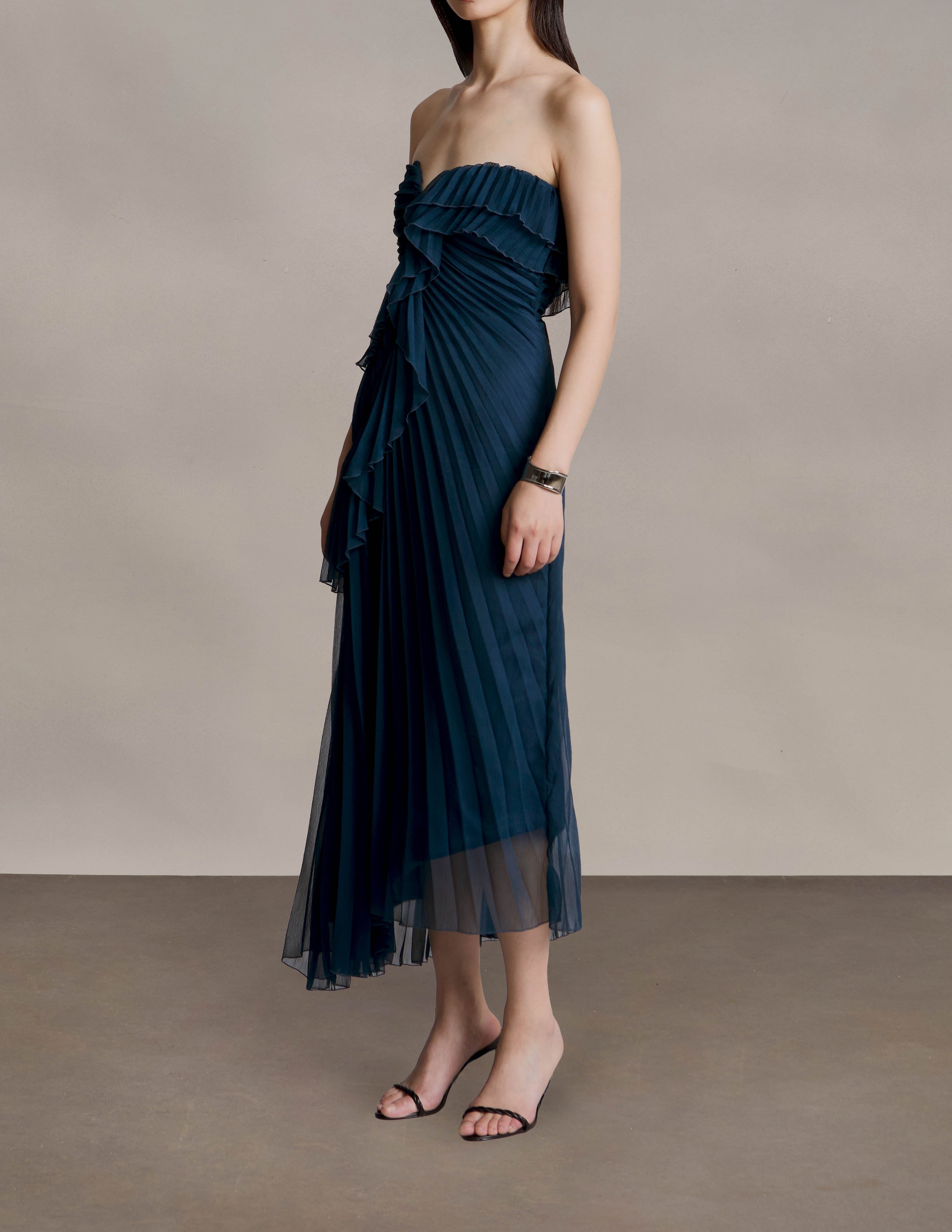 Crafted from airy chiffon, this strapless midi features a ruched sweetheart bodice and a cascade of pleats trimmed with delicate pearl-stitched edges. Flowy, flirty, and ready for any RSVP that calls for a little charm.