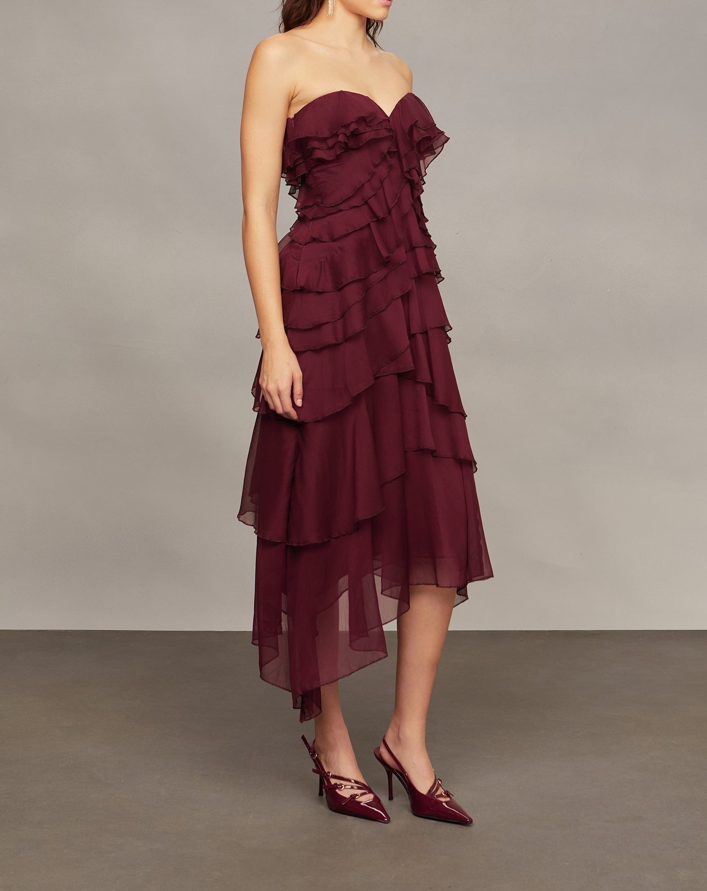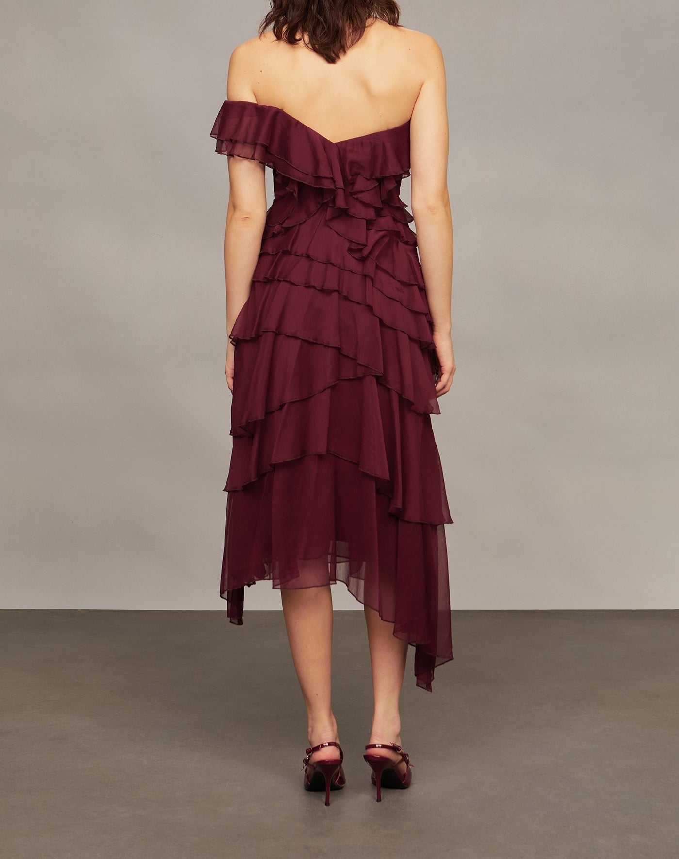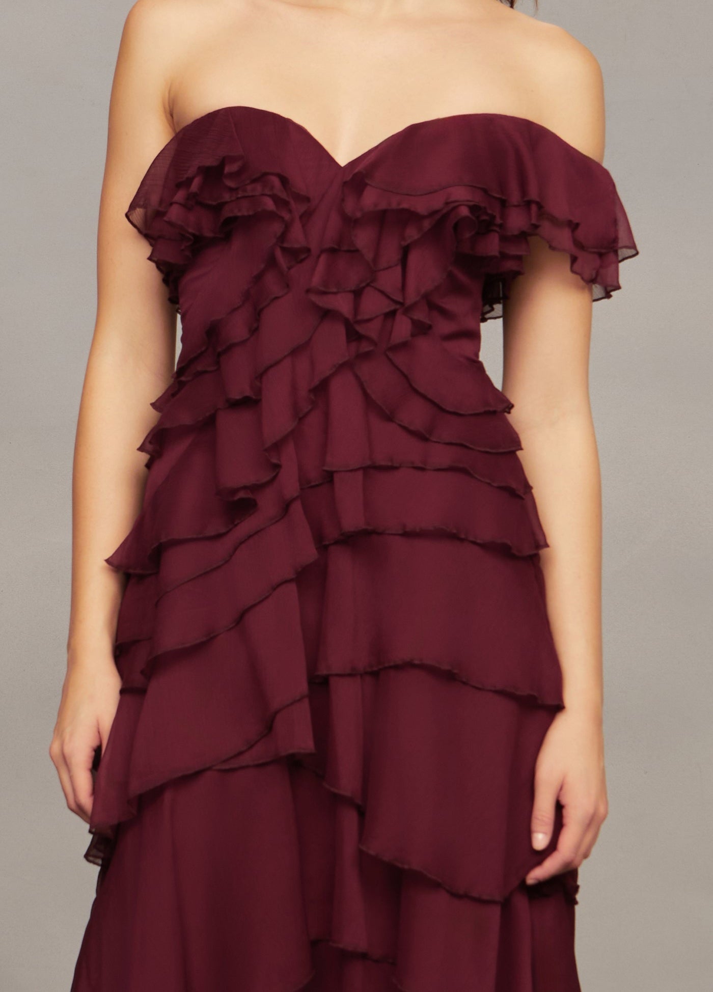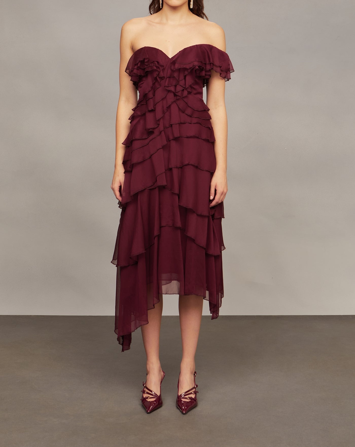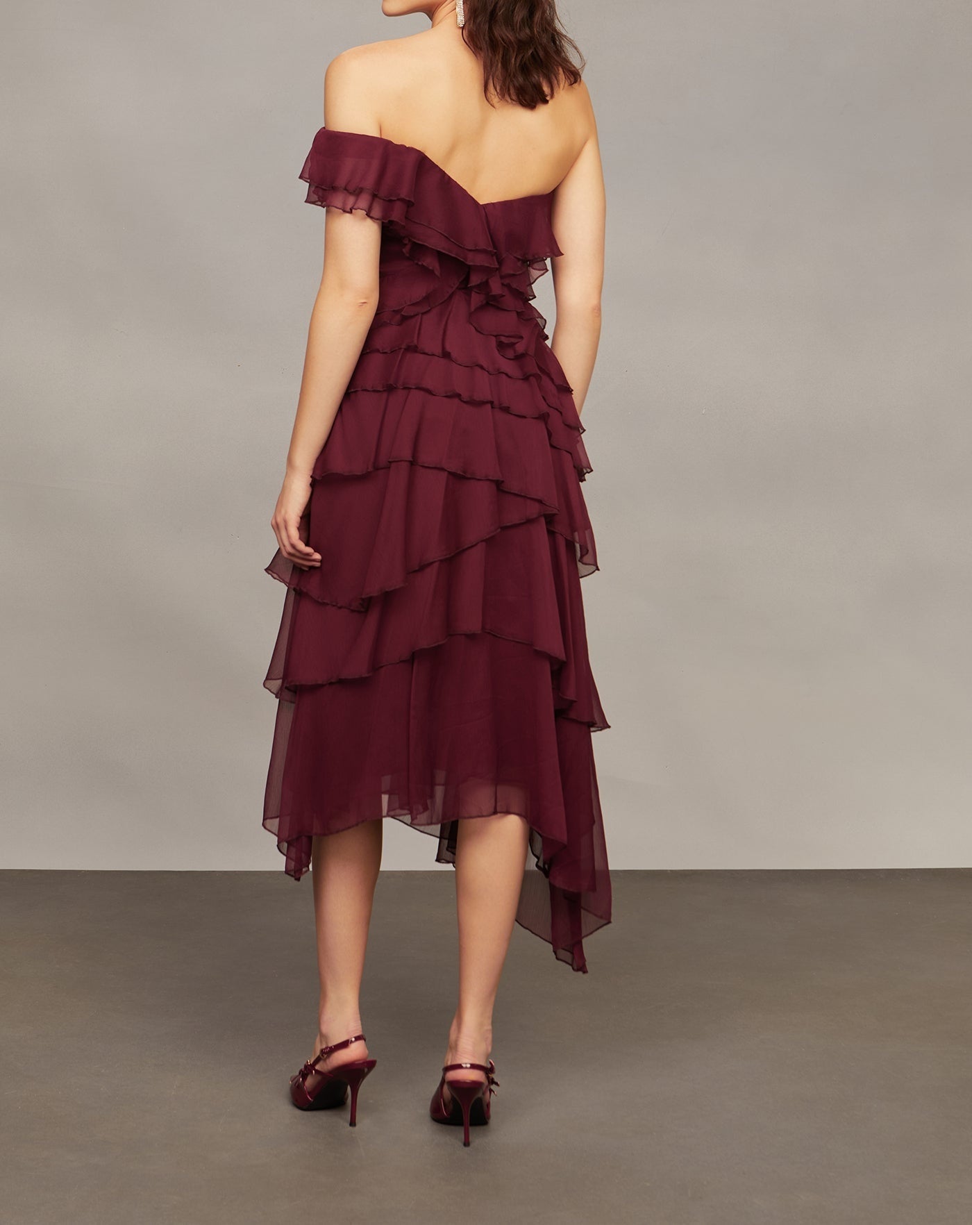 - Crafted in crinkle chiffon, this off-the-shoulder midi is tiered to perfection with cascading layers and an angled hem. The sweetheart neckline seals the deal”wear it when you want to look low-effort but absolutely serve.