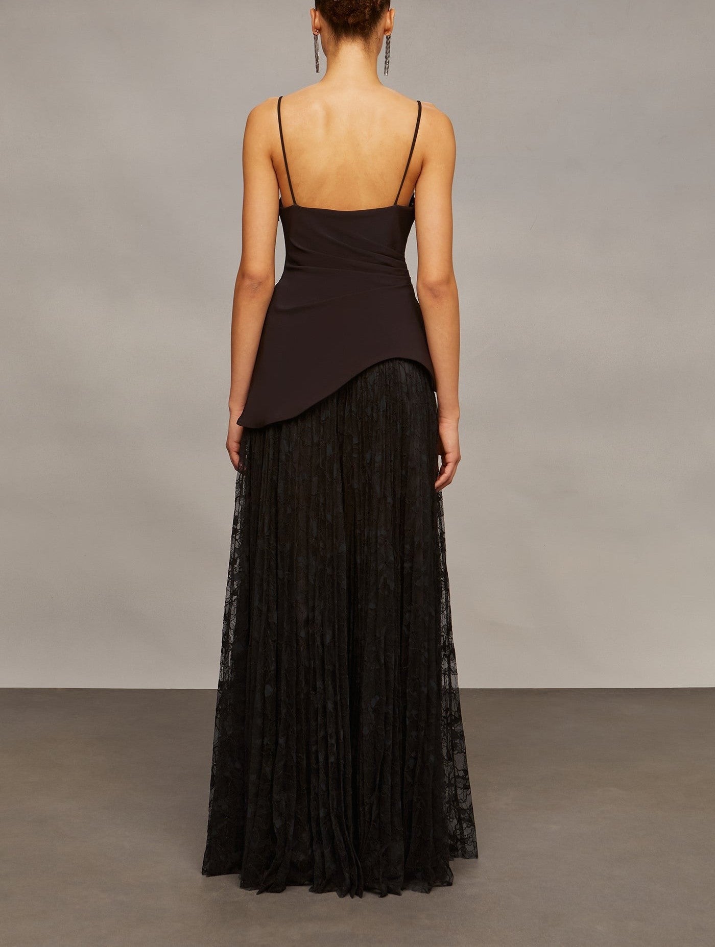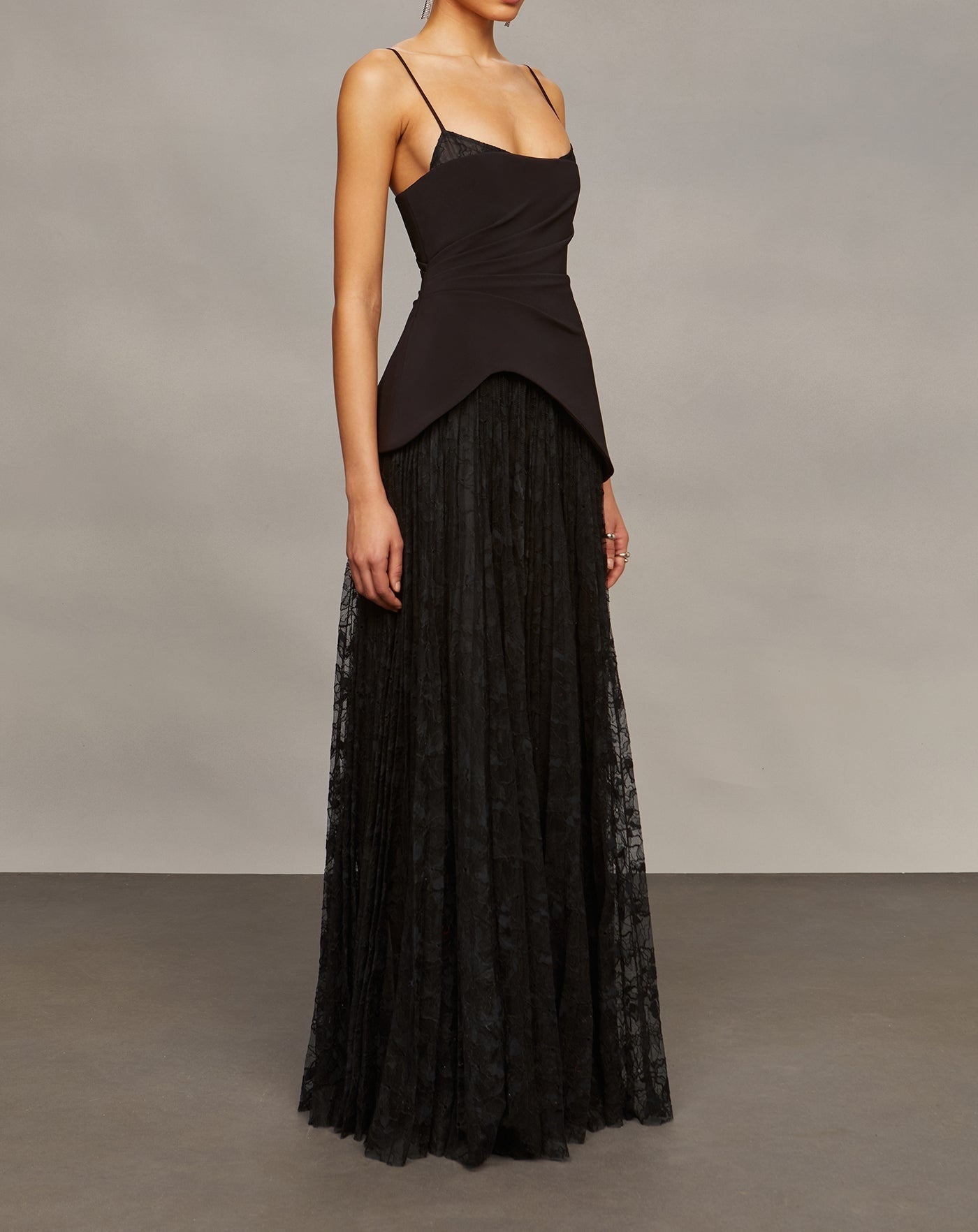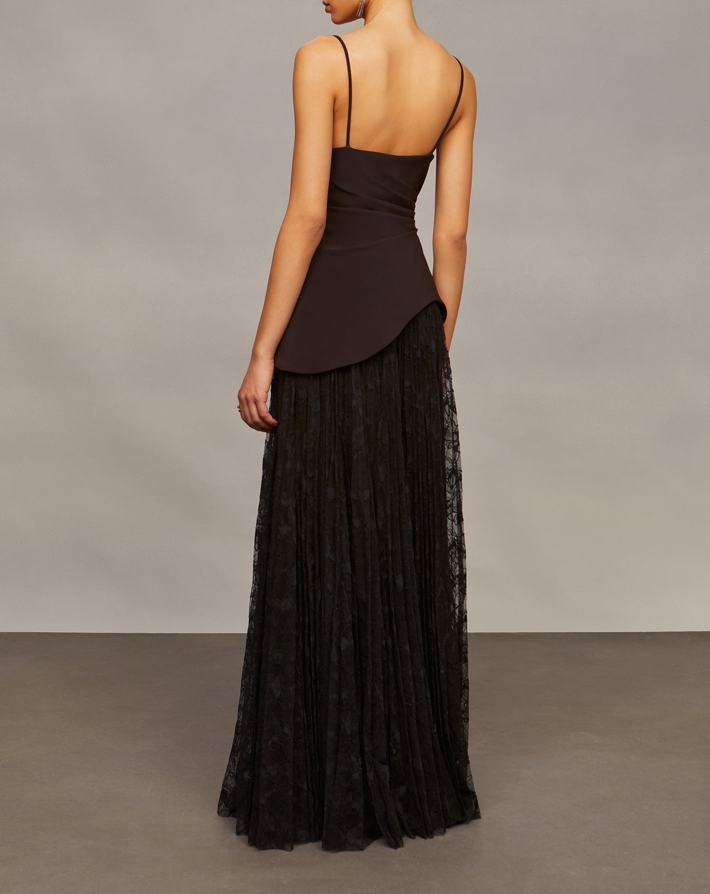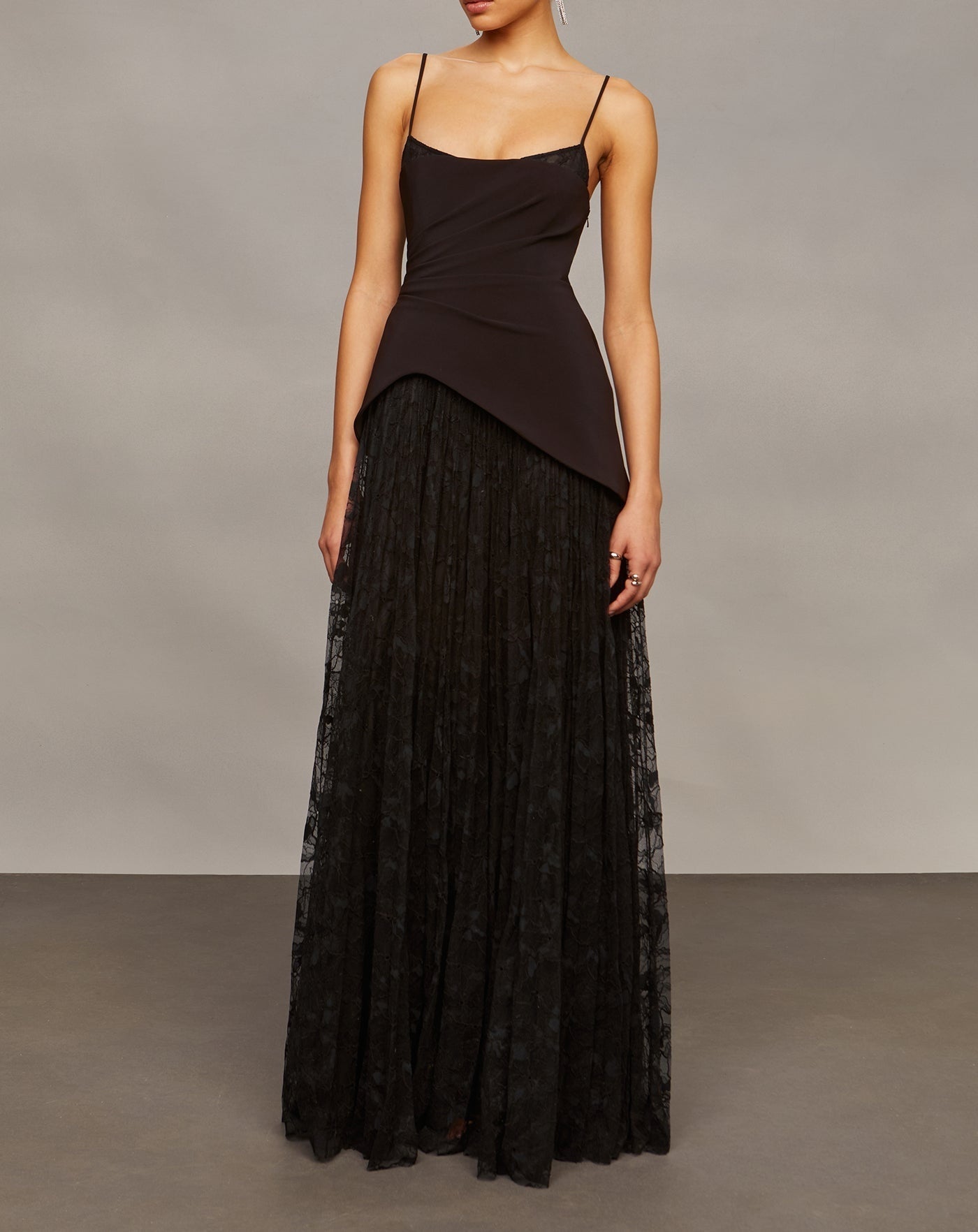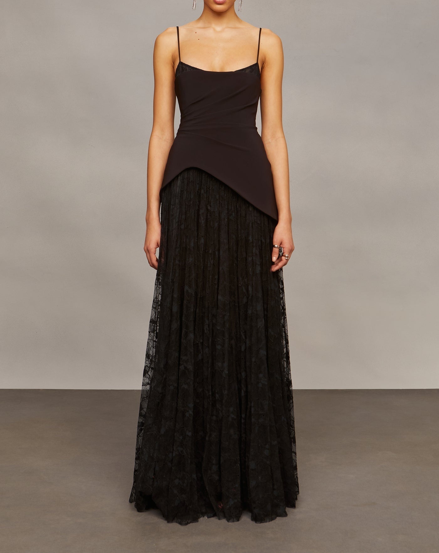 With its sculpted bodice and full floral lace skirt, this gown balances structure and softness in all the right places. The faux bralette detail adds a wink”because subtle isnt always the vibe.