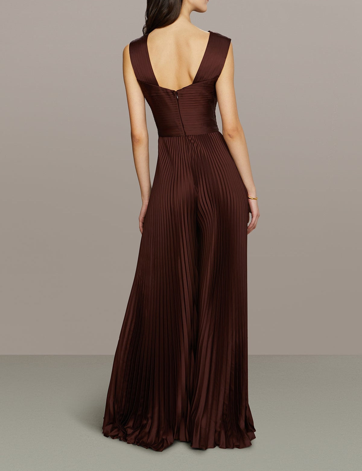 high neck, jumpsuit silhouette, floor length, sleeveless