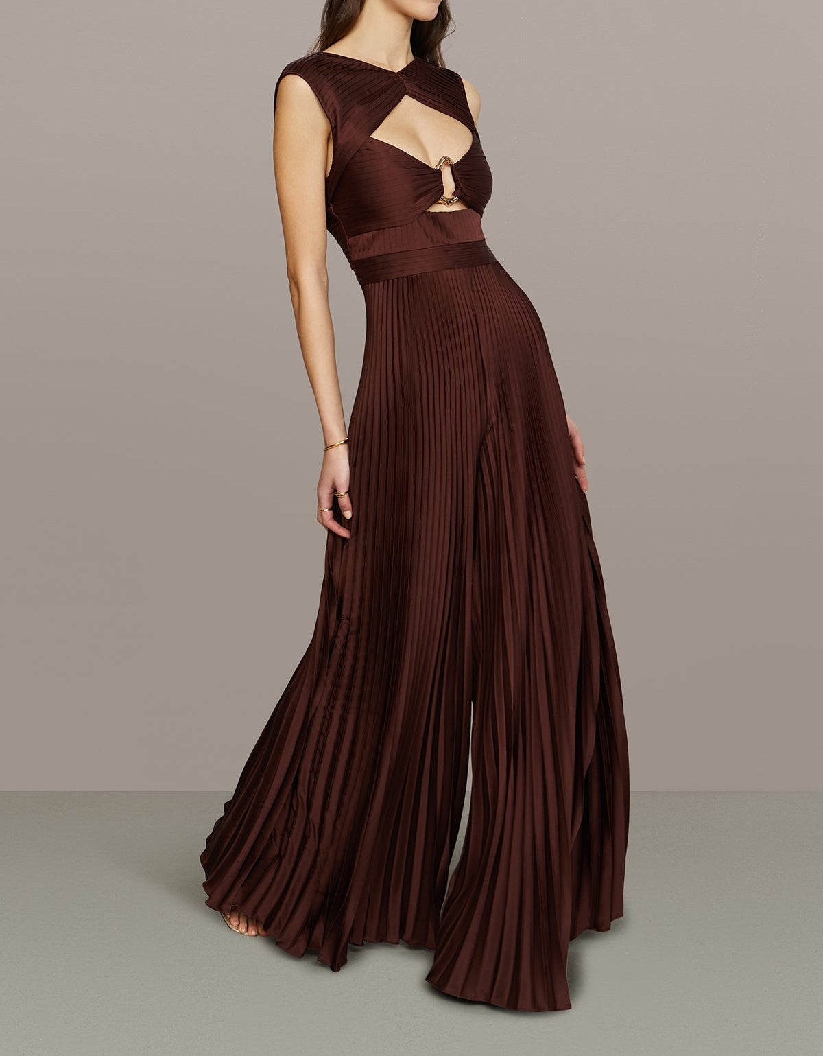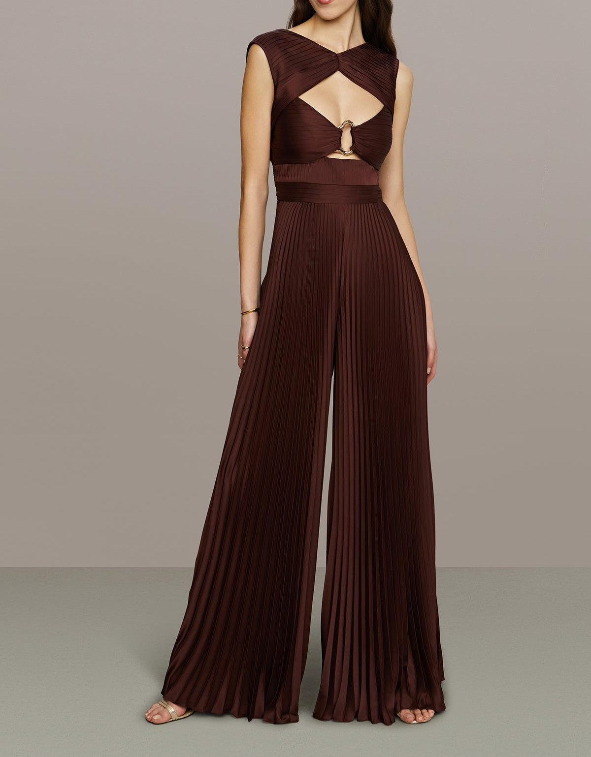- Crafted from a liquid-like fabric that drapes effortlessly, this jumpsuit features sculptural ring hardware and artful cut-outs”striking the perfect balance between fluid coverage and bold allure.