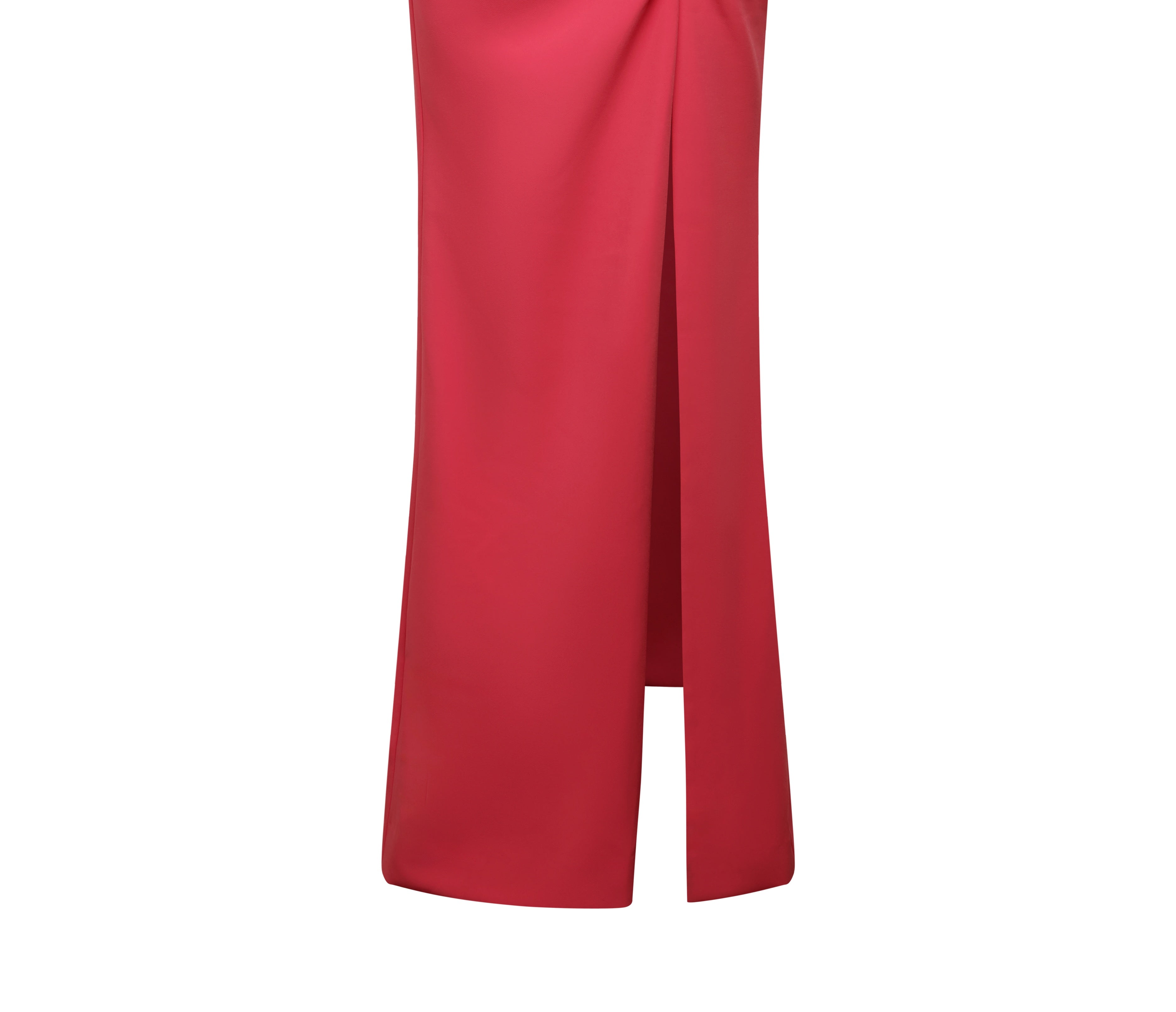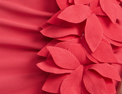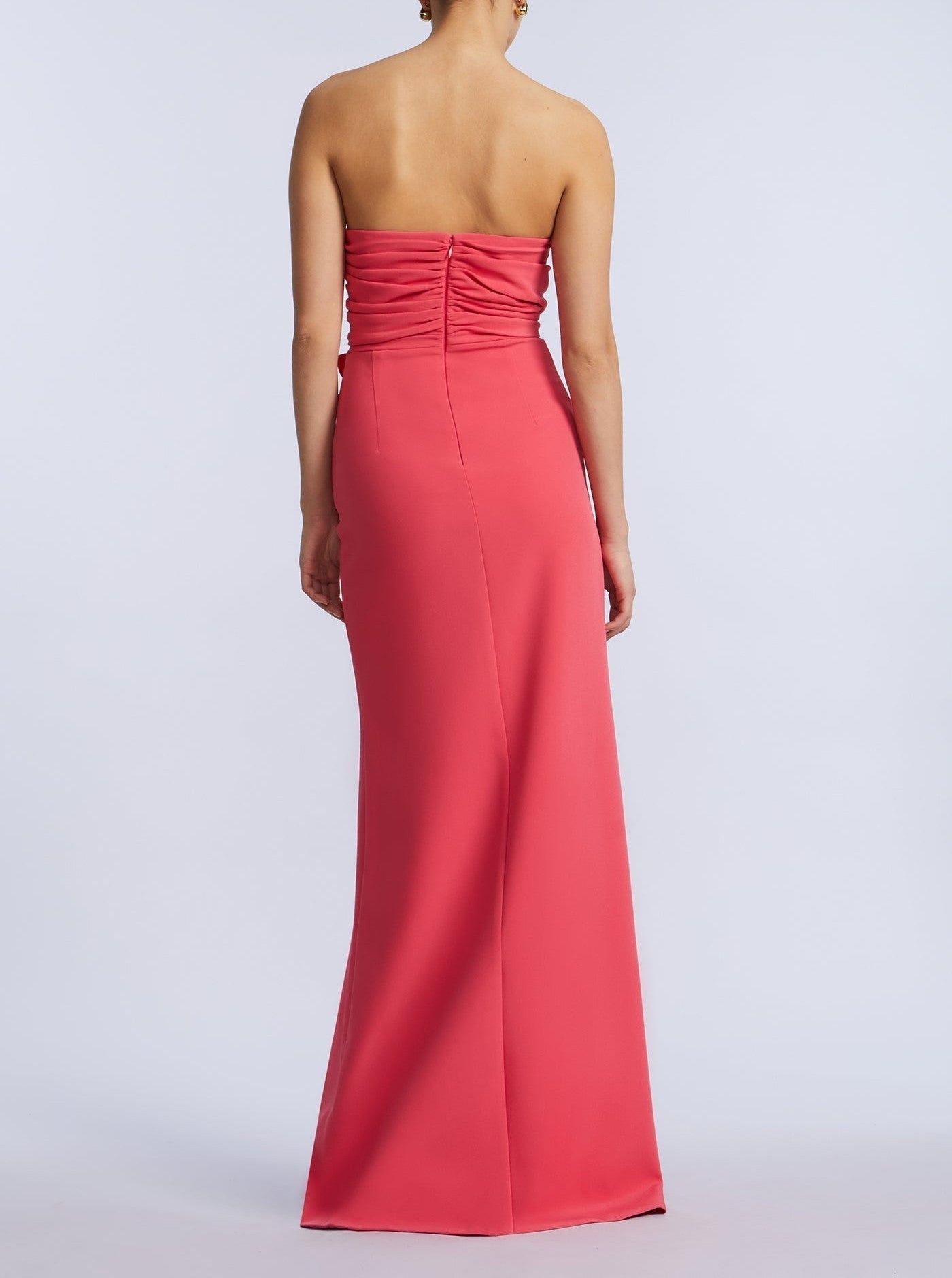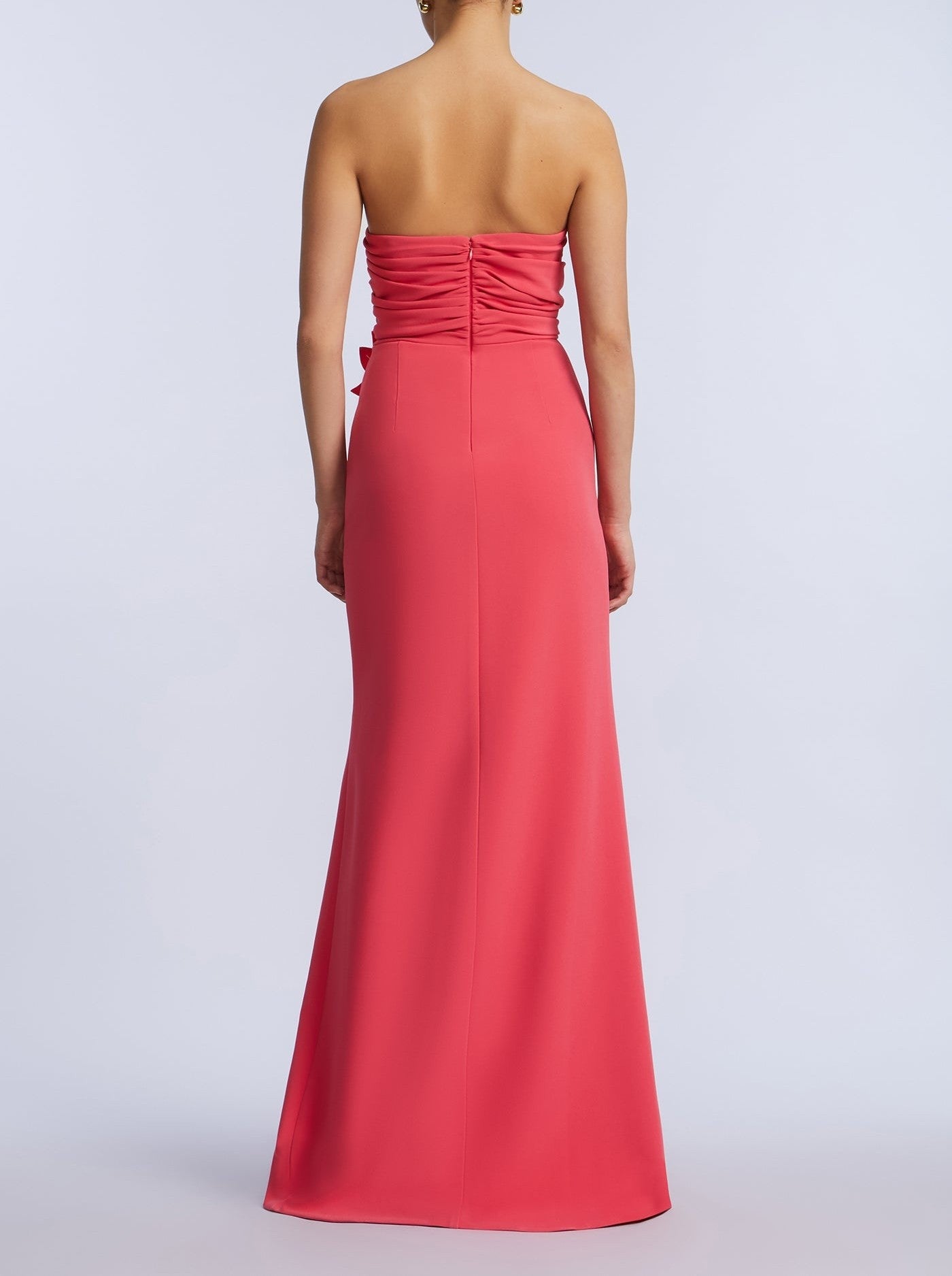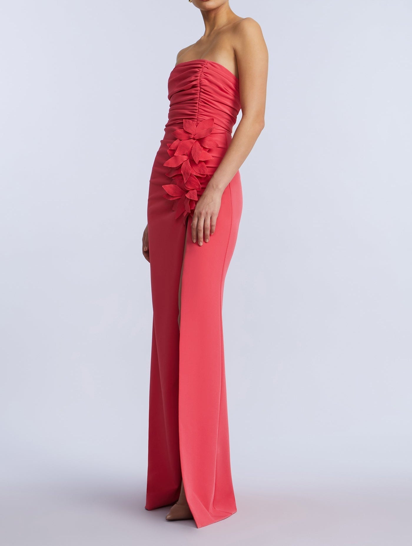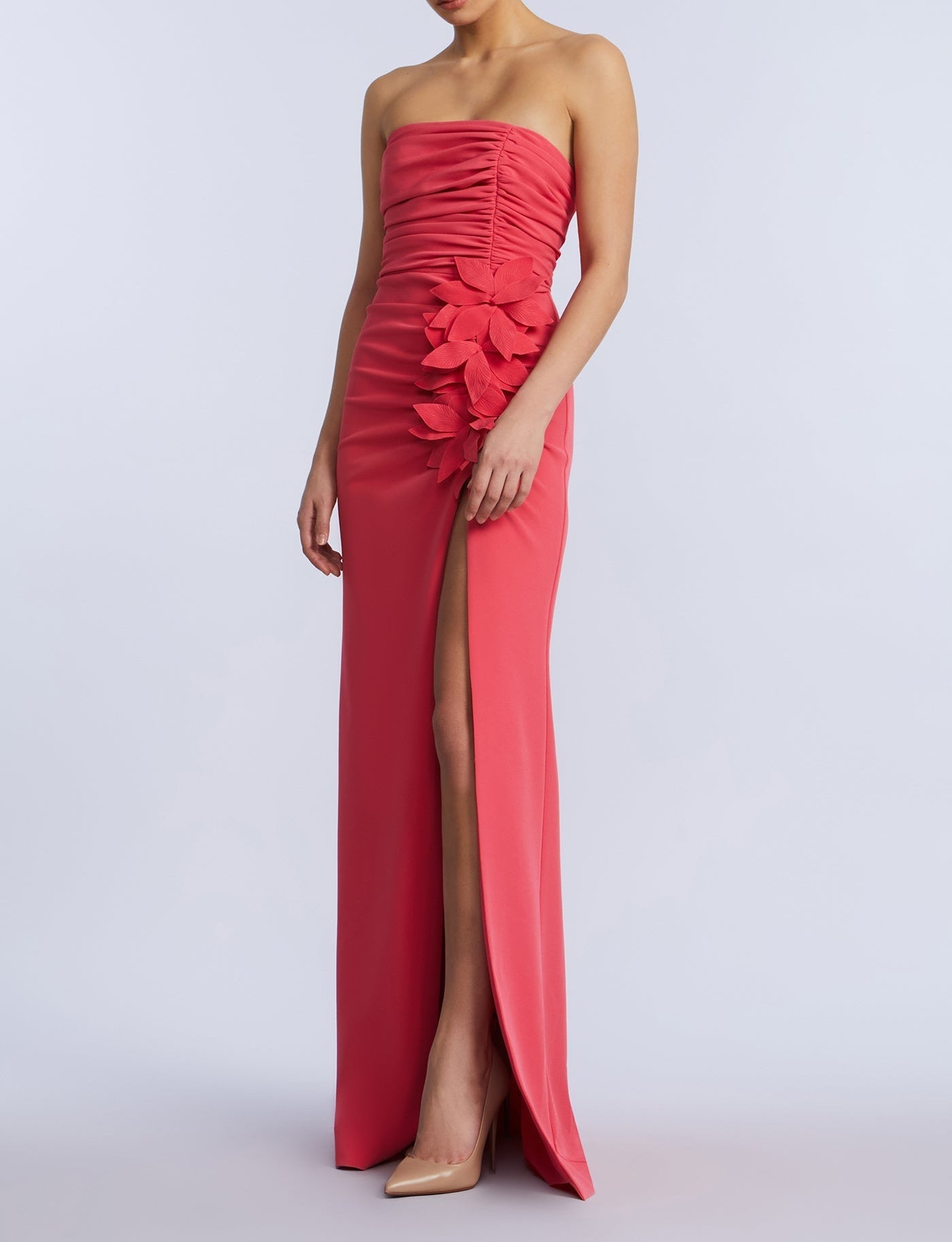 Strapless gown with a ruched bodice and thigh-high slit, crafted in a vibrant coral stretch crepe. Dimensional petal appliqués accent the hip for a sculptural finish. Just the thing for galas, black-tie weddings, or a red carpet entrance.