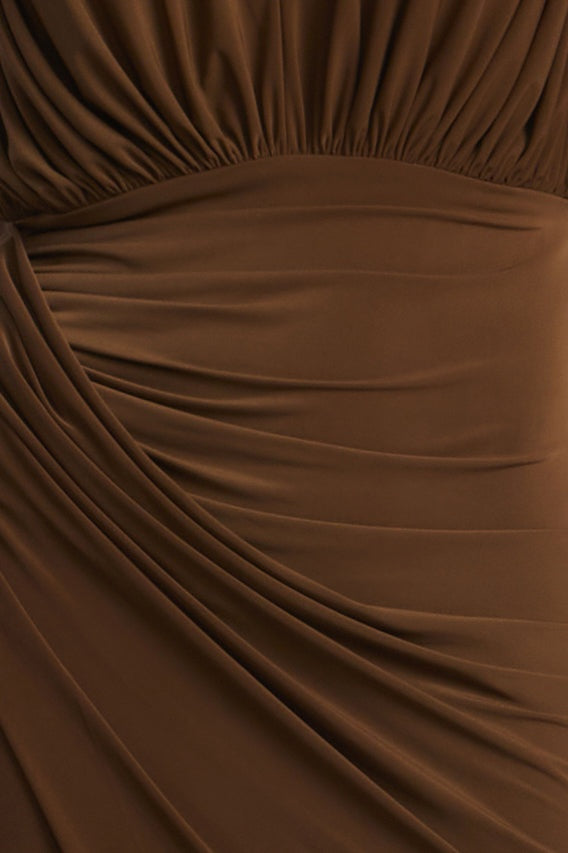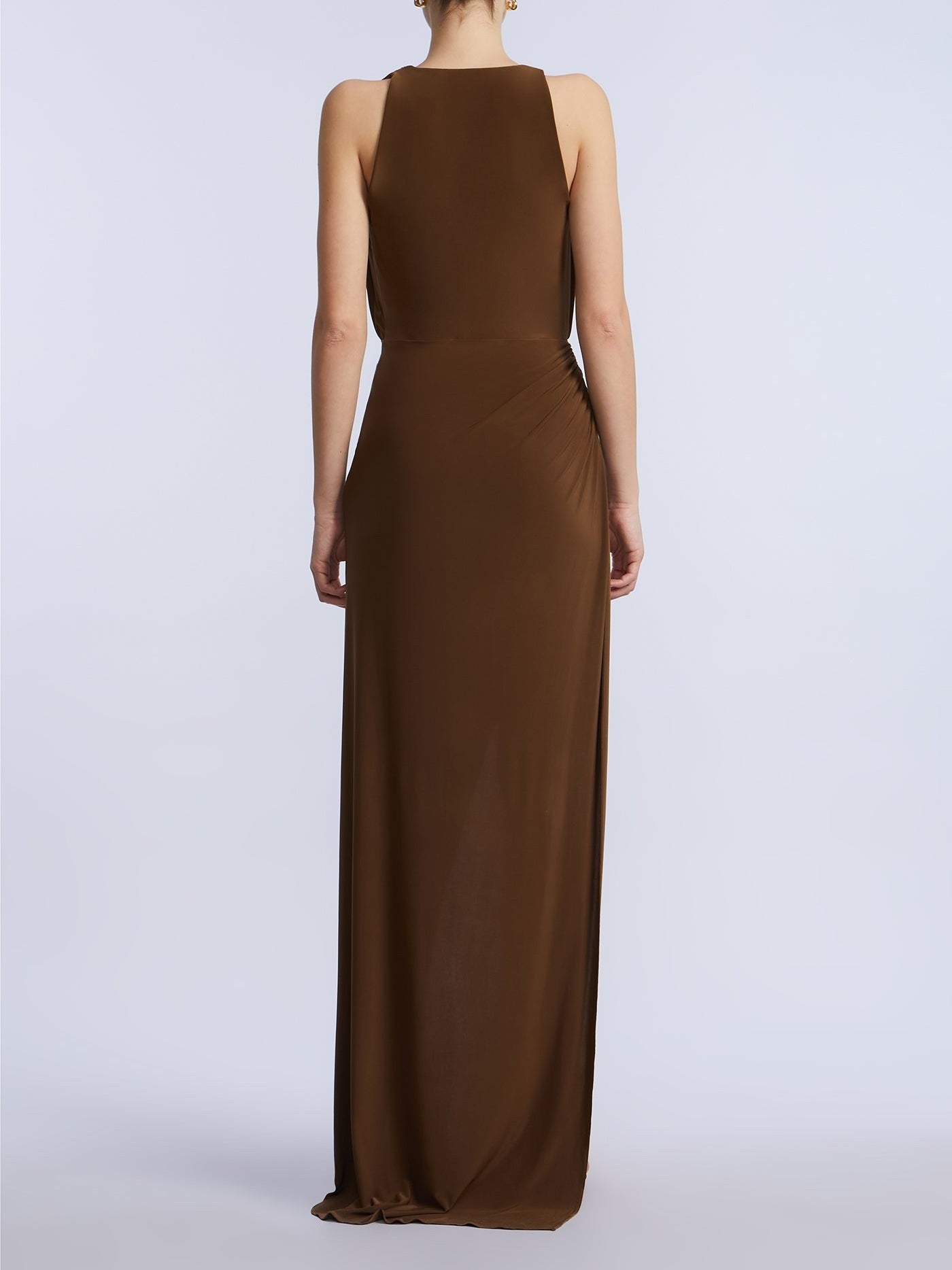 Draped matte jersey gown in a rich espresso hue. Designed with a deep plunge neckline and wide gathered straps, it hugs through the waist and falls into a sculpted wrap skirt with a high slit. A soft, slinky moment made for evening drama.