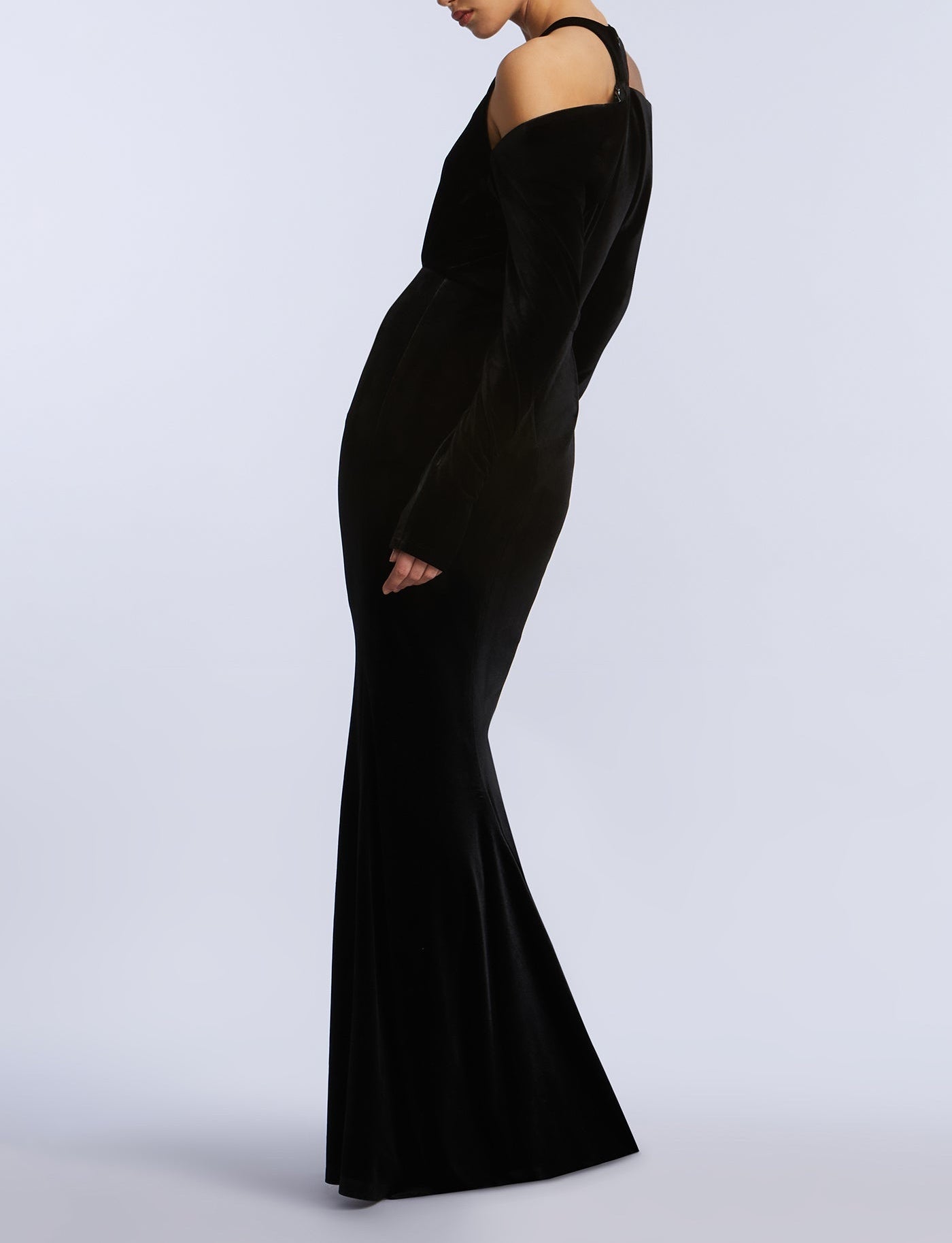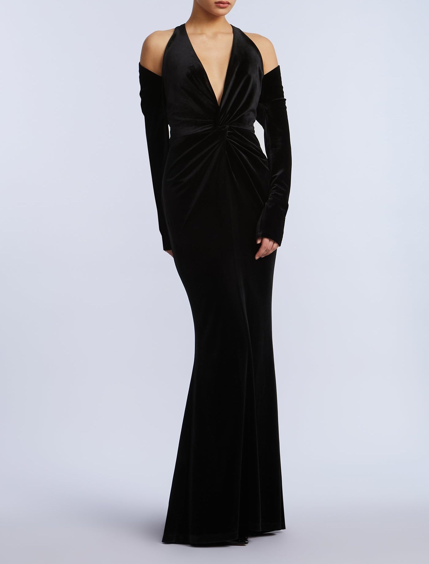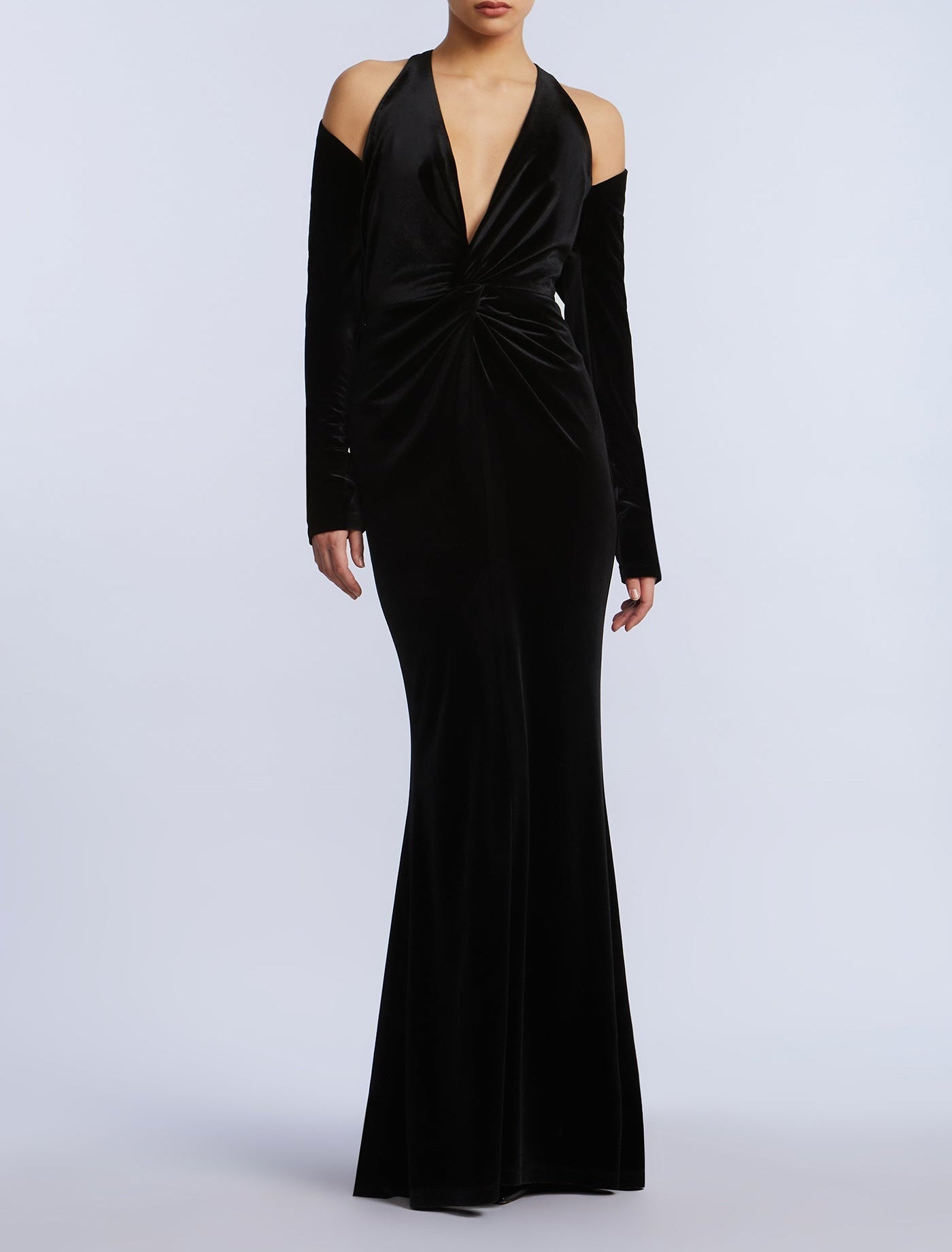 Velvet halter gown with an open shoulder detail and plunging neckline. Cut with a knotted front and long sleeves that drape off the arm, it hugs through the hips before flaring into a clean hem. A midnight knockout for galas, black-tie events, or winter formals.