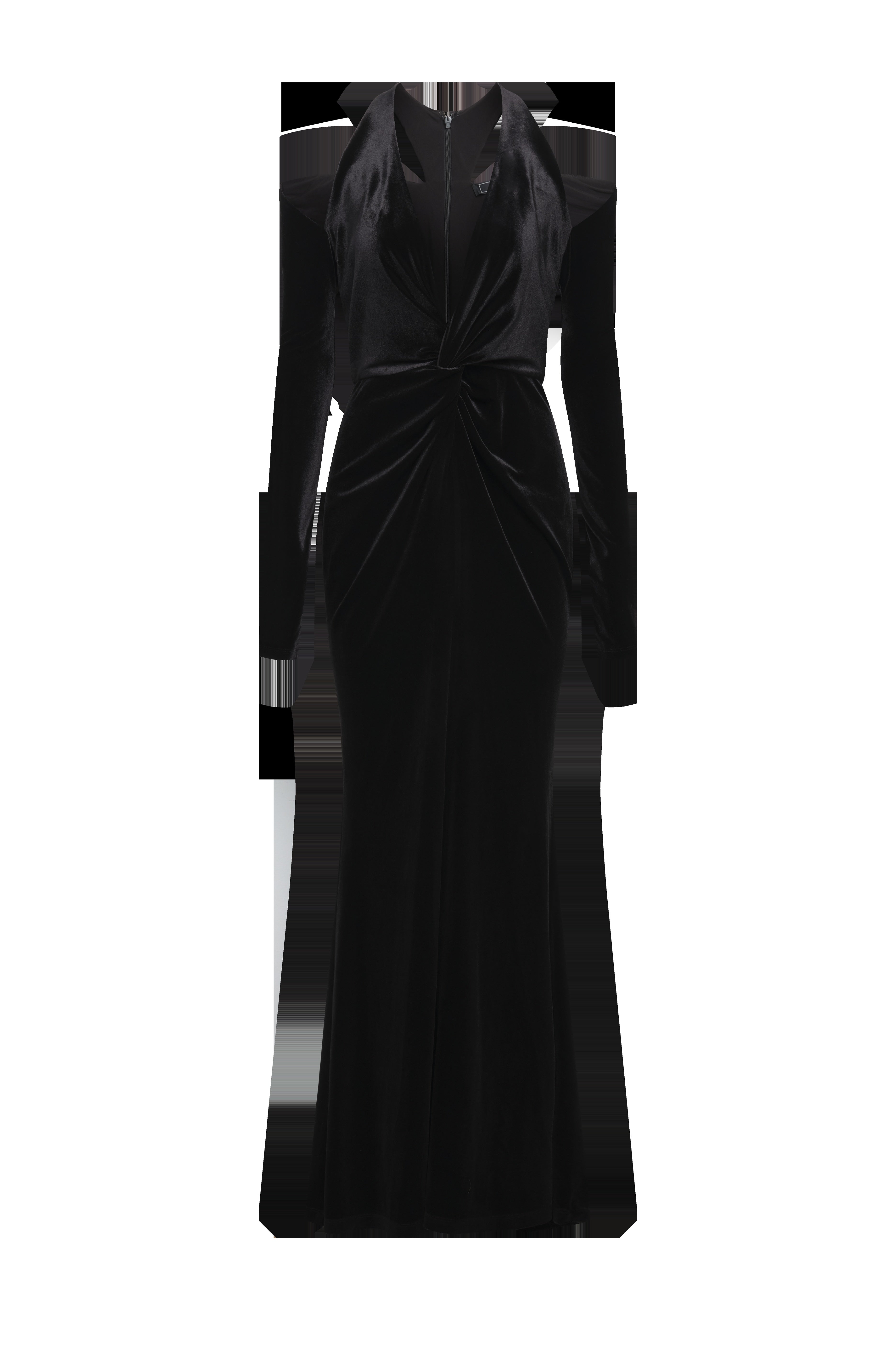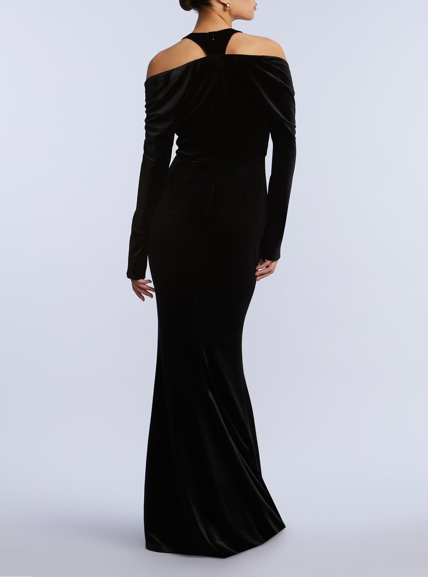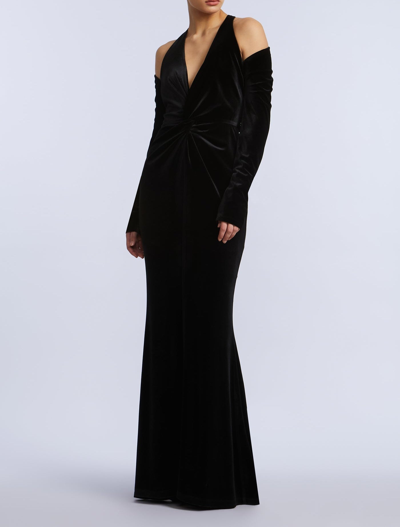Velvet halter gown with an open shoulder detail and plunging neckline. Cut with a knotted front and long sleeves that drape off the arm, it hugs through the hips before flaring into a clean hem. A midnight knockout for galas, black-tie events, or winter formals.
