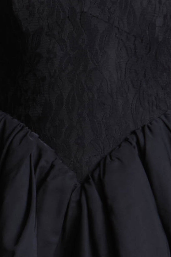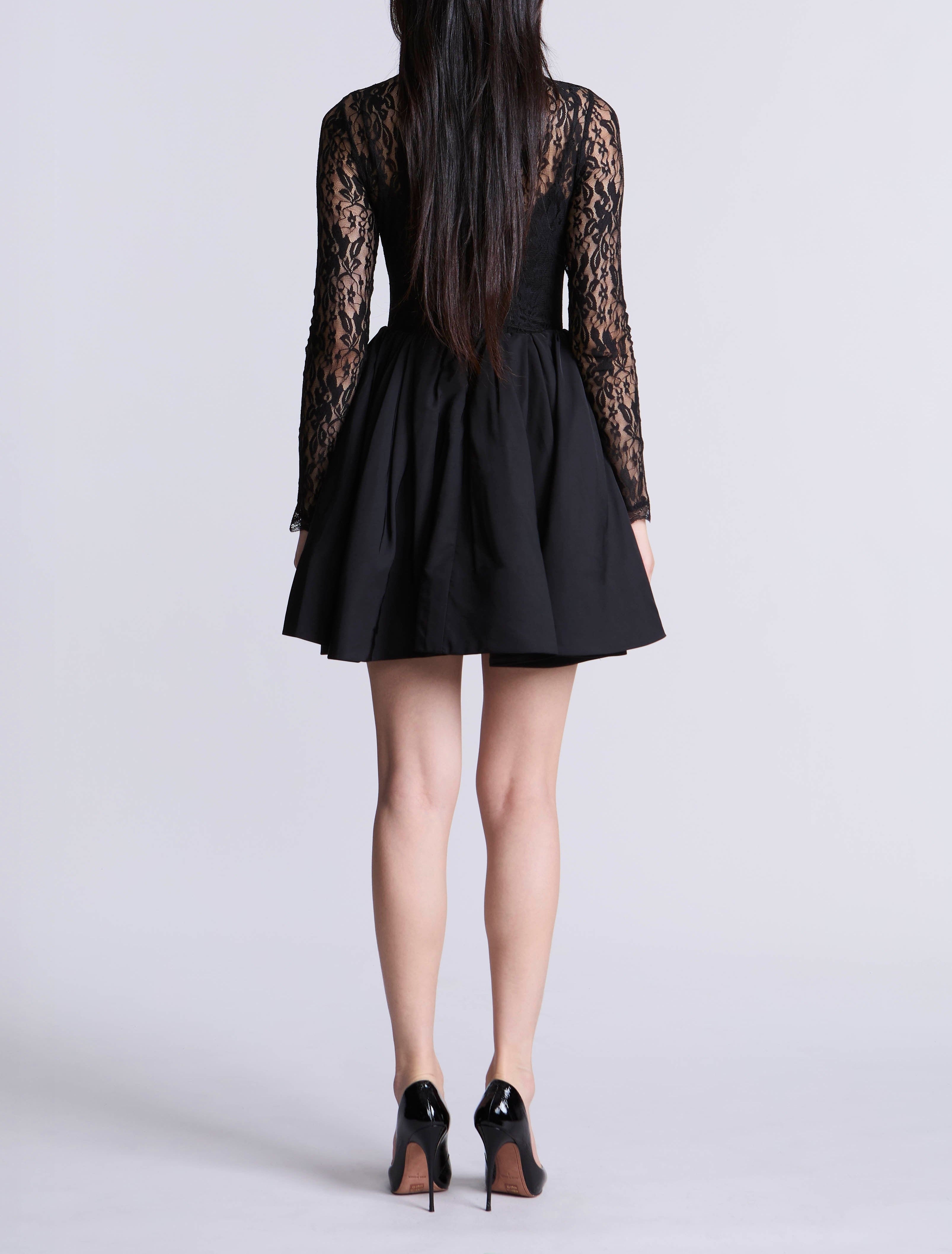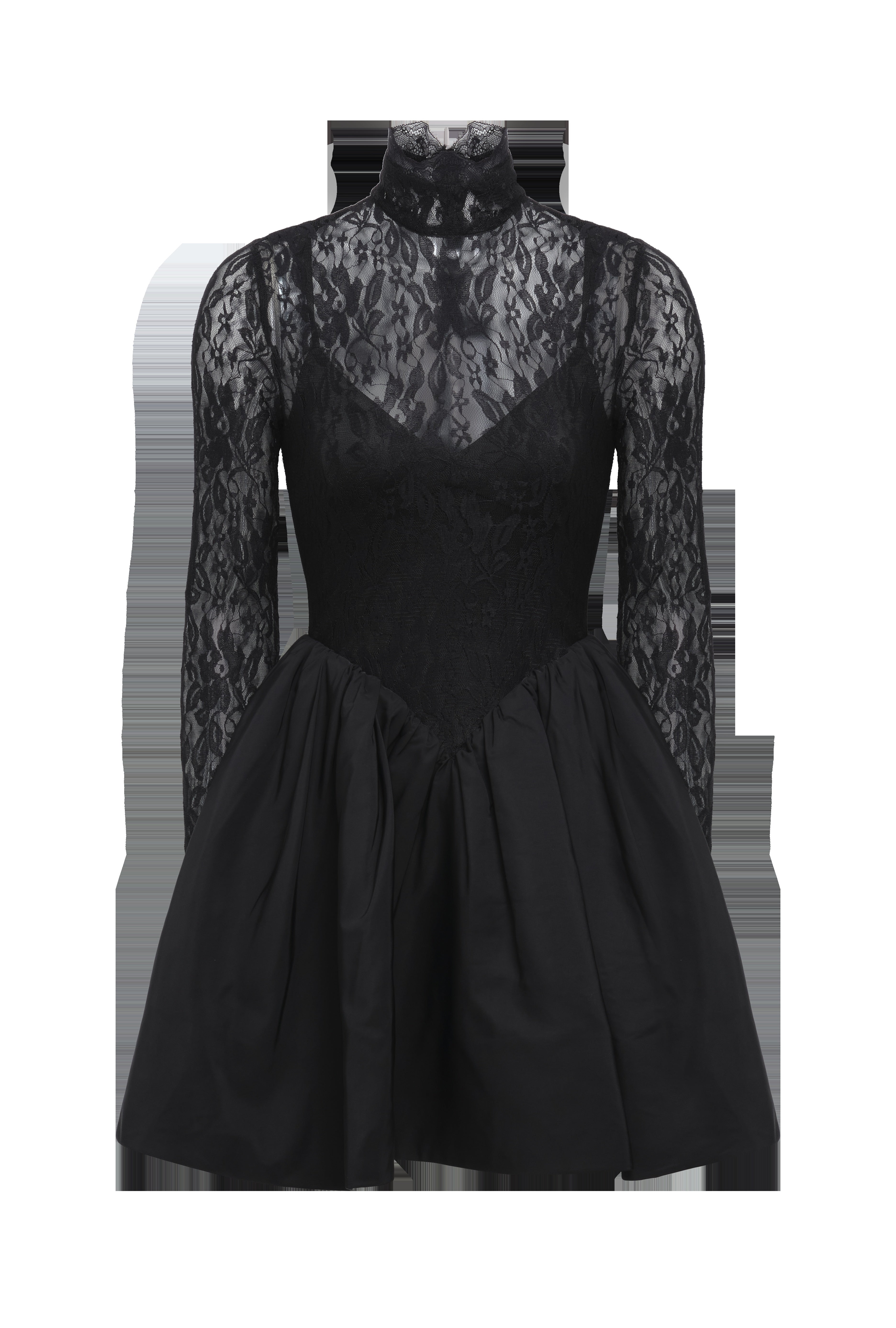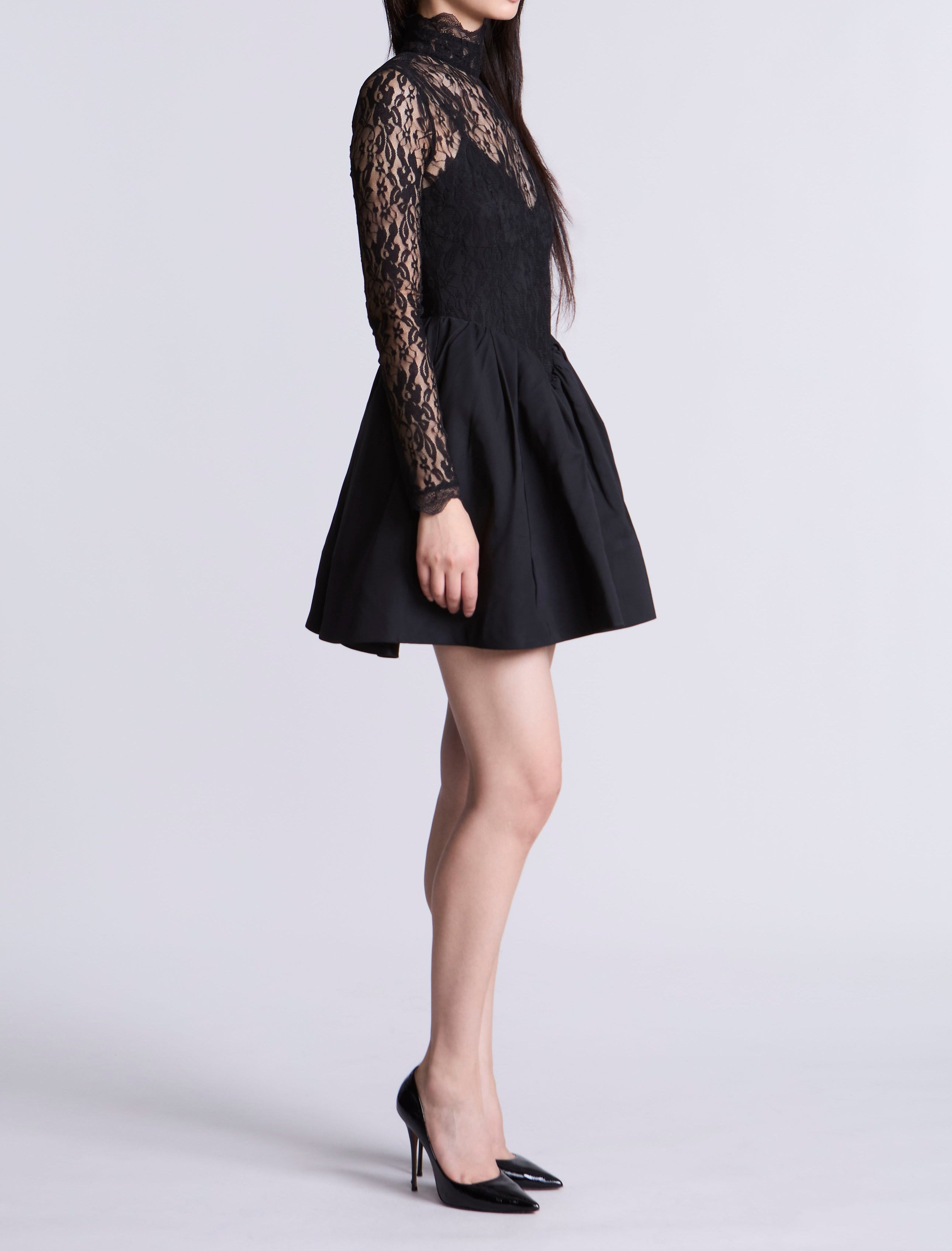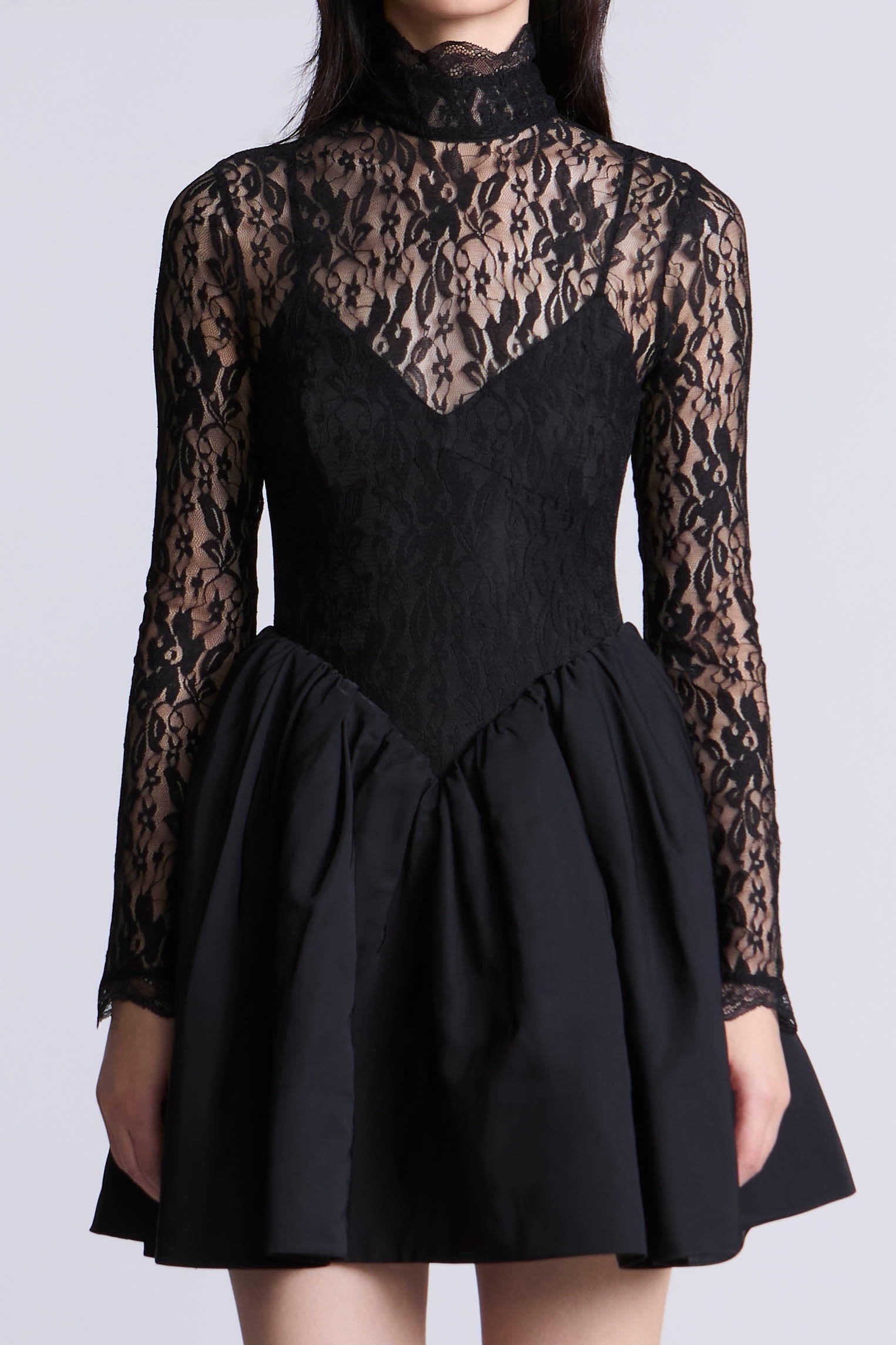 Flocked stretch lace mini with a sculpted sweetheart bodice and sheer mock neck sleeves. The taffeta bubble skirt cinches the waist and flares into full drama. Pair it with heels for a bold party look, or ballet flats to lean into the dollcore energy.