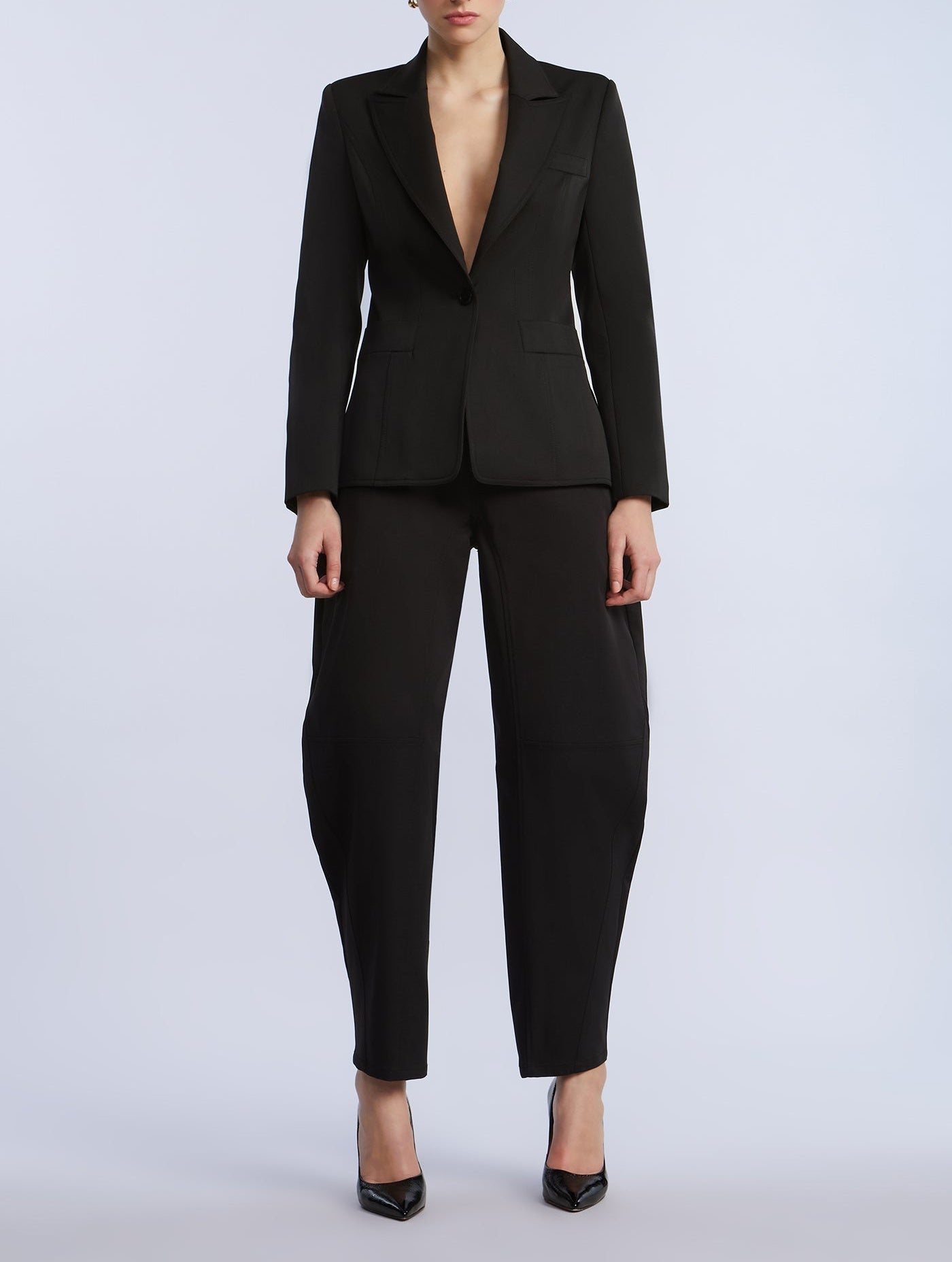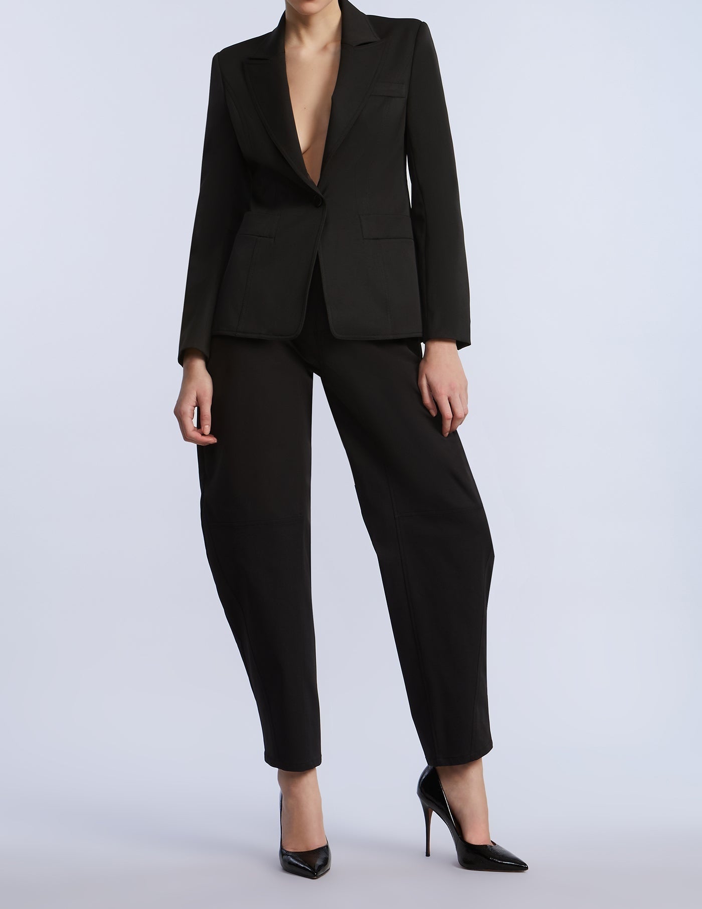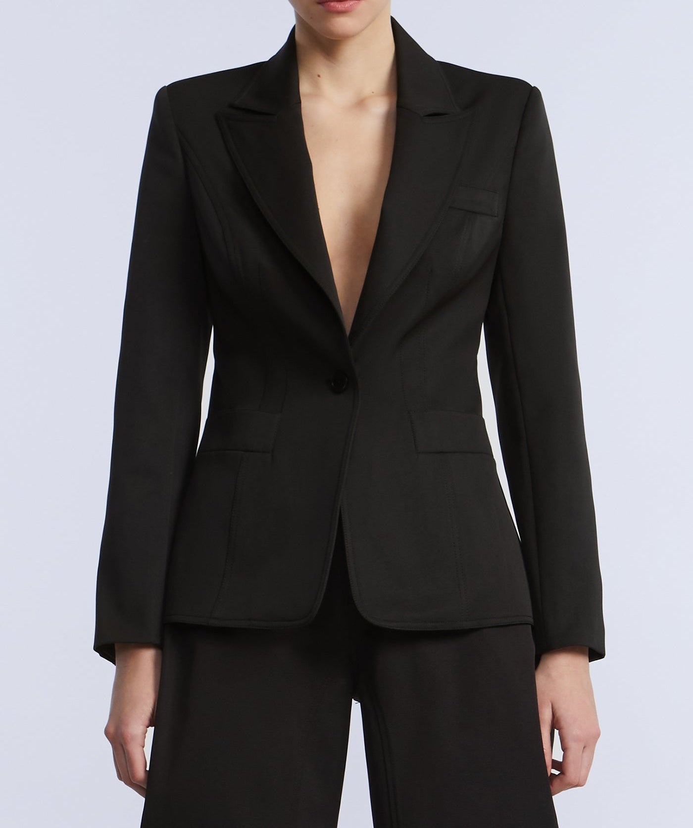 Structured blazer in stretch suiting with a sharply tailored silhouette and single-button front. Features peaked lapels, flap pockets, and soft shaping through the waist for a defined fit. A sleek staple for power moves or after-dark layering.