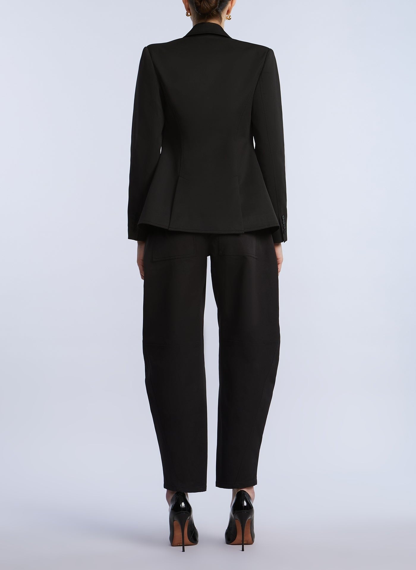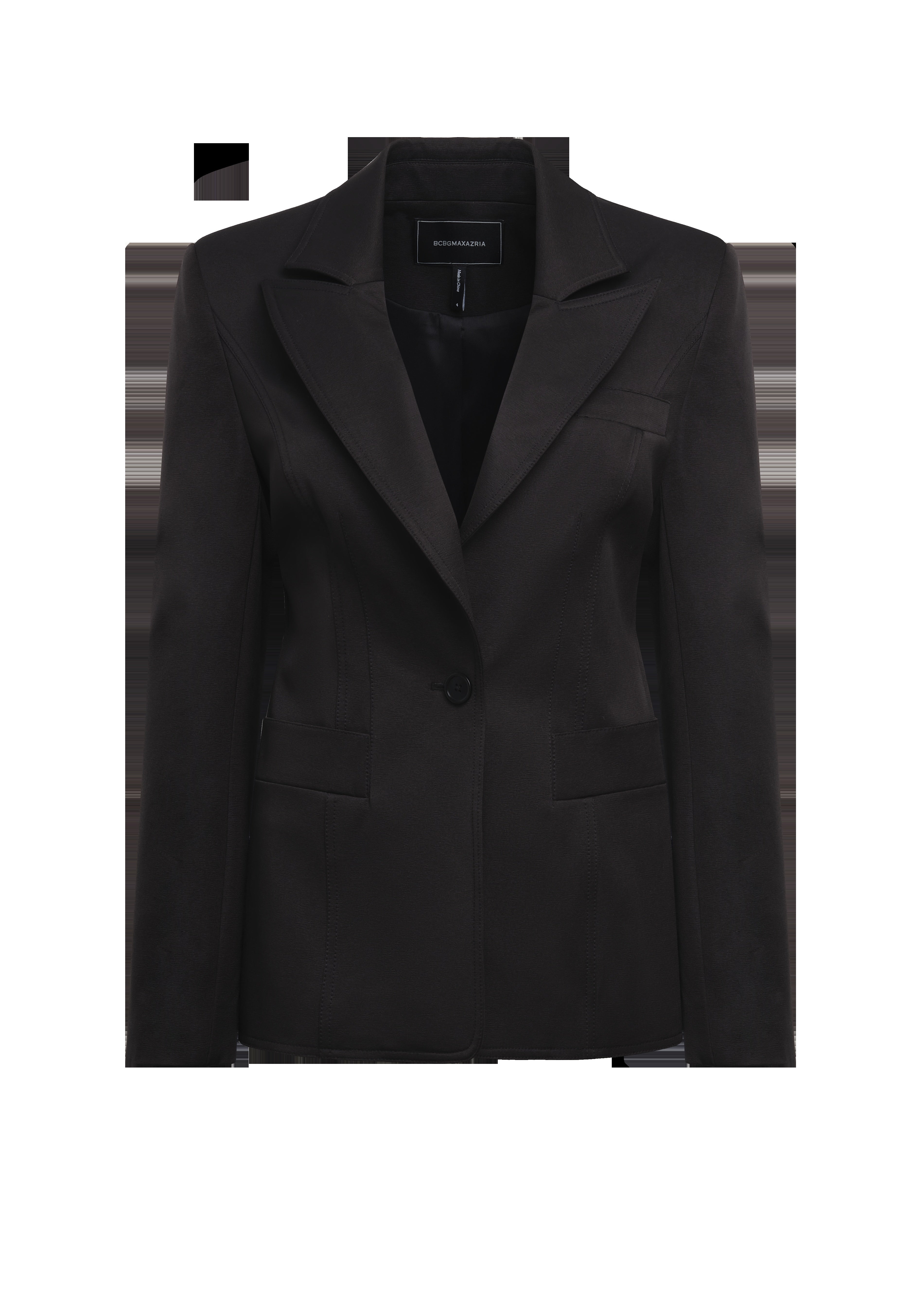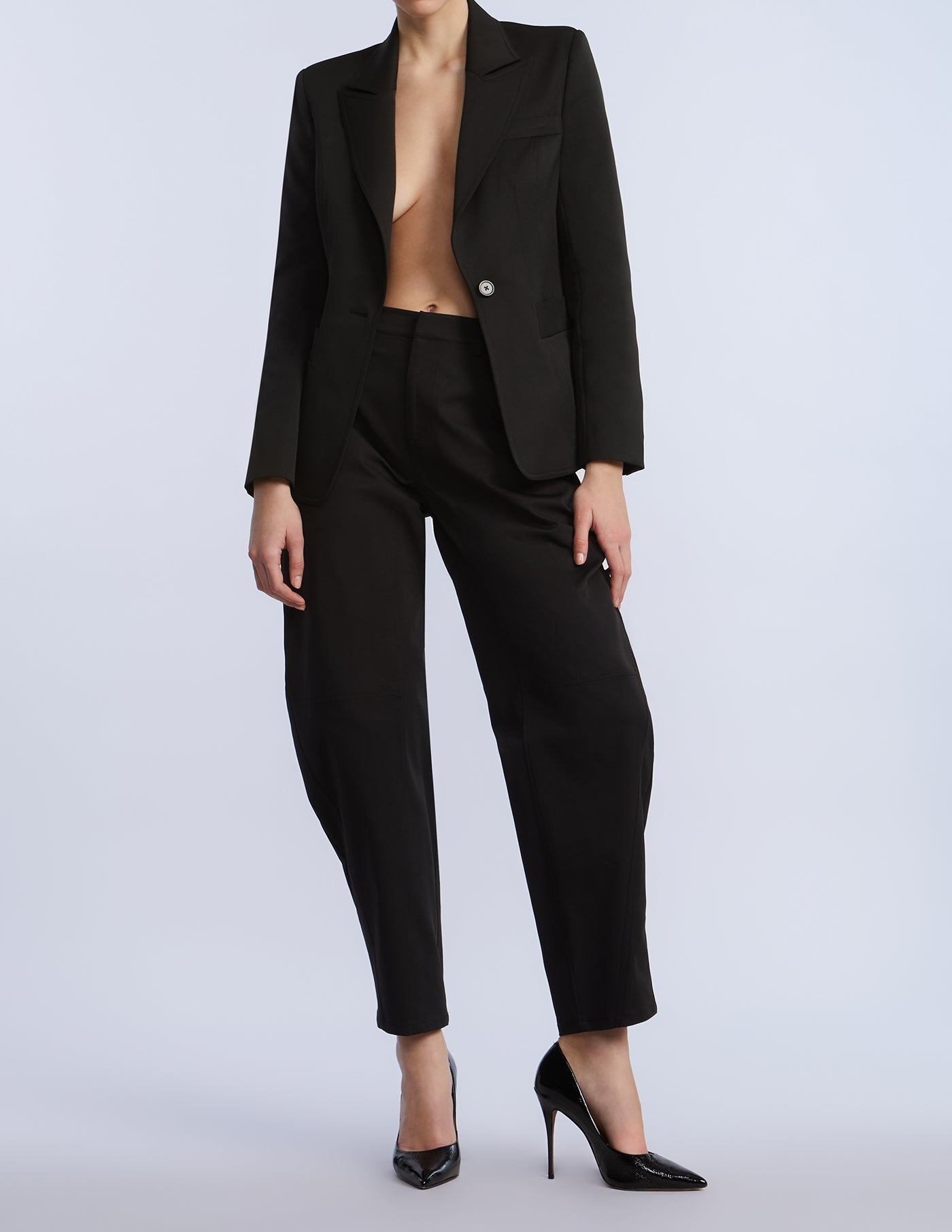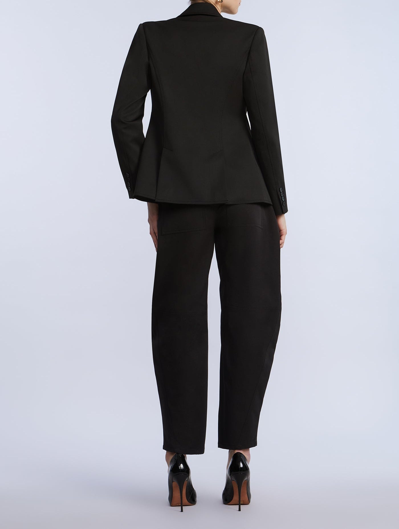 Structured blazer in stretch suiting with a sharply tailored silhouette and single-button front. Features peaked lapels, flap pockets, and soft shaping through the waist for a defined fit. A sleek staple for power moves or after-dark layering.