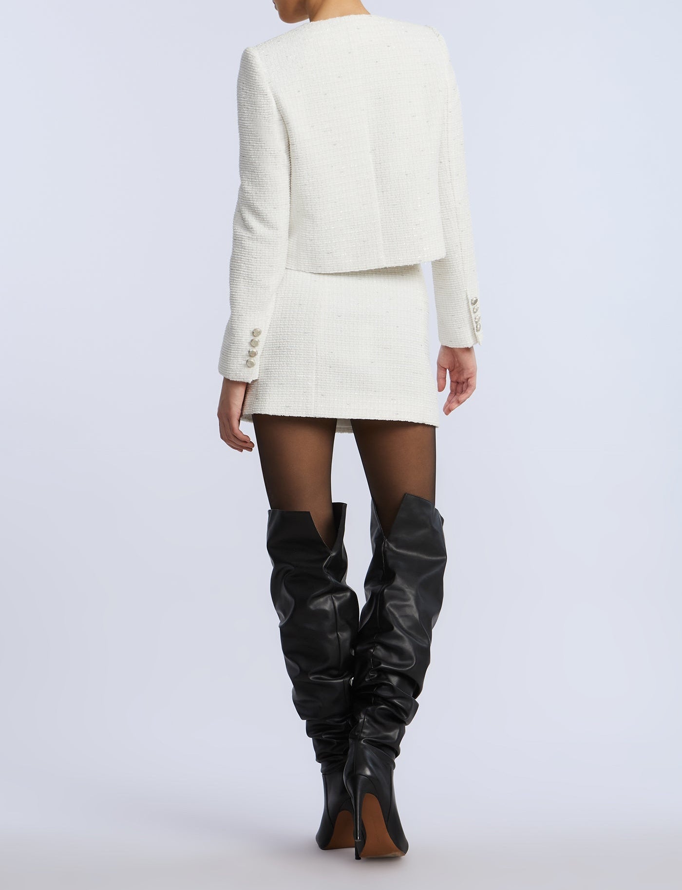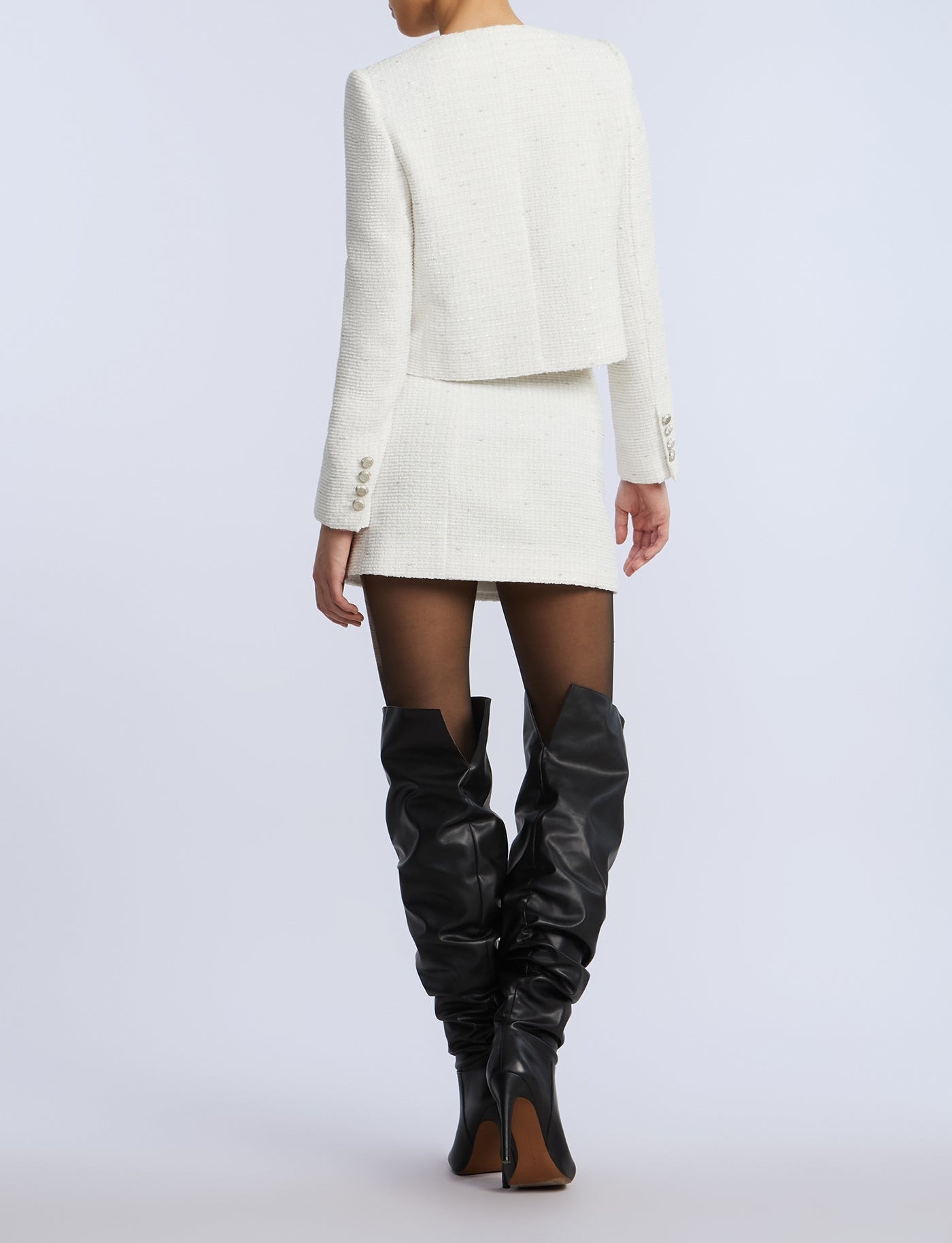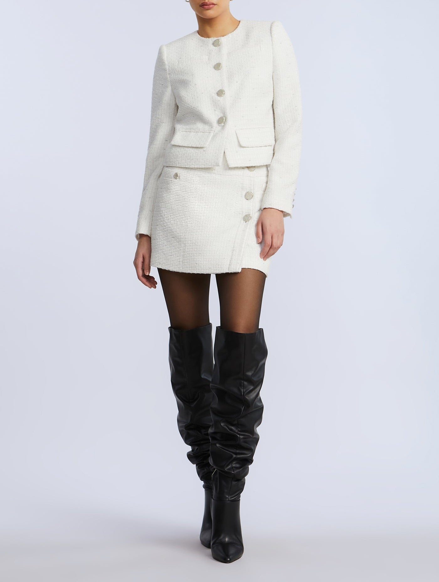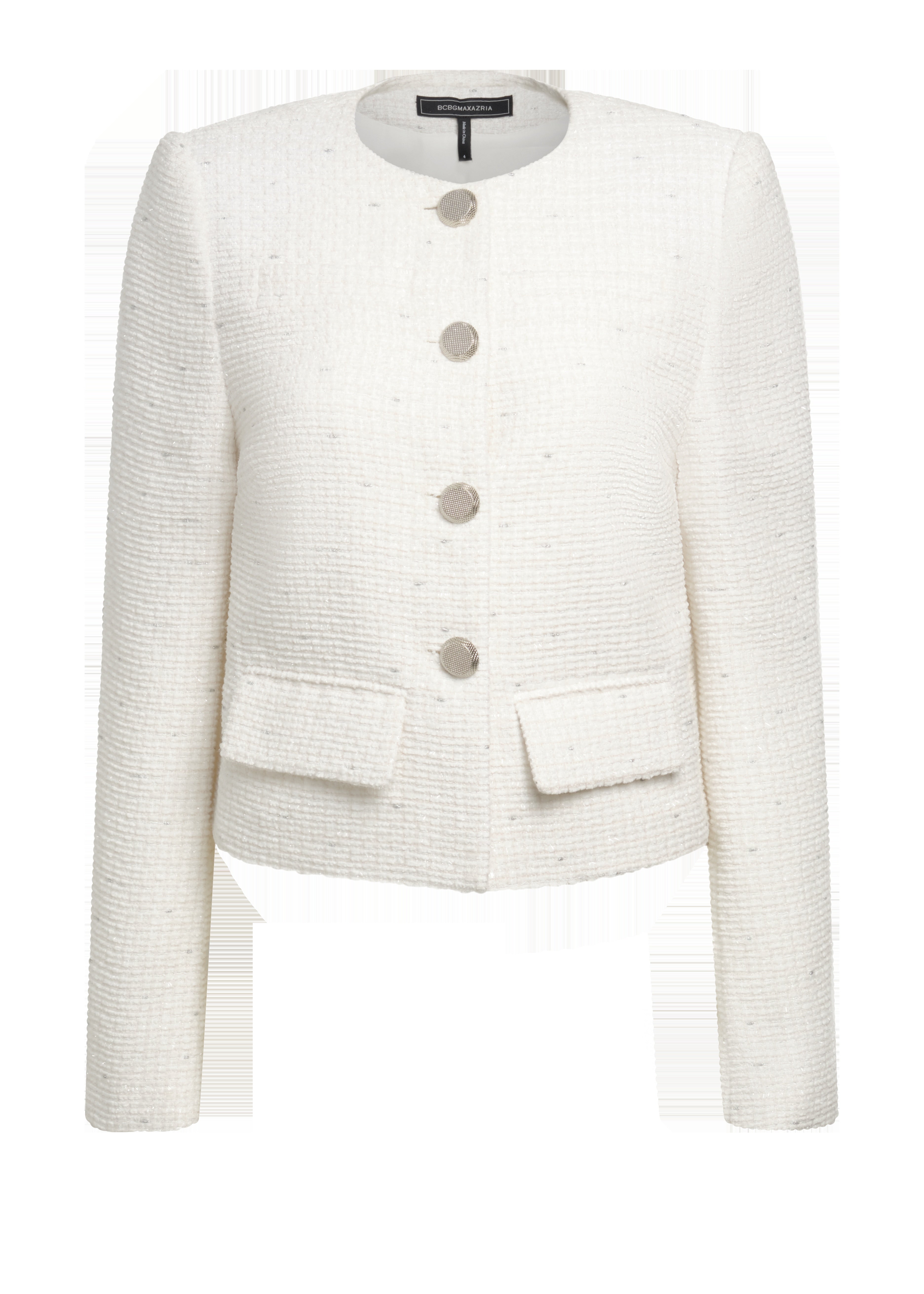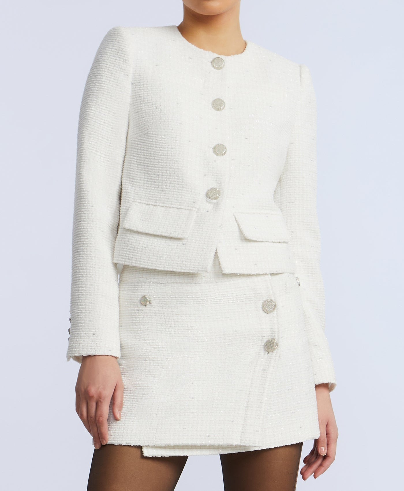 Cropped tweed jacket woven with subtle metallic thread for a soft shimmer. Finished with flap pockets, a clean neckline, and oversized buttons for a polished, tailored look. Fully lined with a button-down front.