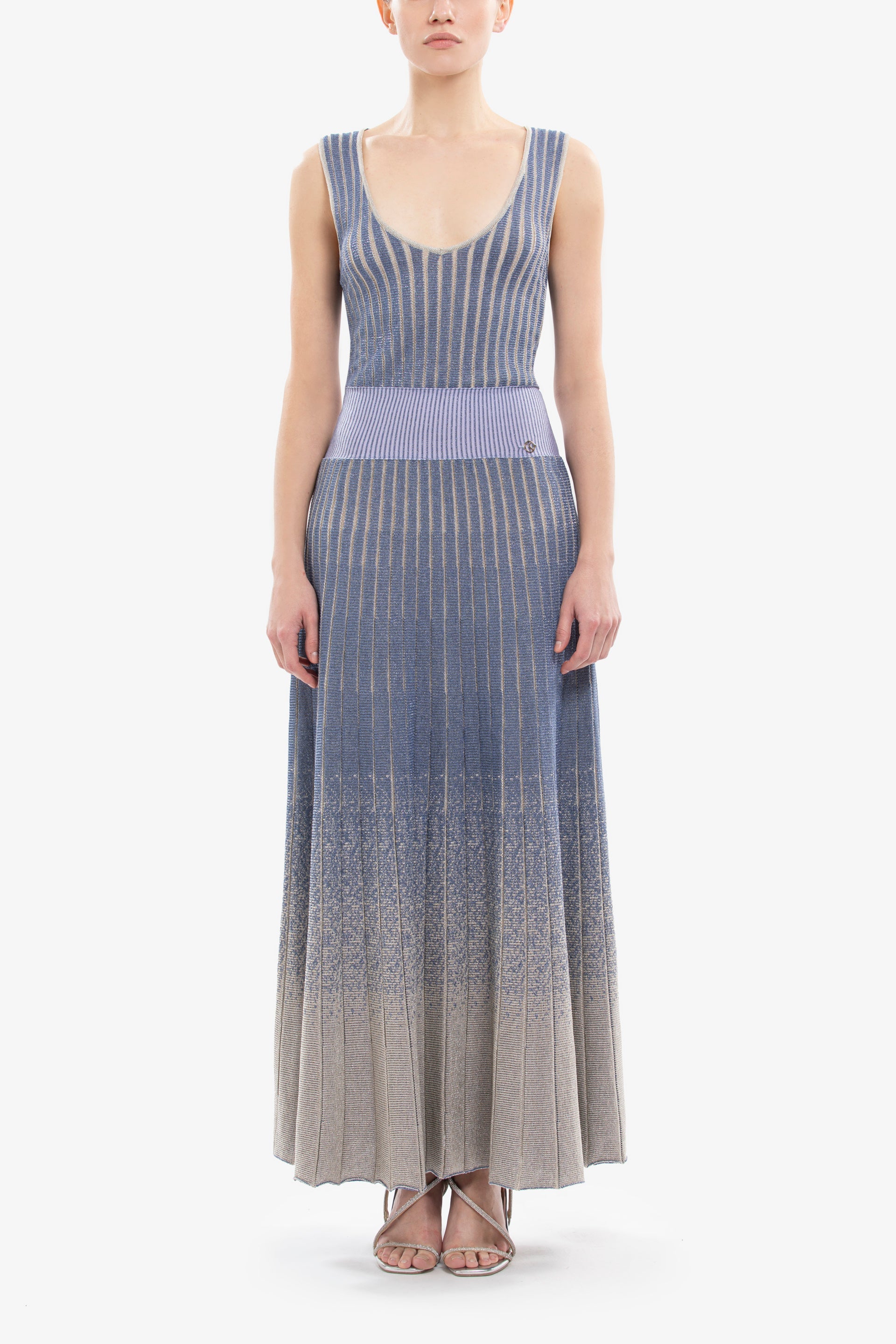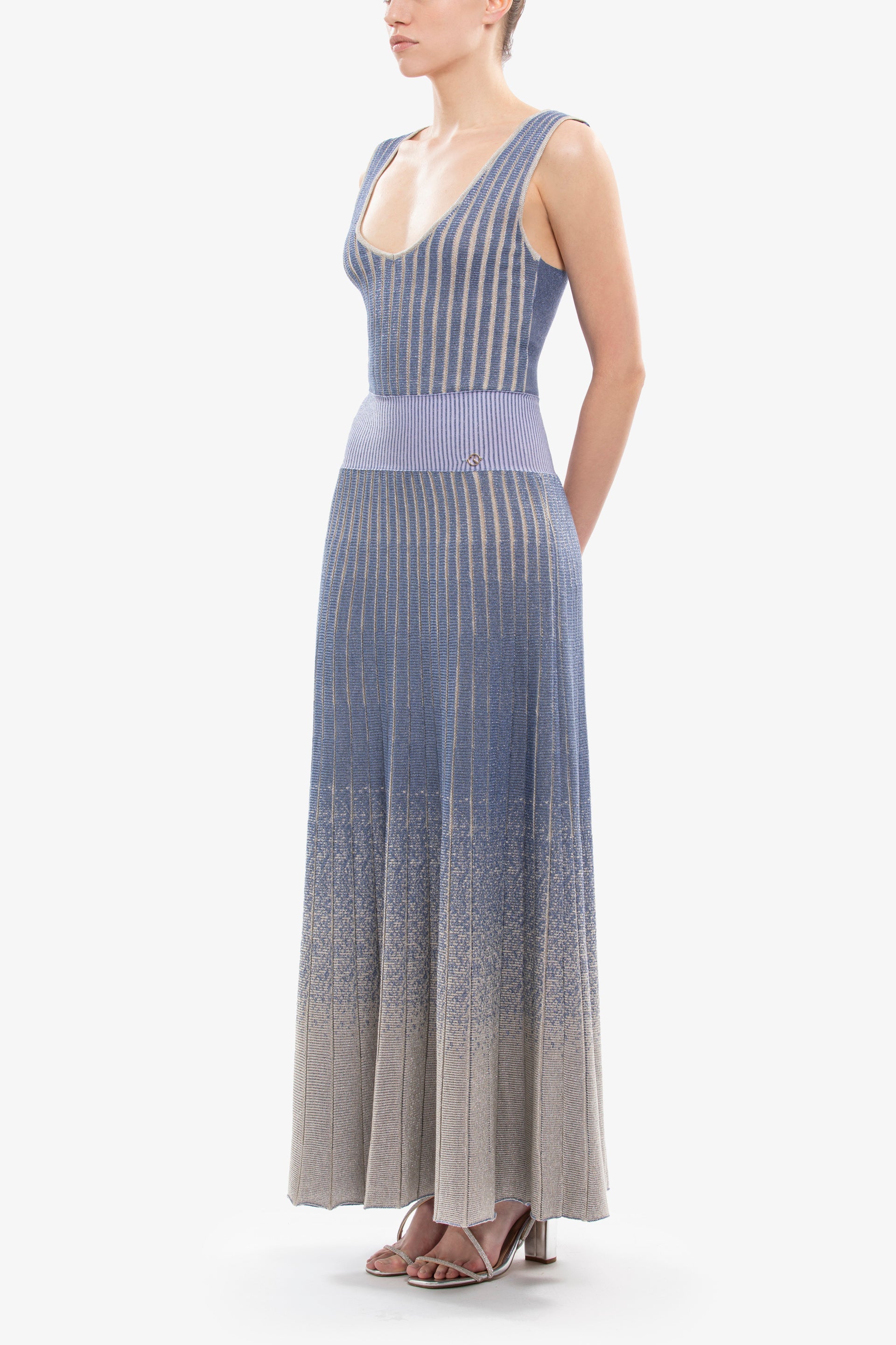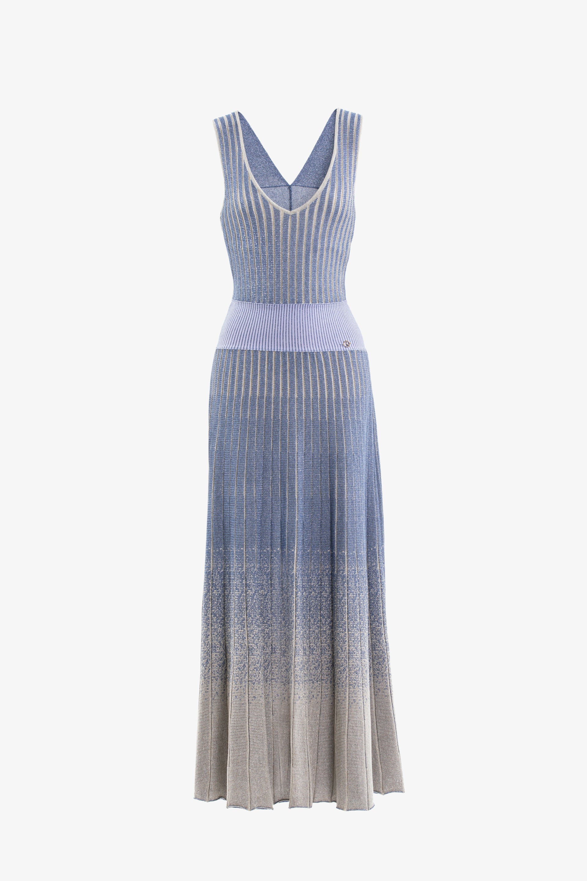 Midi length marlin knitwear piece featuring a V-neckline, sleeveless design, and a low-waist elastic band. The straight-cut skirt showcases a stunning degrade effect, transitioning gracefully from marlin to ivory, and is adorned with an SK logo on the waist for a refined finish.
