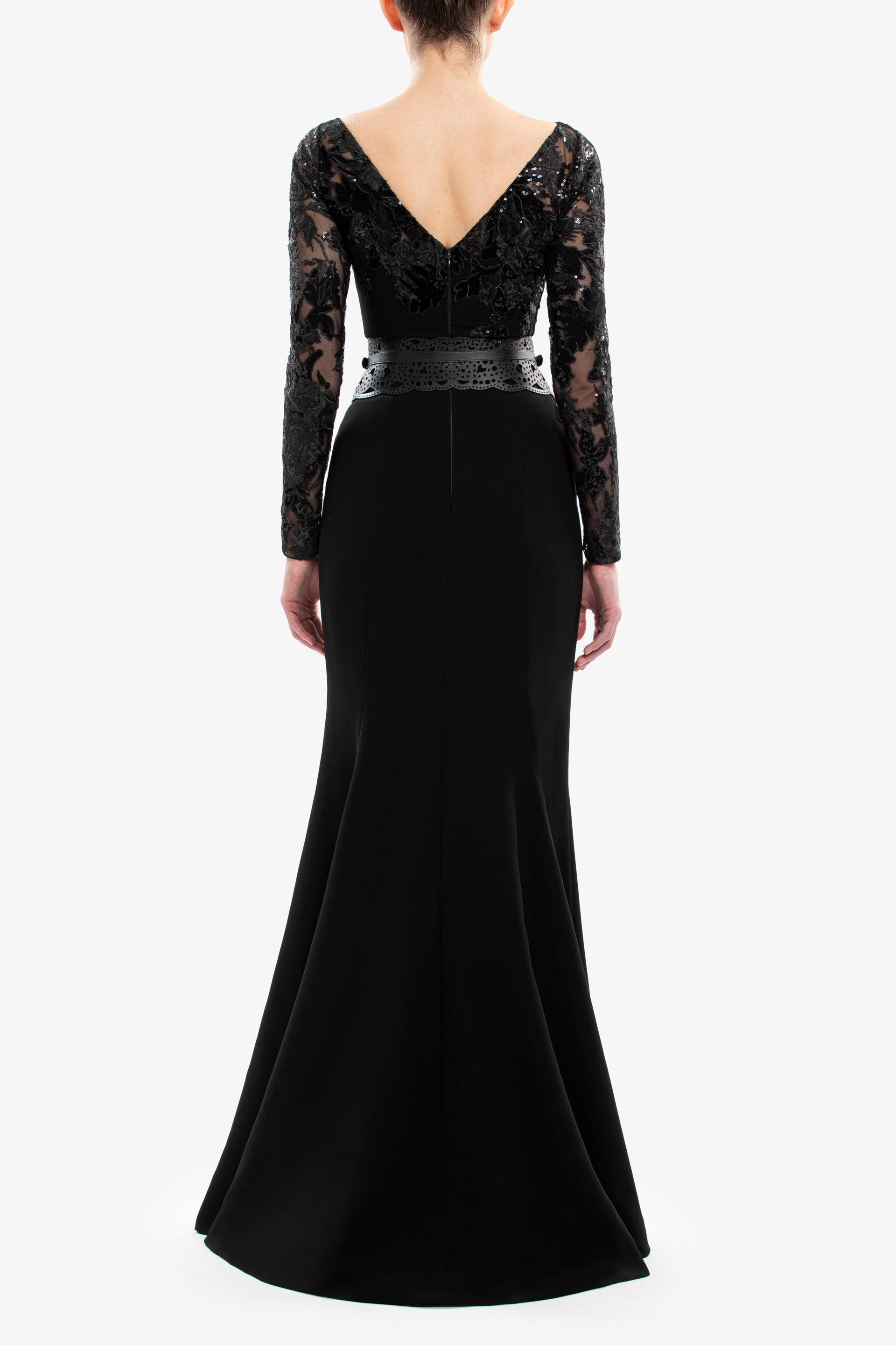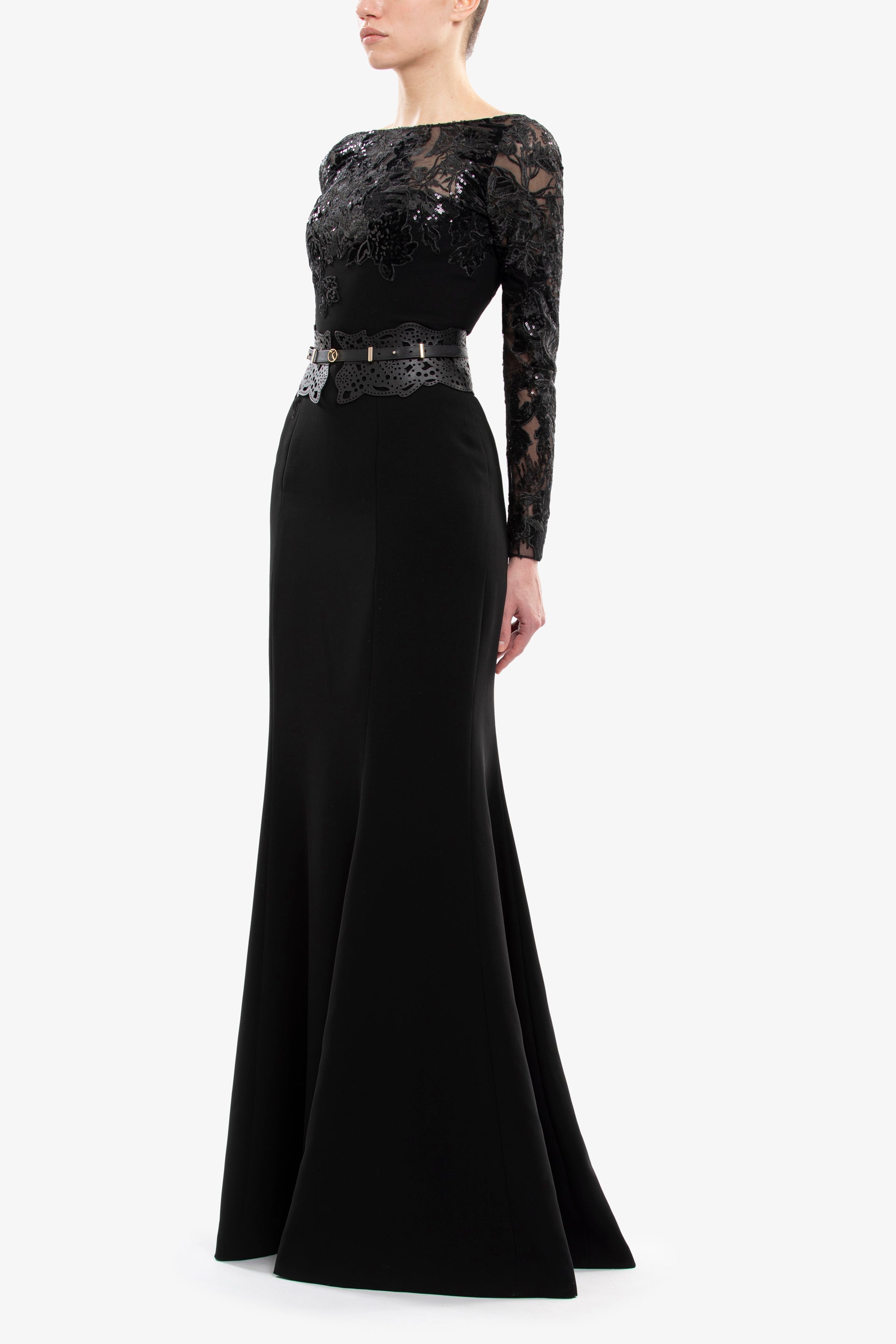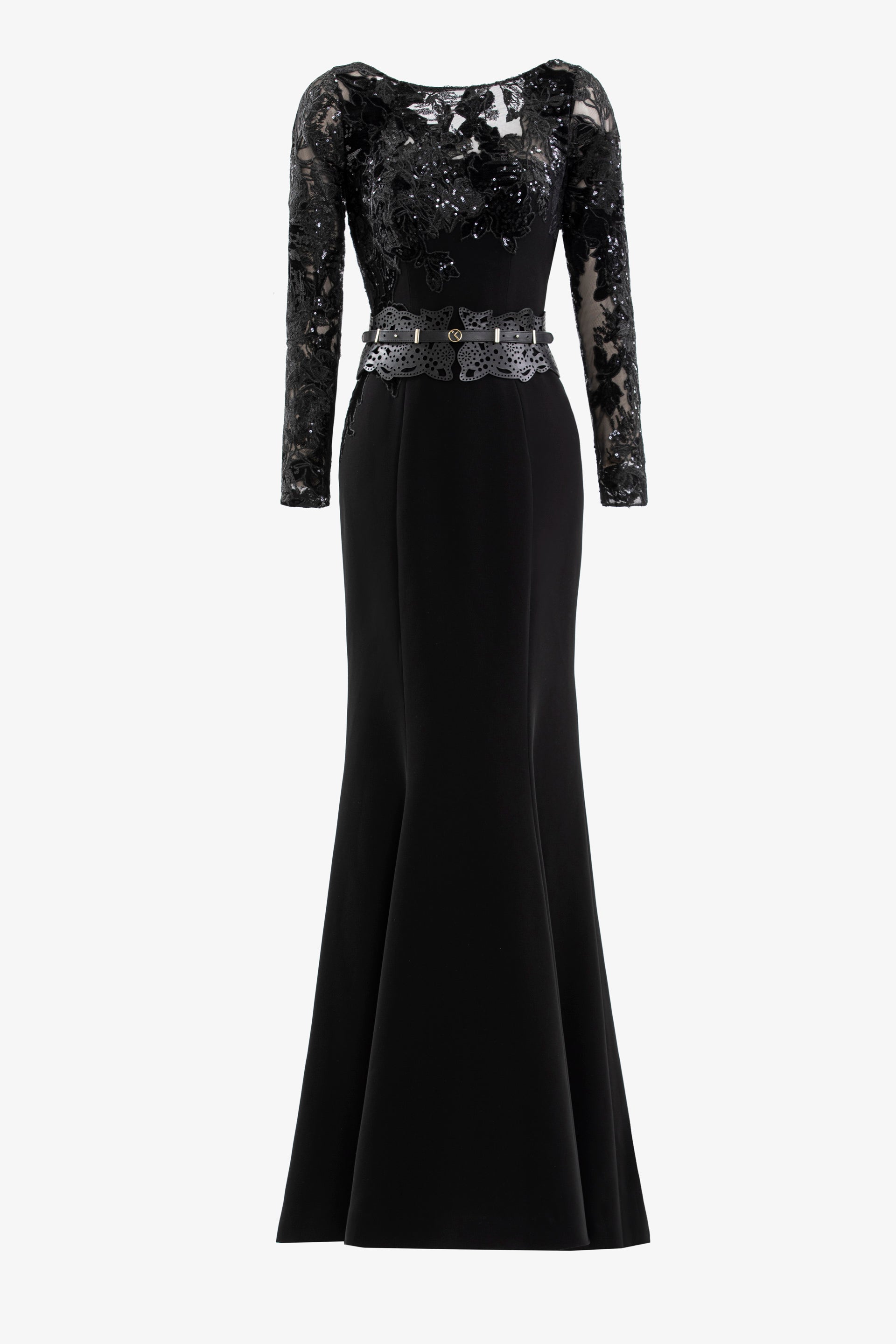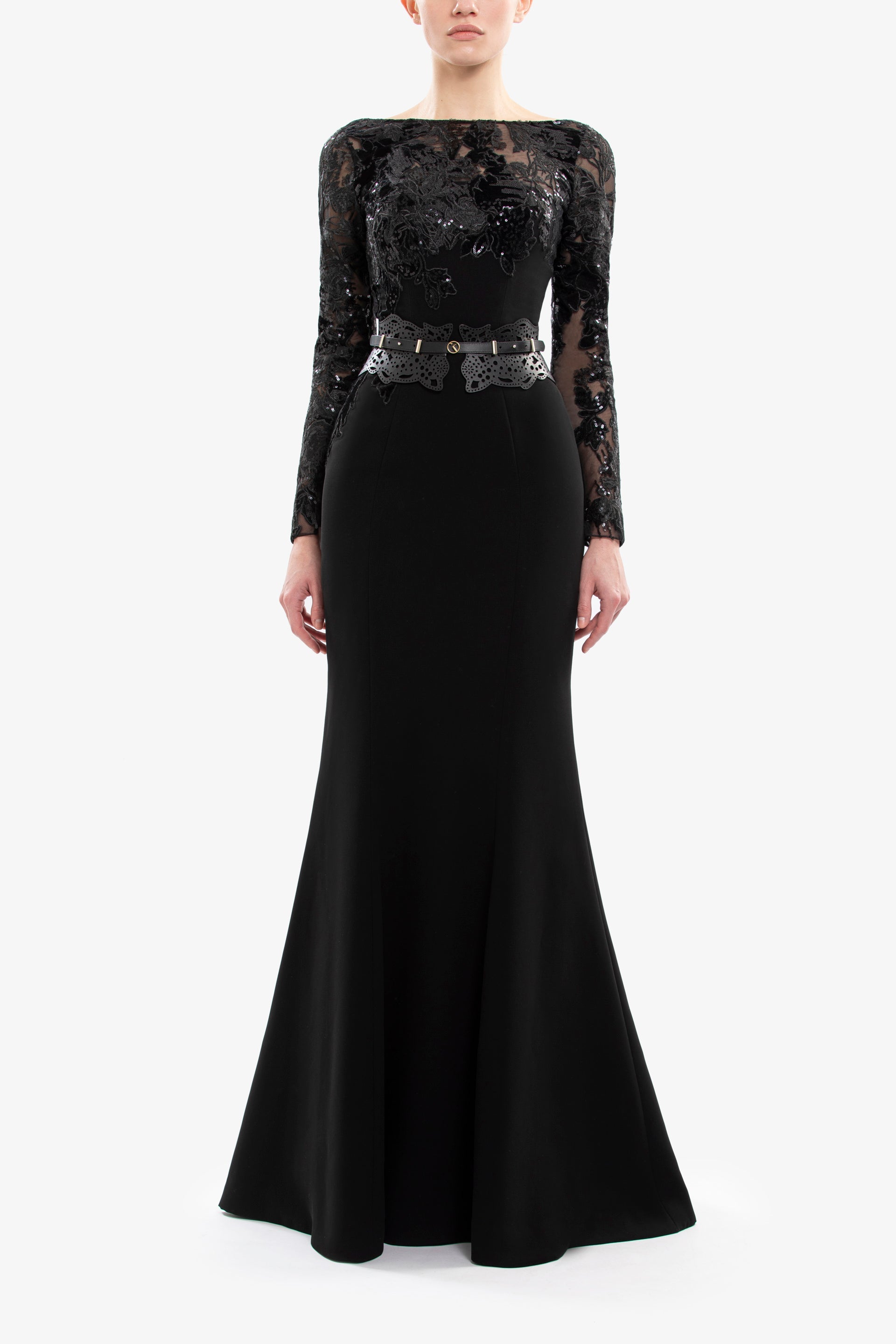 A jet-black long fitted crepe dress with a bateau neckline and long sleeves, featuring intricate velvet design detailing on the bodice and sleeves.