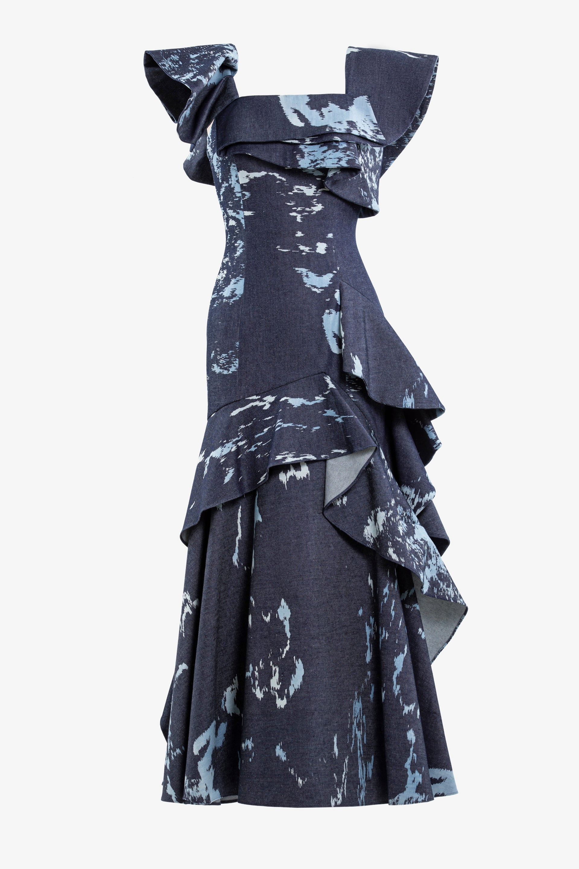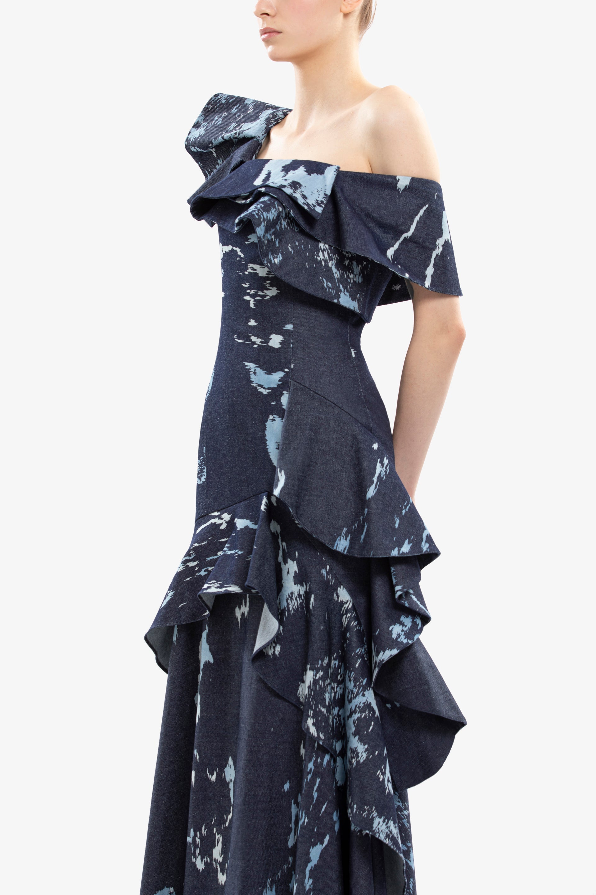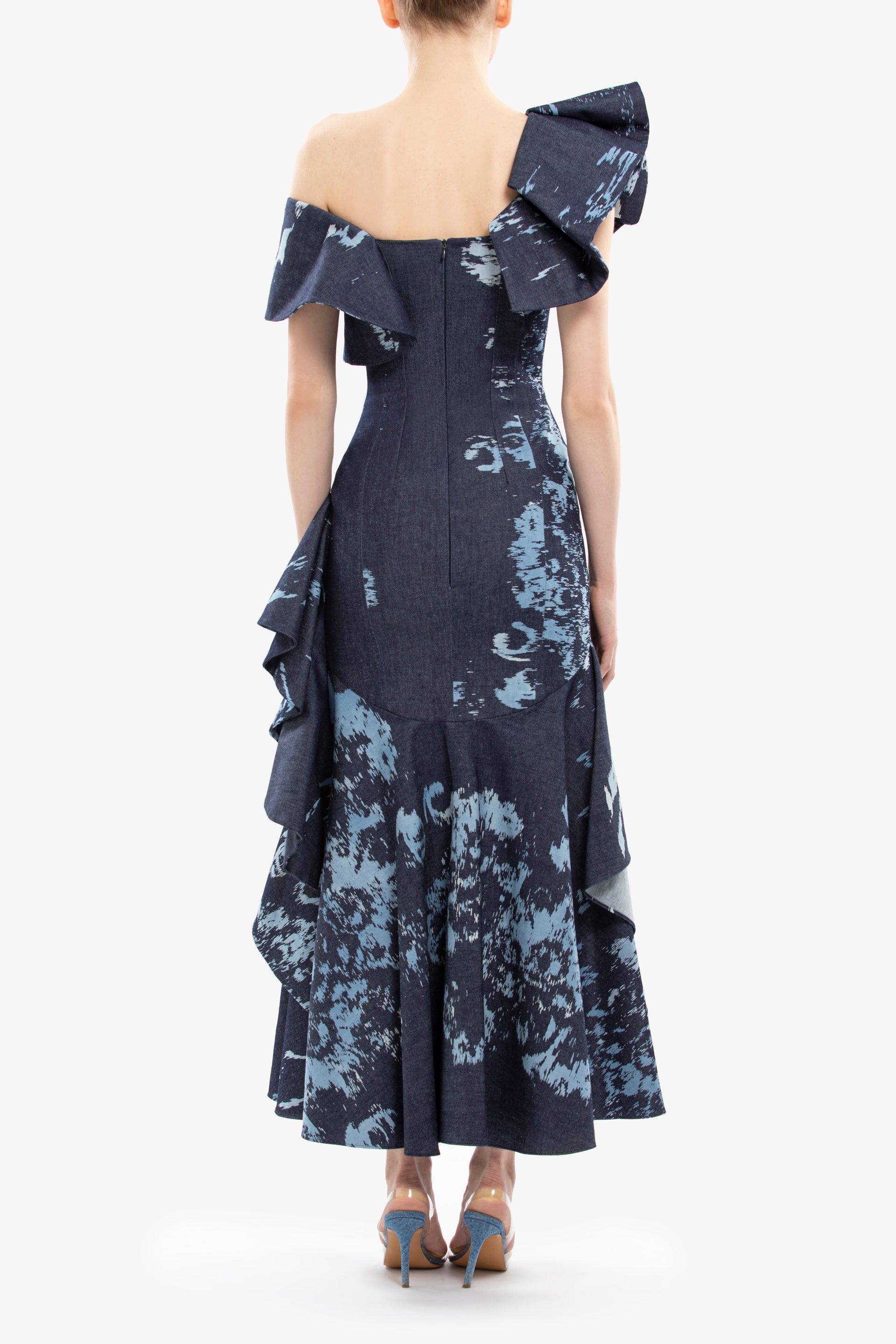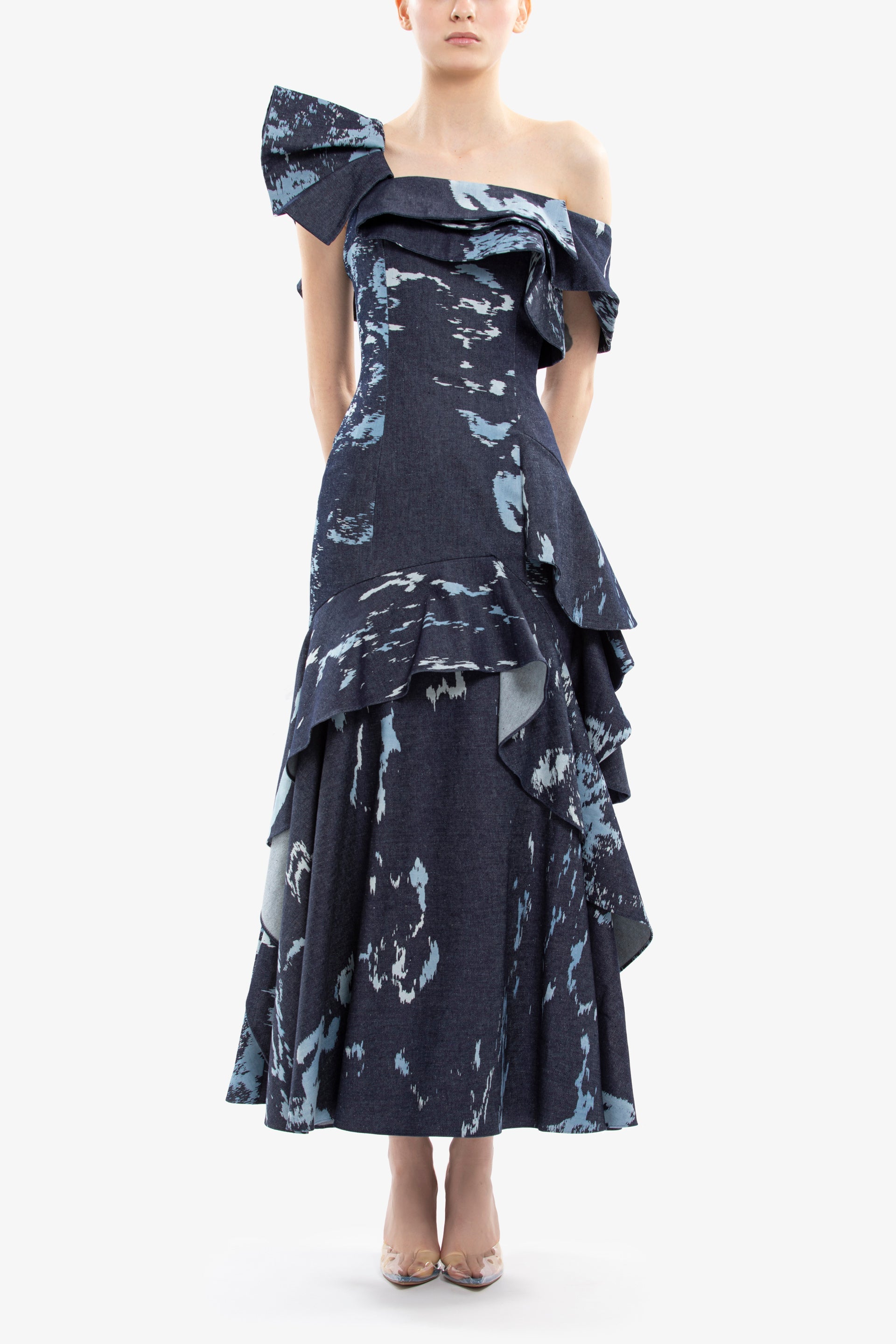 Printed midi denim dress featuring a layered ruffled design and a chic one-shoulder silhouette.
