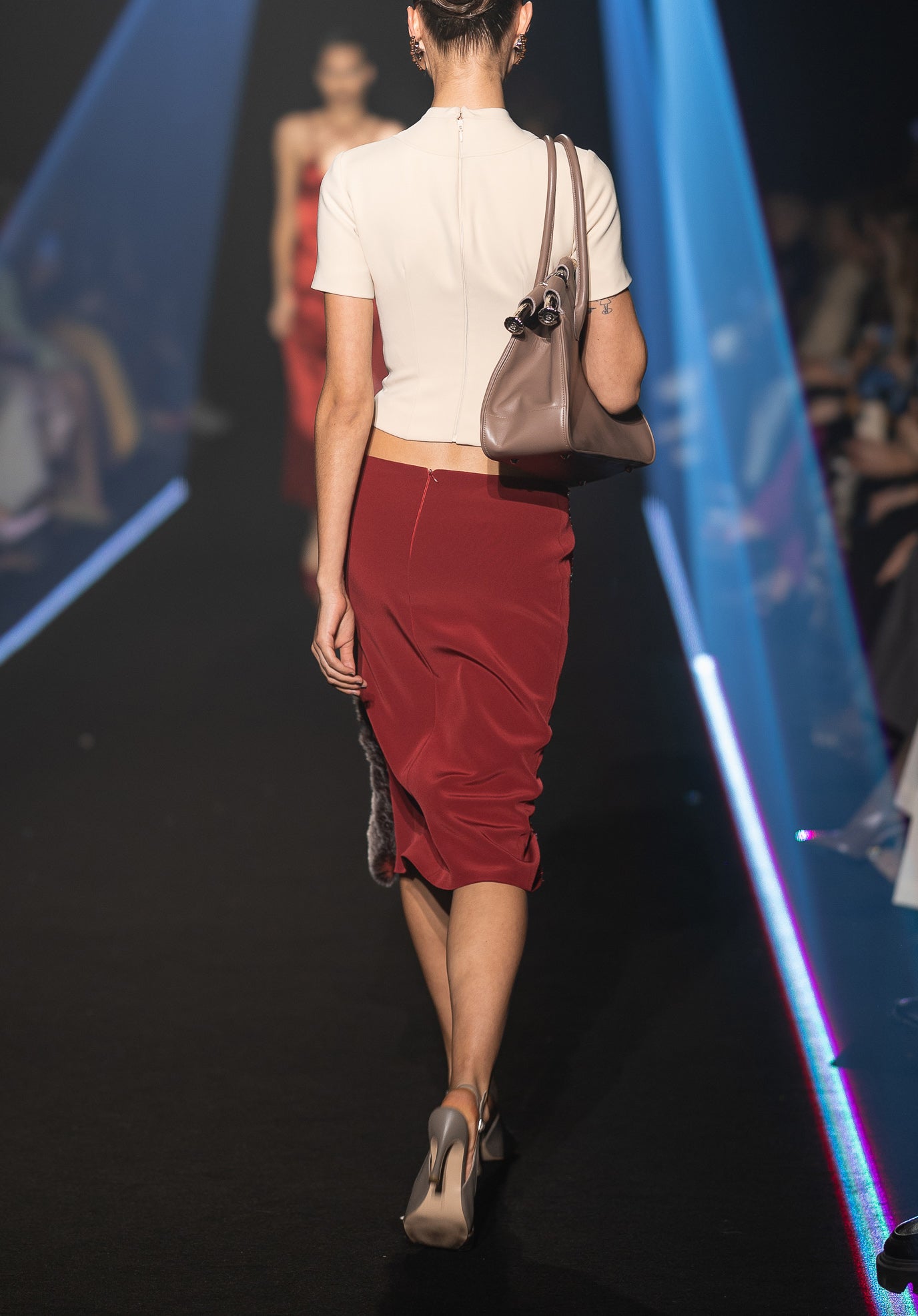 - Silky satin skirt complemented with a soft-haired faux fur panel along the striking slit and complete with double-striped pearl borders that evoke the nostalgic 2000's fashion staples. Low-waisted pencil skirt