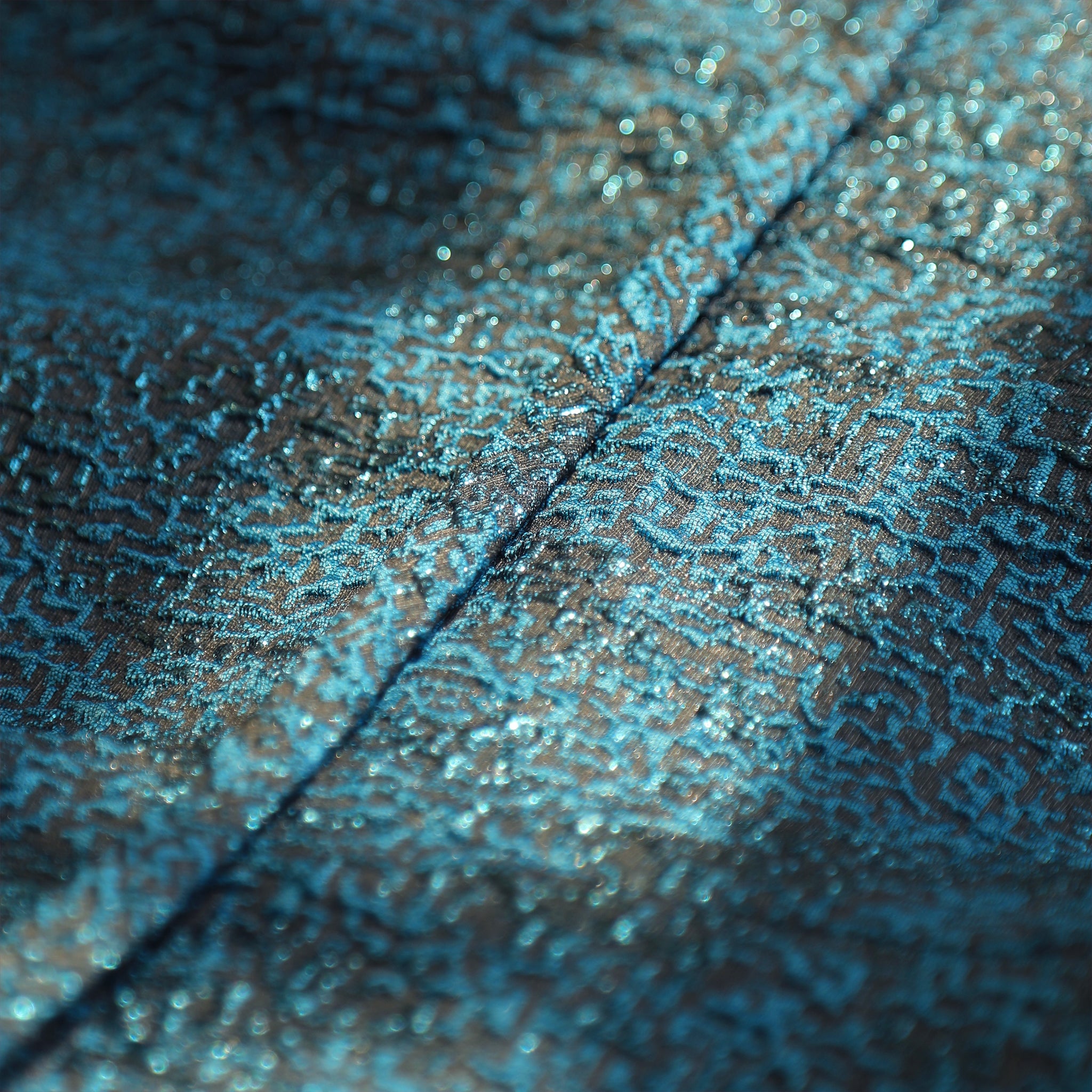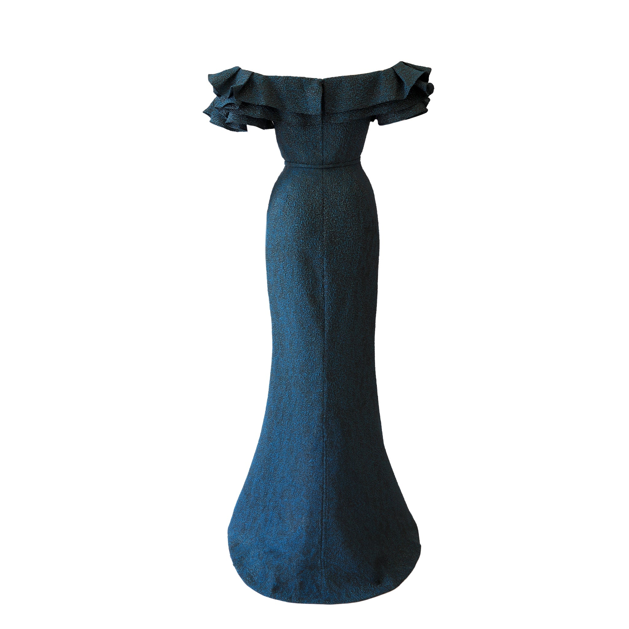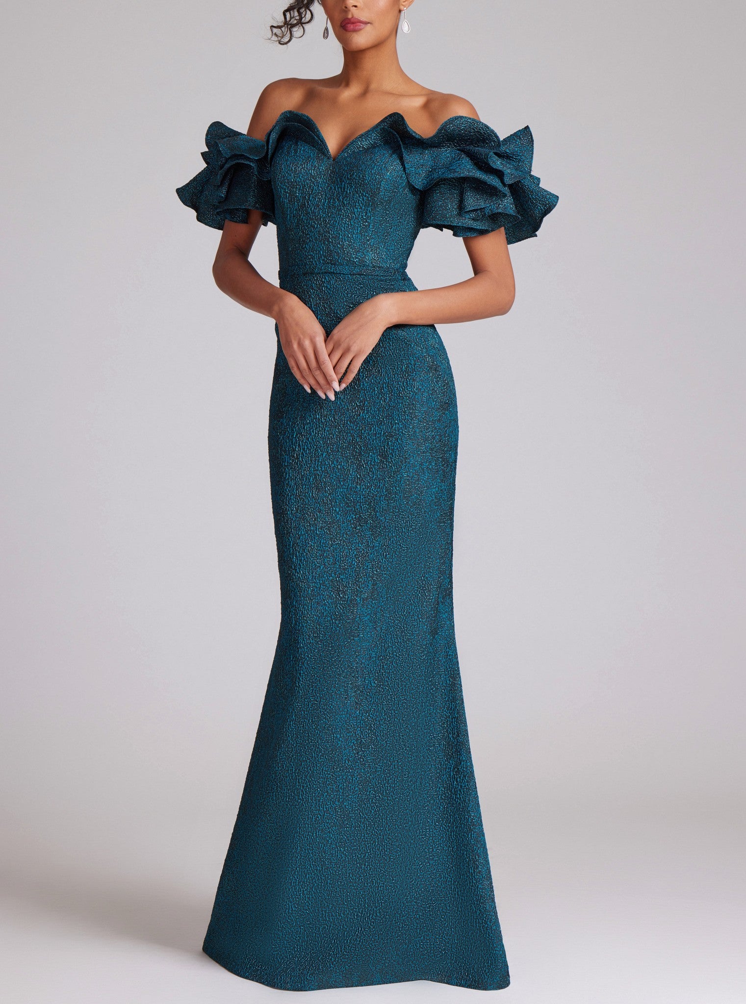 Ruffle Off Shoulder Metallic Jacquard Gown