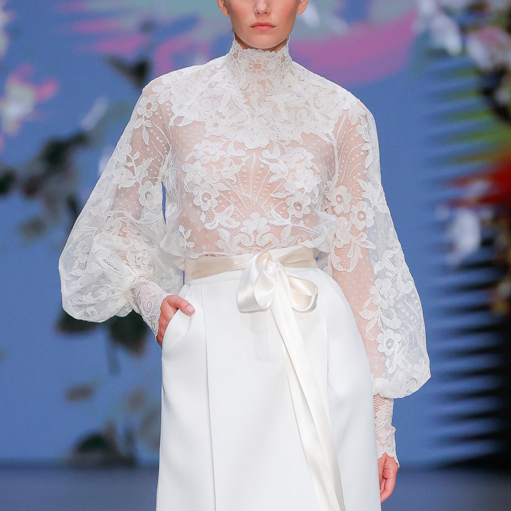 The satin lace pairs beautifully with high-waisted bottoms or tailored trousers. Add pearl or diamond studs, a nude camisole, and a jeweled headband for a bridal or formal look. Keep makeup soft and style your hair in a sleek bun or loose waves.