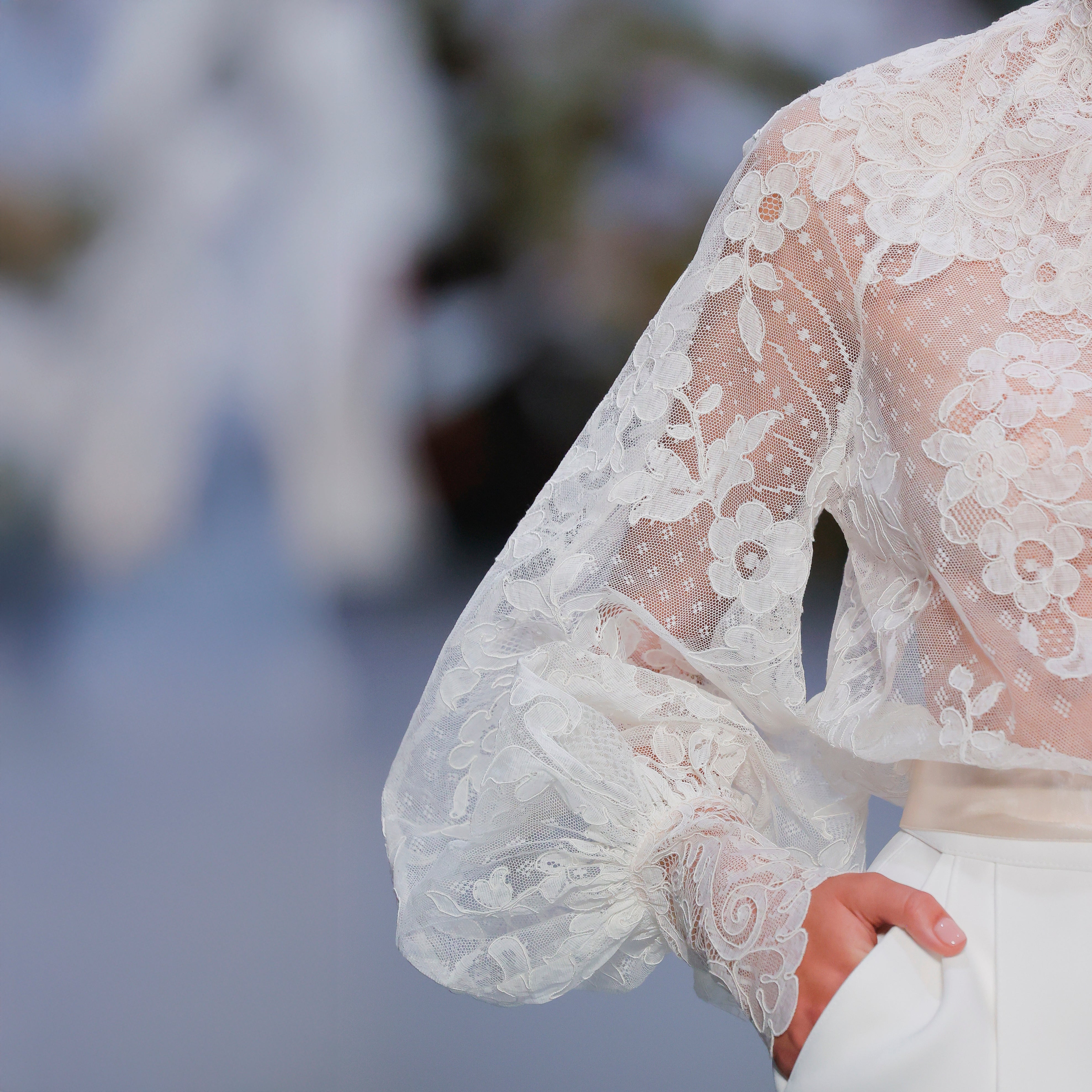 • Silhouette: High neckline, long balloon sleeves, and scalloped cuffs