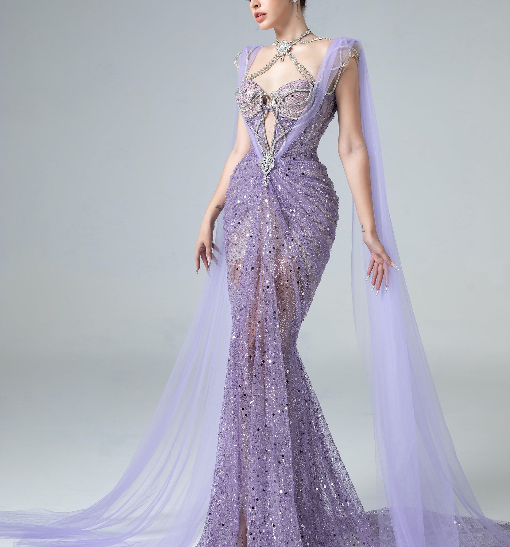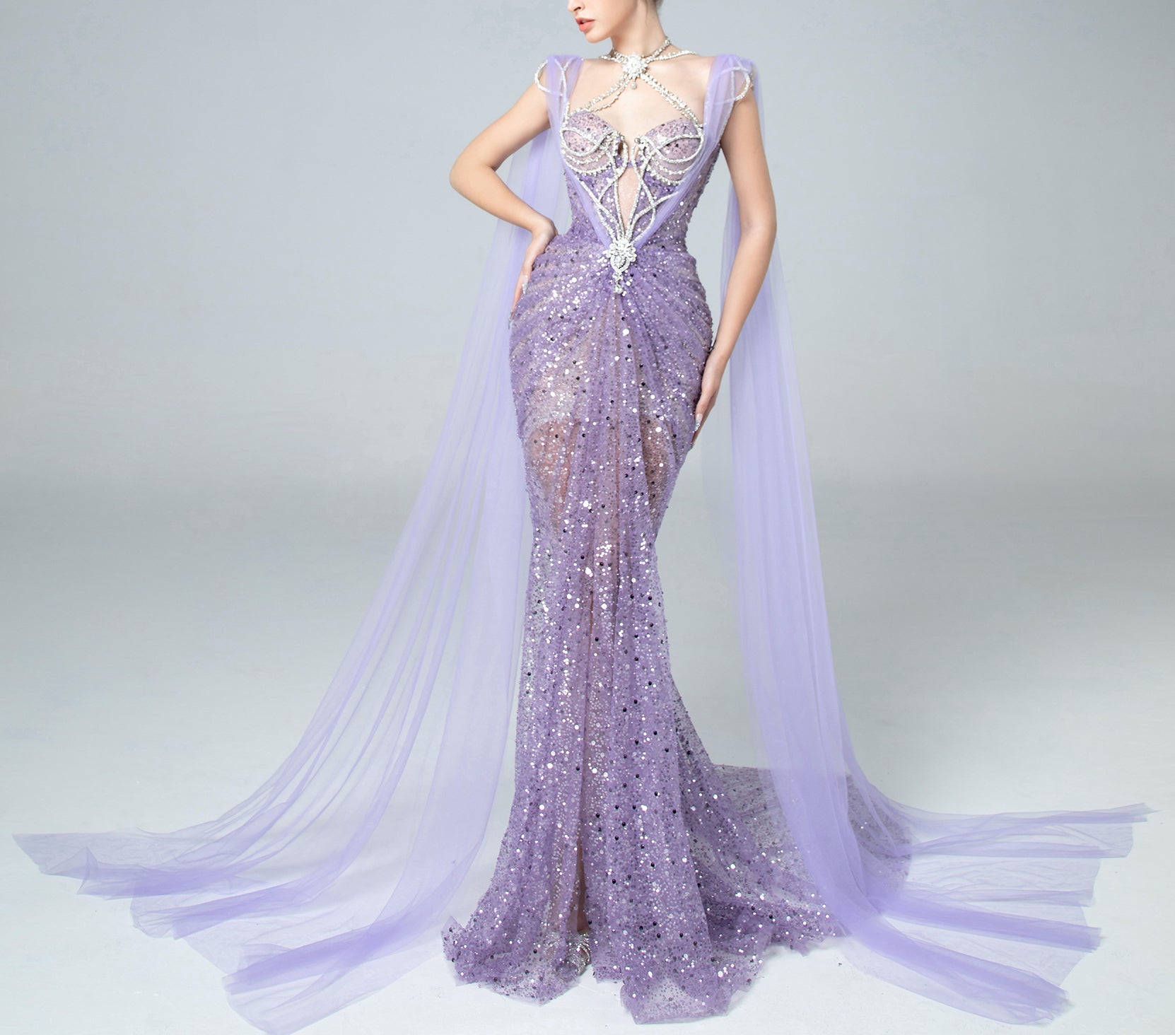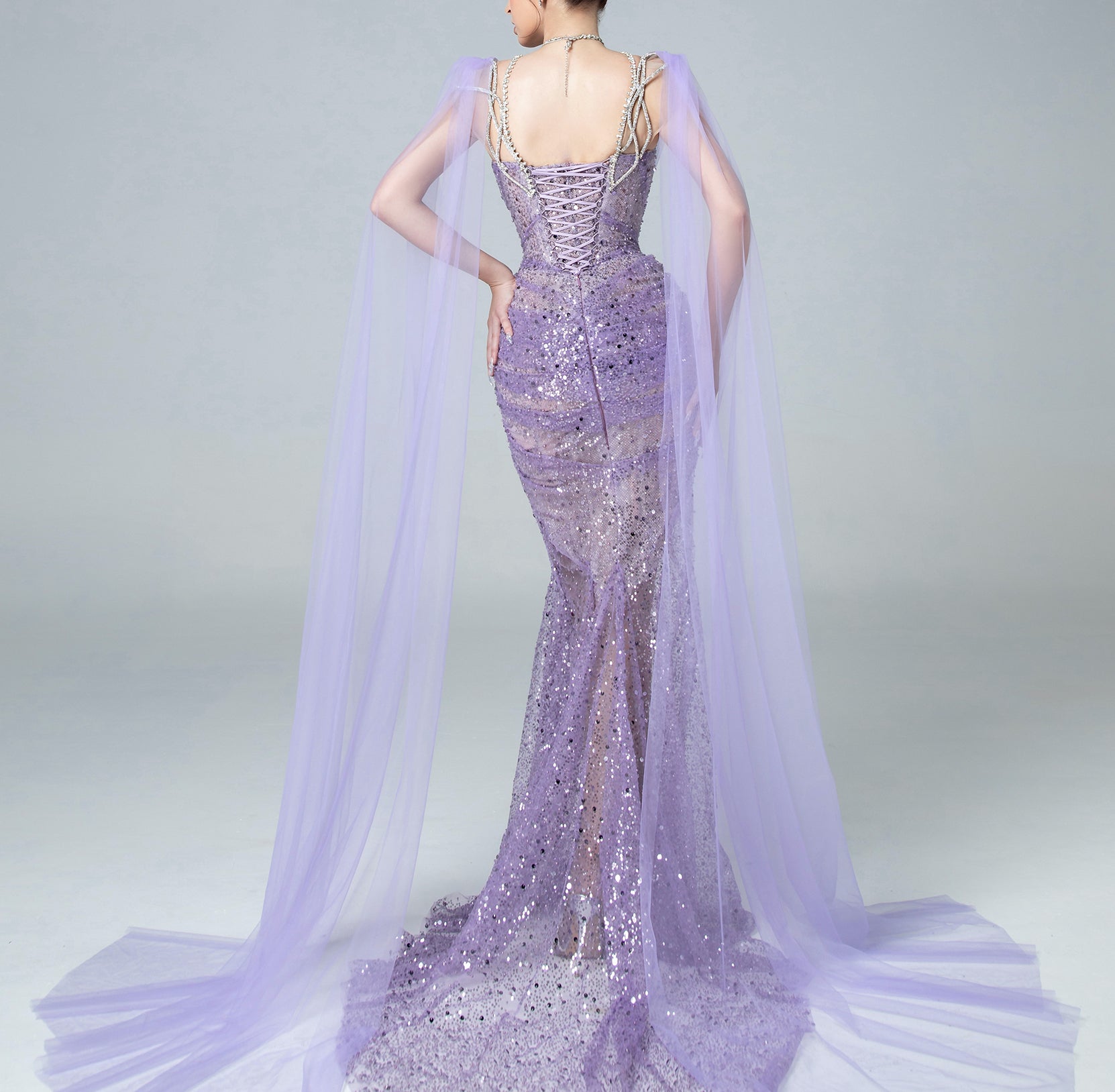 - Silhouette: Mermaid-Style With A Fitted Bodice And Cascading Sheer Cape